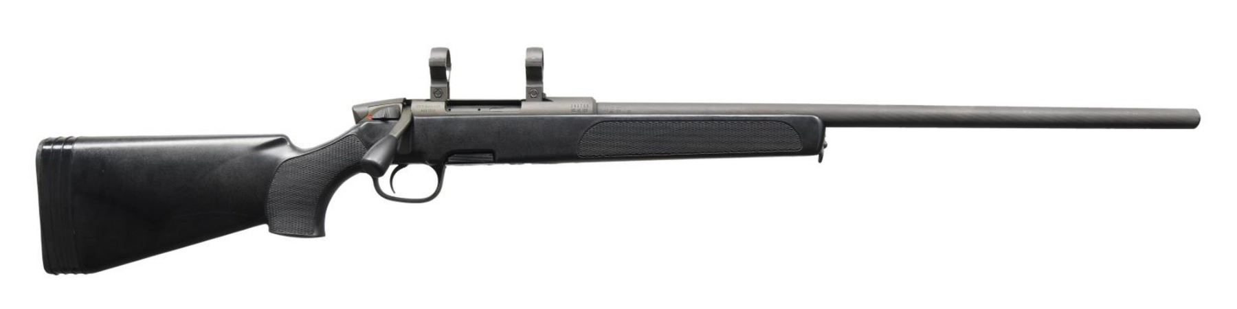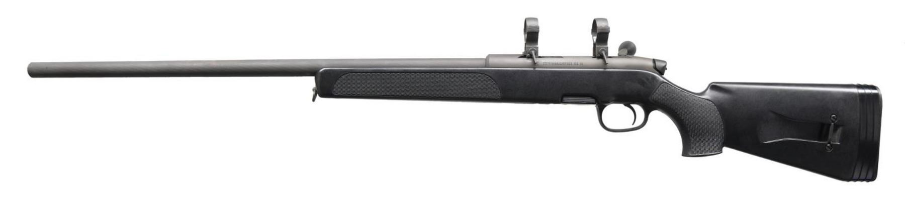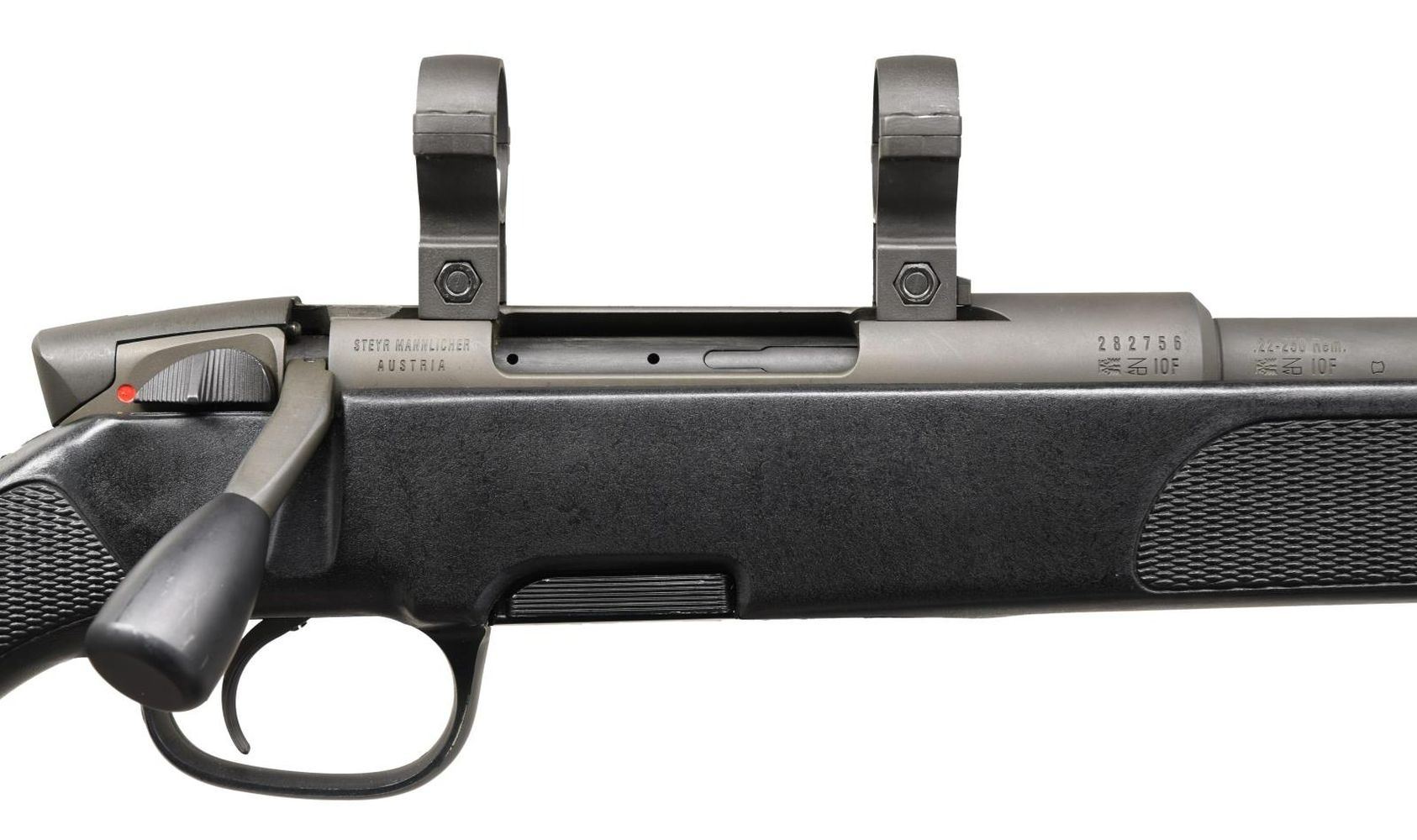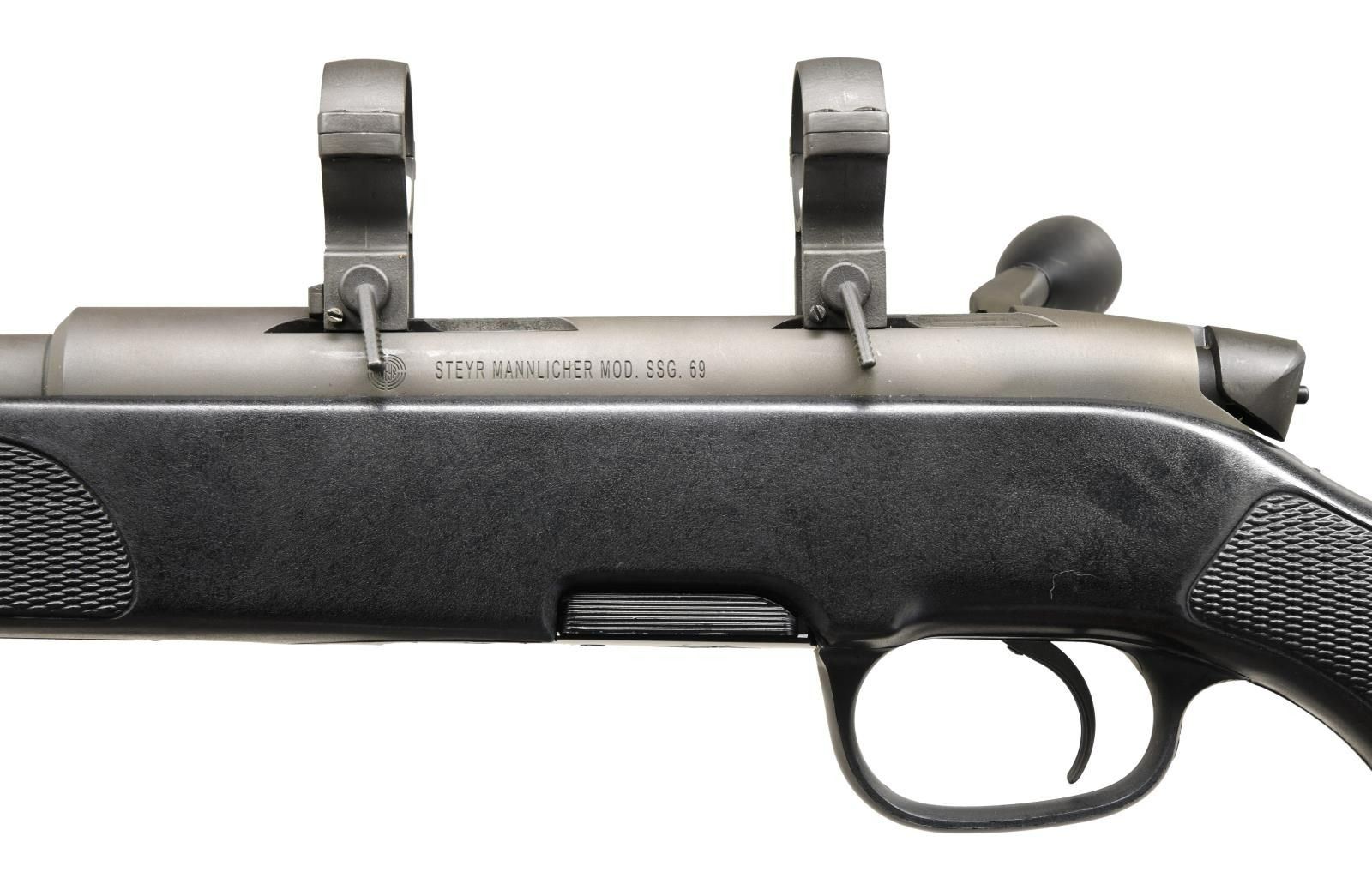 Cal. 22-250 Rem. S# 282756. Bbl. 25 1/2". SSG 69 bolt action rifle mfg. by Steyr Mannlicher in Austria and imported by SAI (Steyr Arms) USA of West Point, MS. The right side of the bbl. is marked with the cal. designation above Austrian proofs, with "STEYR/ MANNLICHER/ AUSTRIA", the S#, and additional Austrian proofs present on the right side of the receiver. Left side of receiver exhibits the Steyr logo followed by "STEYR MANNLICHER MOD. SSG. 69". Matte gray parkerized finish with a 1 piece checkered black polymer pistol grip buttstock, featuring adjustable recoil pad plates. Receiver is mounted with two 30mm quick detach scope rings. MAGS: 1-5 rd. CONDITION: metal components retain the majority of their original factory finish, exhibiting a couple scattered areas of wear and some scattered superficial marks from handling and storage. Mirror bore, exhibiting well defined rifling throughout. Black polymer buttstock shows some scattered marks from handling and storage, but is otherwise very good overall. PROVENANCE: The Collection of Gun Sport Ltd owned by Jon R. Thomas. (23-3691/MLW). MODERN. $1,000-1,500.