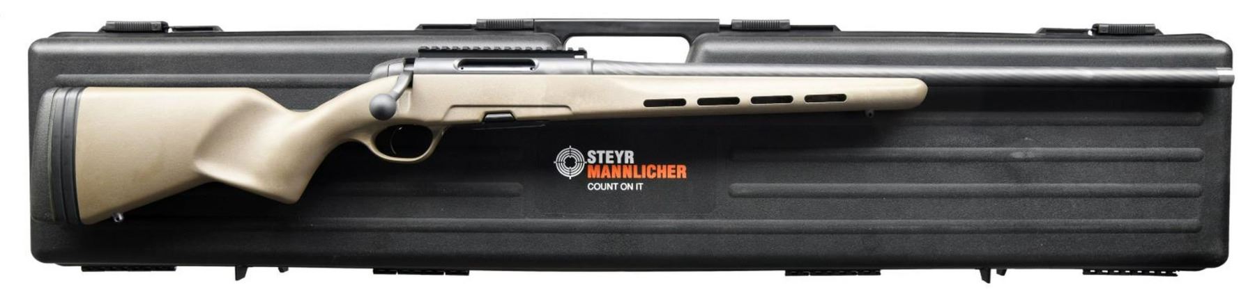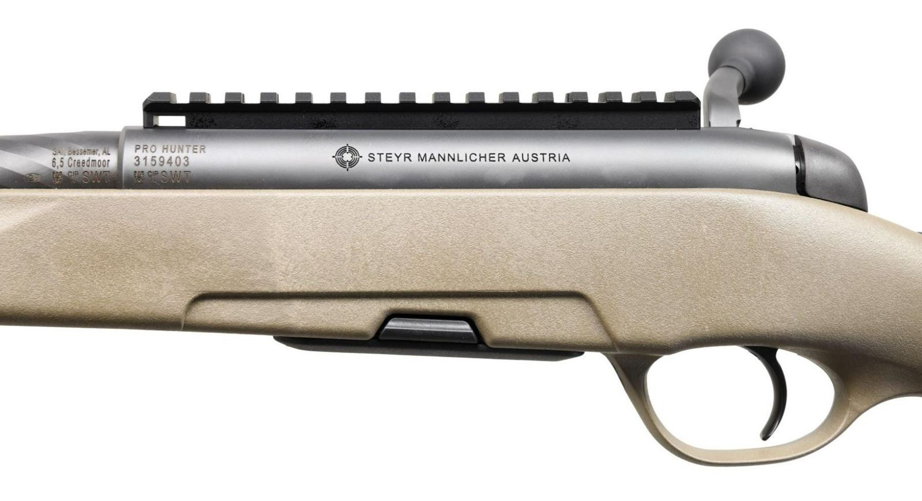ACTION RIFLE WITH FACTORY CASE & SHIPPING BOX. Cal. 6.5 Creedmoor. S# 3159403. Bbl. 25 1/2". Pro Hunter heavy barrel bolt action rifle mfg. by Steyr Mannlicher in Austria and imported by SAI (Steyr Arms) of Bessemer, AL. The left side of the heavy twist bbl. is marked with SAI's importer information above the cal. designation and Austrian proofs at the breech, followed by the model designation, S#, Austrian proofs, and "(STEYR LOGO) STEYR MANNLICHER AUSTRIA" on the left side of the receiver. Metal components exhibit a matte gray finish. 1 Piece olive polymer pistol grip stock with adjustable recoil pads. Threaded muzzle with grooved muzzle nut cap. Receiver is mounted with a black anodized aluminum picatinny rail. MAGS: 1-4 rd. UNATTACHED ACCESSORIES: shipping box and factory hard case. CONDITION: near new, with metal components retaining virtually all of their original factory finishes overall. Mirror bore, exhibiting sharp and well defined rifling throughout. Polymer stock is excellent. Factory hard case is excellent. Shipping box shows exterior wear from handling and storage, but otherwise remains sturdy and serviceable. PROVENANCE: The Collection of Gun Sport Ltd owned by Jon R. Thomas. (23-3548/MLW). MODERN. $1,000-1,500.