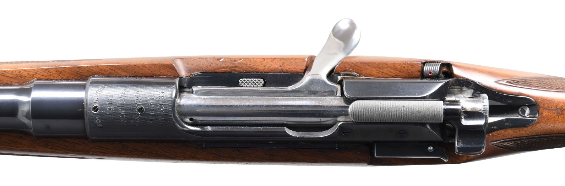 RIFLE. Cal. 30-06. S# 31312. Tapered 22" barrel appearing to have 1960 Austrian Nitro proofs. Ramp mounted blade front sight & 2 leaf express rear sight. Standard MS action with additional drilled plug screws on receiver bridge & left side receiver through markings. Single trigger. Walnut checkered stock with sling swivels, black plastic grip cap, additional stippling & checkering at forearm along with Pachmayr black ventilated pad. CONDITIION: rifle has very good reblued metal finish with scattered spots of oxidation & scratches. Good wood finish with numerous scratches & marks. Good bore with strong rifling & light pitting. (24-6928/MD). CURIO. $700-1,000.