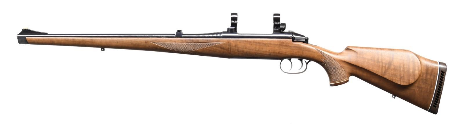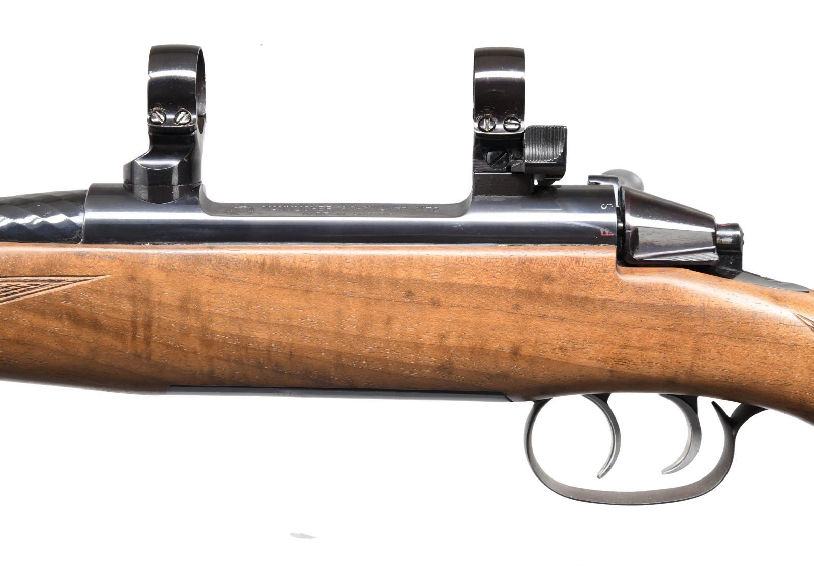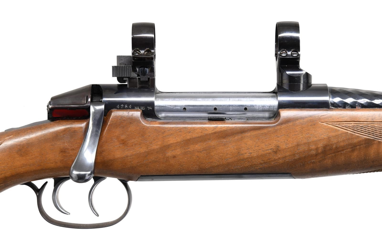 Cal. 270 Win. S# 4264. Bbl. 20". Mannlicher-Schoenauer M72 bolt action rifle mfg. in Austria by Steyr and imported by L.E.S. in 1974. Left side of bbl. is marked with L.E.S.'s importer information and the cal. designation, with "ONORMM3170STLF3" stamped on the right. Left side of receiver is stamped with the Steyr logo followed by "MANNLICHER SCHONAUER M72/ MADE IN AUSTRIA" on the top of the receiver wall, with the S#, Austrian proofs, and the 2-digit year of mfg. "74" stamped on the right side of the receiver at the rear (which are also present on the right side of the bbl.). Metal components exhibit a lustrous blue finish overall. Checkered wood Mannlicher, Monte Carlo, pistol grip buttstock with Steyr logo brown rubber recoil pad. Ramped German silver blade front sight. Rear sight has been replaced with a slot blank. Spoon handle bolt with double set triggers CONDITION: excellent, with metal components retaining bountiful amounts of their original factory blue finish, exhibiting few light superficial handling marks overall. Brilliant mirror bore, exhibiting well defined rifling throughout. Stock exhibits a few minor marks from handling and storage, but is otherwise very good overall. (24-1600/MLW). CURIO. $800-1,200.