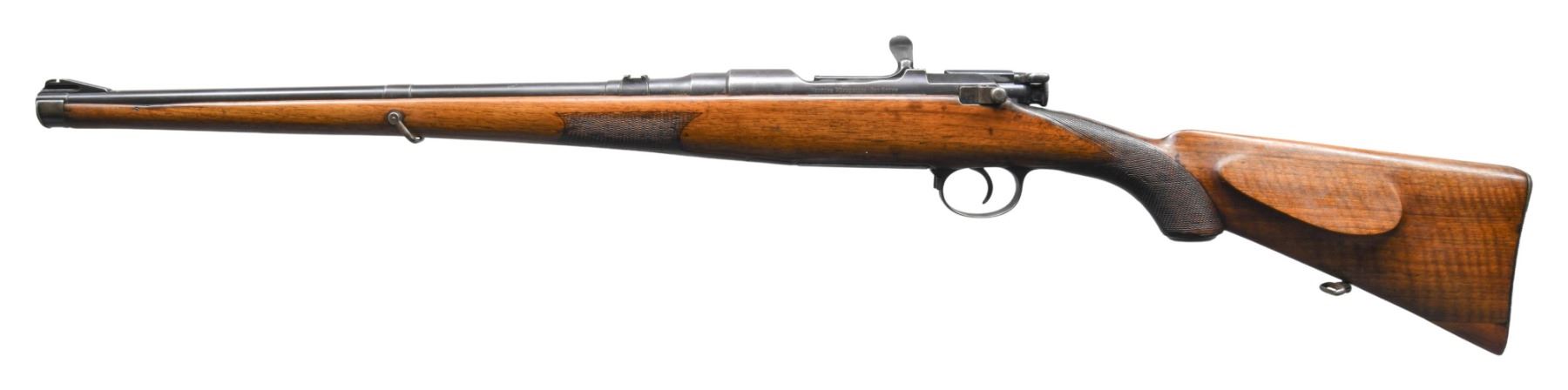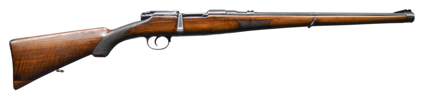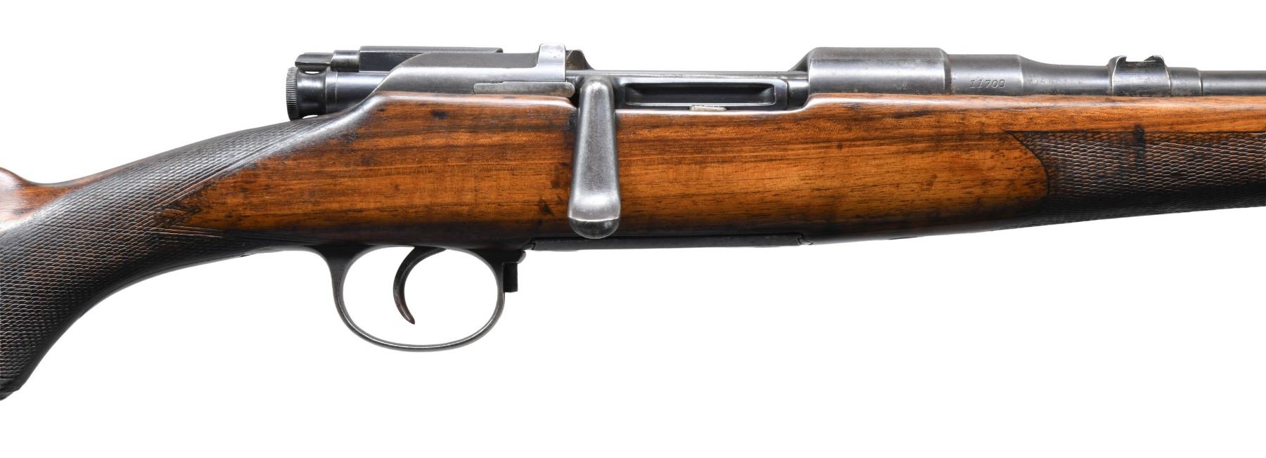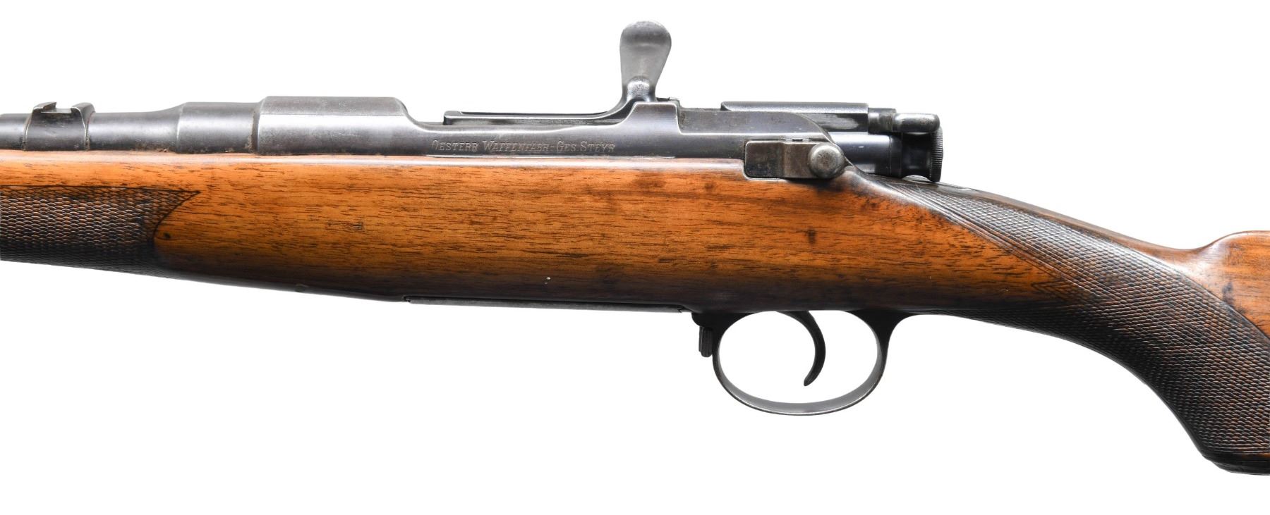 ACTION RIFLE. Cal. 8x56mm MS. S# 11700. Bbl. 20". Top of the bbl. is marked "SPECIALLY MADE FOR CHAS. A. HEYER & CO.", with the S# marked on the right towards the breech. Top of receiver is marked "Patent/ Mannlicher/ Schoenauer/ M1908" within a matted panel, with "OESTERR WAFFENFABR.-GES.STEYR" marked on the left receiver wall. Metal components exhibit a blue finish overall. 1-piece full length Mannlicher stock features a blued steel nose cap, checkered panels at the forearm and wrist, and a cheekpiece on the left side of the butt. Pale handle front sling loop with hinged sling loop on toeline of butt. Grooved steel trapdoor buttplate, with 3-rnd. cartridge provision. Bottom buttplate screw is absent. Detachable rotary mag. Butterknife bolt handle (with grooved section on rear). Non-functional takedown style lever on front of trigger guard. Ramped front sight band mounted dovetailed rear sight are absent. Bolt is serial # "20269" on the rear of the handle. Bolt shroud is matching to the bolt via "69". Trigger guard is numbered "21564" on the interior. CONDITION: metal components retain fair to good amounts of their original factory blue finish, showing areas of wear and thinning fading to gray patina, with light to mild surface oxidation present overall. Heavily pitted bore retains fair rifling throughout. Trigger will pull when safety is engaged and fires when safety is disengaged. Stock shows moderate finish and checkering wear, with a large repair present at the toe. Interior of stock is cracked between the trigger and mag. cut outs. (25-5018/MLW). CURIO. $800-1,200.