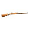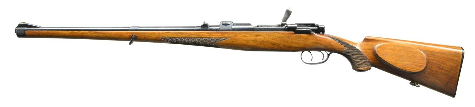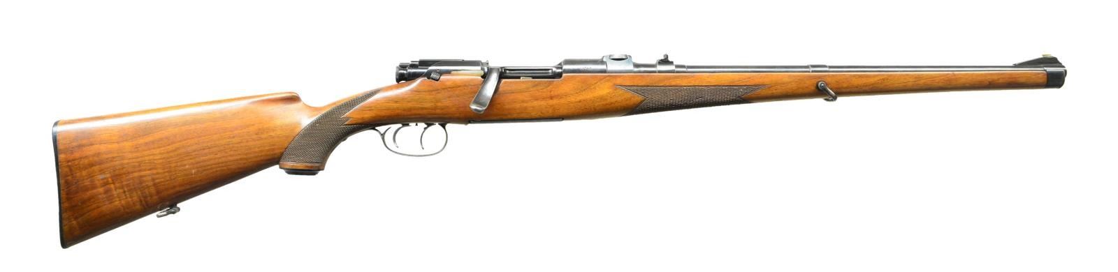 Cal. 270 Win. S# 32149. Made for the European market, this rifle does not have any Stoeger import markings. The 20" bbl. fitted w/ original front & rear sights also has sleeved on front claw base. Typical late action w/ side safety, swept bolt handle & dummy sideplate for scope mount is fitted w/ dbl. set triggers. Receiver ring is marked "Made in Austria" & w/ Mannlicher Schoenauer information, "MOD GK" & cal. Styer markings are on left sidewall. Left bridge is fitted w/ scope mounting base. Capped pistol grip full length stock of lightly figured European walnut measures 14" over ribbed hard rubber buttplate. Stock features traditional shadowline righthand cheekpiece, point pattern checkering, steel muzzle cap & sling loops. CONDITION: fine to very fine. Metal retaining over 85% original blue w/ silvering on sharp edges & some light overall freckling, mostly found on floorplate. Stock retains nearly all of its original oil finish w/ some light marks. Checkering is lightly worn & dark. Bore is bright & shiny. Mechanically crisp. (22-1958/MGM). CURIO. $800-1,200.