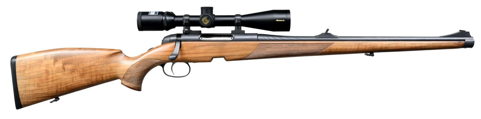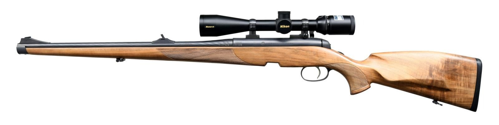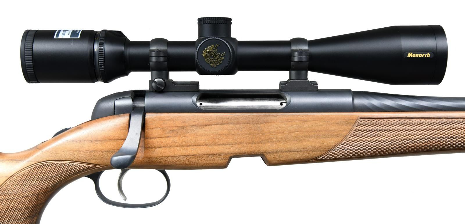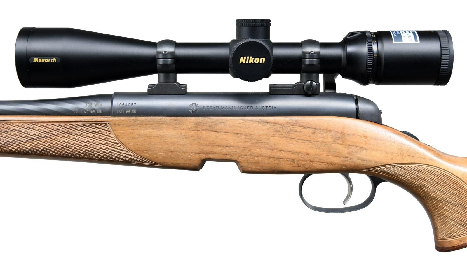 ACTION RIFLE Cal. 308 Win. S# 1064057 (POY = Aug. 2007). Bbl. 19" w/ open sights & "SAI CUMMING GA" import mark. Matte black finish. Nikon Monarch 4-16x42mm w/ long range hunting BDC reticle on Leupold style rings & dual dovetail bases. Full length Mannlicher checkered walnut stock w/ rosewood grip cap, sling swivels, left side cheekpiece & black recoil pad. MAGS: NONE. UNATTACHED ACCESSORIES: manuals & guarantee card. CONDITION: Near excellent metal & wood finish. Bore is bright & shiny w/ light fouling on lands. Scope finish near excellent w/ clear & serviceable optics. (23-2185/MD). MODERN. $1,000-1,500.