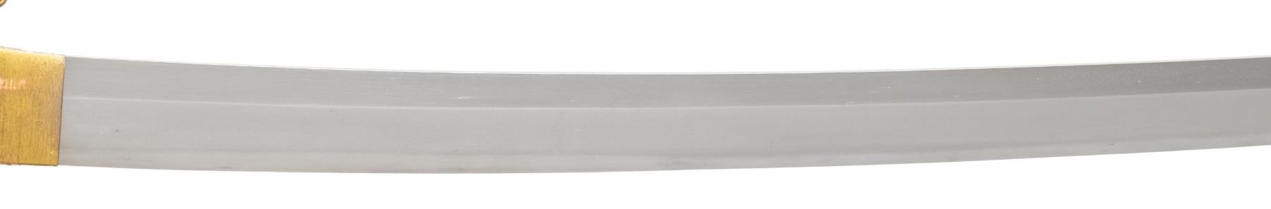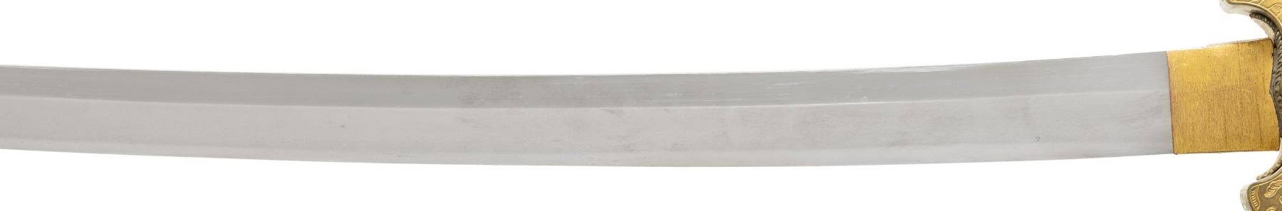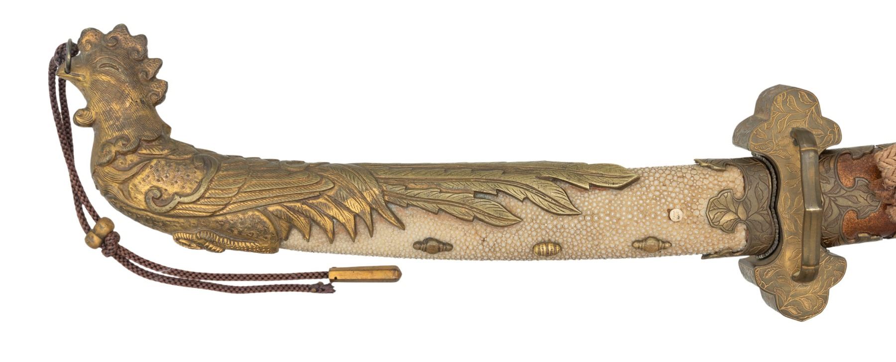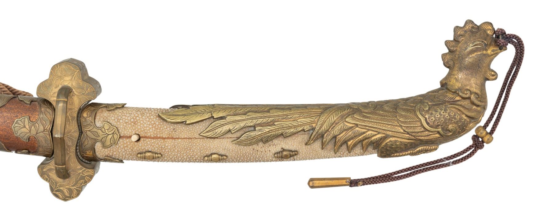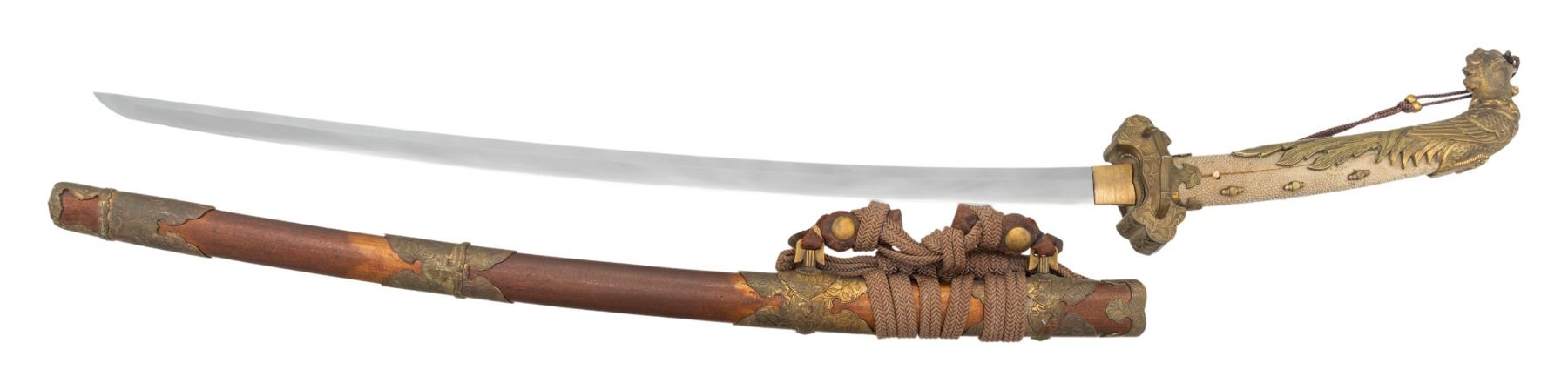 This ornate decorative tachi measures 40 1/2" overall with a 27 1/2" blade showing a straight hamon and a gilded brass habaki. In place of the normal tsuba is a brass guard of a semi western style with engraved foliate decoration and a pointed bracket on each side. There is one seppa above and below the crossguard. The nakago has a two character signature on one side and a single mekugi-ana. The tsuka has an engraved fuchi that matches the motif of the crossguard. The top of the tsuka is covered with a huge heavy 9 1/2" gilded brass phoenix. There are three gilded bronze studs on each side of the tsuka. There is no tsuka-ito. The wooden saya has five matching engraved mounts similar to the crossguard and fuchi. Tan full sageo with coordinated brass studs on the leather. CONDITION: Blade has a superior polish. Tsuka and saya both show light wear with no damage. (02-25812/BF) $3000-5000.