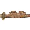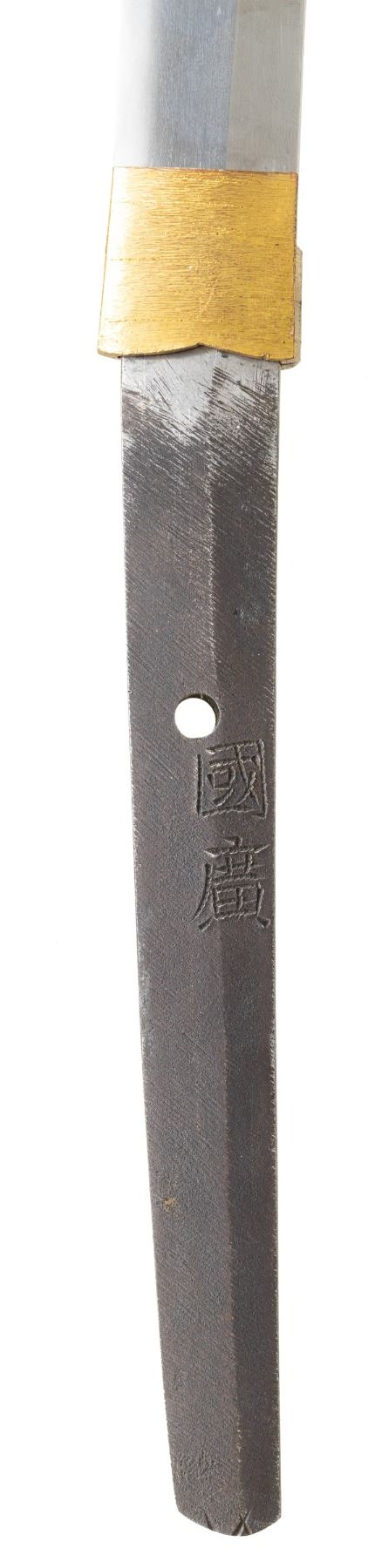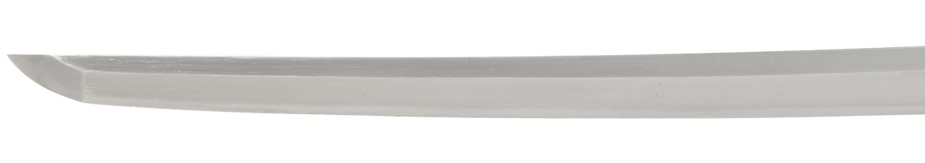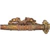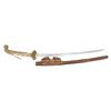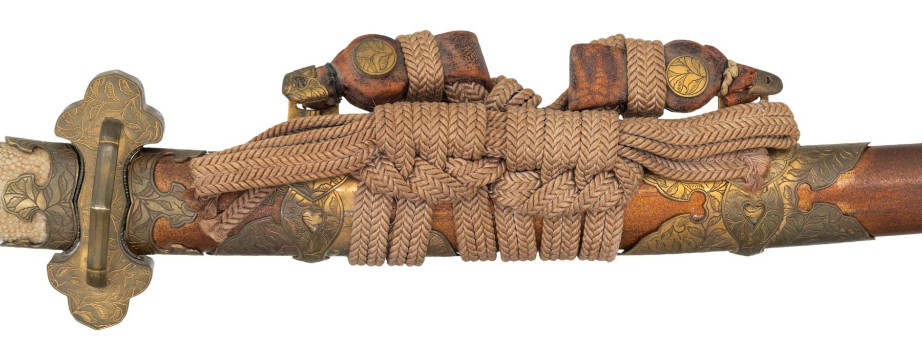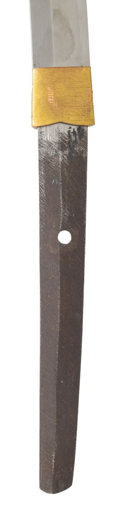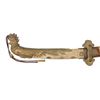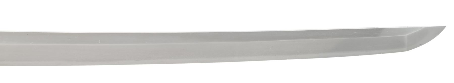 This ornate decorative tachi measures 40 1/2" overall with a 27 1/2" blade showing a straight hamon and a gilded brass habaki. In place of the normal tsuba is a brass guard of a semi western style with engraved foliate decoration and a pointed bracket on each side. There is one seppa above and below the crossguard. The nakago has a two character signature on one side and a single mekugi-ana. The tsuka has an engraved fuchi that matches the motif of the crossguard. The top of the tsuka is covered with a huge heavy 9 1/2" gilded brass phoenix. There are three gilded bronze studs on each side of the tsuka. There is no tsuka-ito. The wooden saya has five matching engraved mounts similar to the crossguard and fuchi. Tan full sageo with coordinated brass studs on the leather. CONDITION: Blade has a superior polish. Tsuka and saya both show light wear with no damage. (02-25812/BF) $3000-5000.