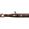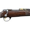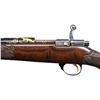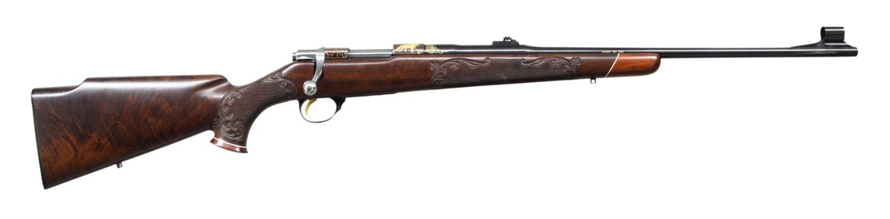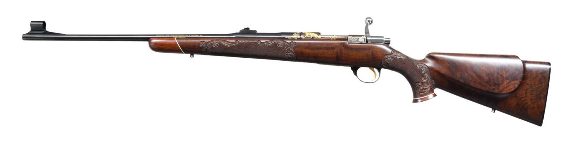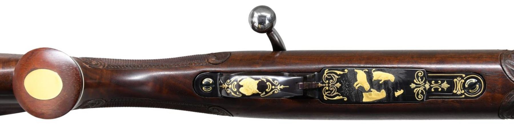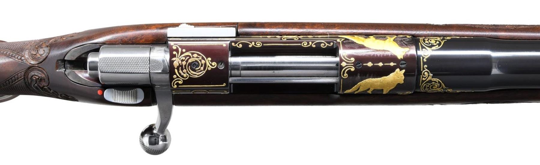 ACTION RIFLE. Cal. 222 Rem. S# 519Z75. Special Browning Custom Shop rifle mfg in Belgium in 1975. Receiver, floorplate, trigger guard and breech end of bbl. have exquisite raised gold inlay. The front receiver ring depicts 2 coyotes with 4 prairie dogs on the floorplate and a bobcat portrait on the trigger guard bow. The scenes are surrounded and highlighted by gold inlay scroll and straight line borders. The gold filled S# is on the right side of the rear receiver ring and the master engraver's signature "Jose Baerton" is found on the left side. Monte Carlo cheekpiece stock of oil finished exhibition grade thin shell walnut. The stock's dark color is accented by orange tones found throughout the striking burl & fiddle figure. The fine hand checkering is bordered by deep relief foliate hand carving and circular punch borders. Other features include contrasting wood forend tip and flared grip cap with white line spacers, swivel bases and Browning buttplate. A brass oval presentation plate is located at bottom of the grip cap. Light sporter weight 22 1/2" bbl. Hooded ramp bead front with island mounted folding leaf rear sight. Weight 6 lbs. 9 oz. CONDITION: very fine, appears unfired retaining nearly all original finish, showing only the slightest marks on the stock. Excellent bright bore. PROVENANCE: From the Estate of Jon Thomas. (23-4781/DS). MODERN. $7,000-11,000.