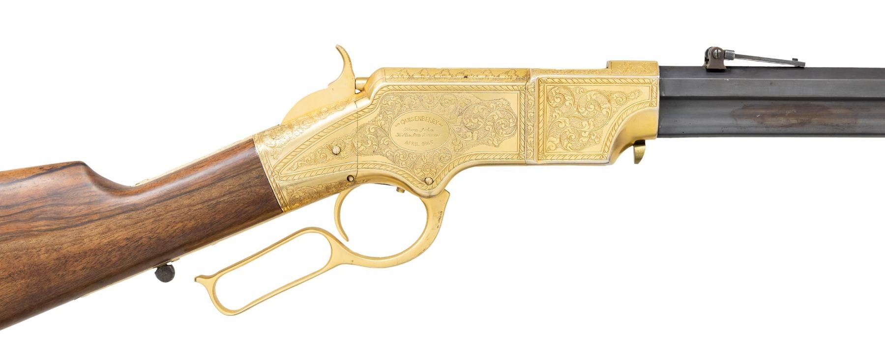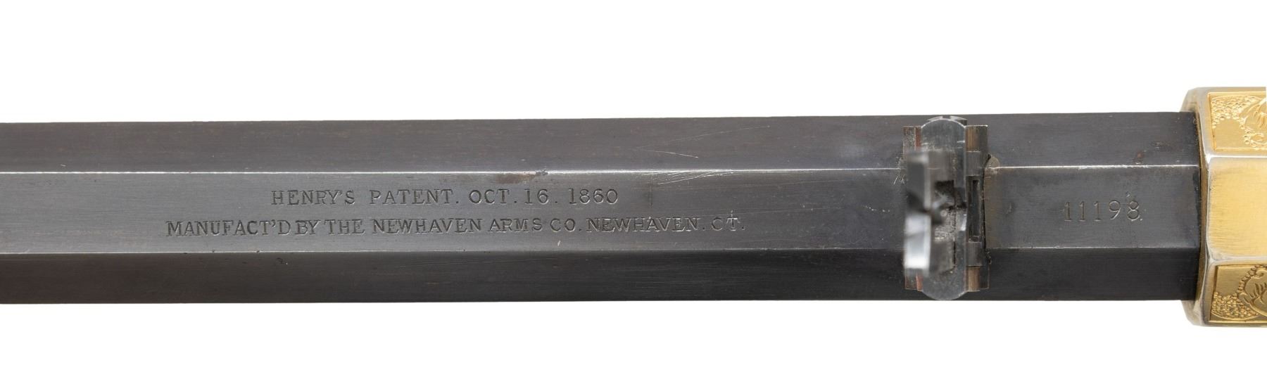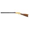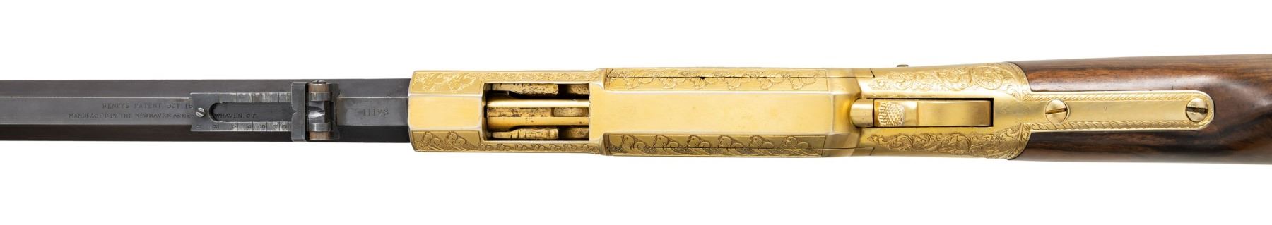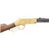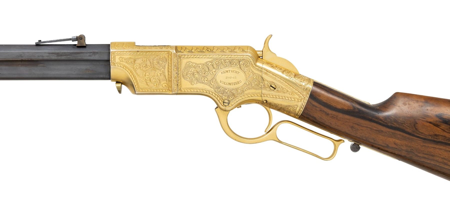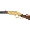 HENRY RIFLE, "KENTUCKY VOLUNTEERS". Cal. 44. S# 11198. This Henry has an original frame, barrel, and buttplate, the butt plate has a mismatched S# 9928. Barrel has been totally refinished and new address and S# engraved, stock is new restoration. The fancy 19th century-style engraving and commemorative presentation are 20th century upgrades. CONDITION: excellent as refinished, engraved, and gold plated. Lever bent and missing part of spur, too short now for small replaced latch to engage. Mechanics fine, crisp rifling with pitting. (01-26883/JS). ANTIQUE. $4,000-7,000.