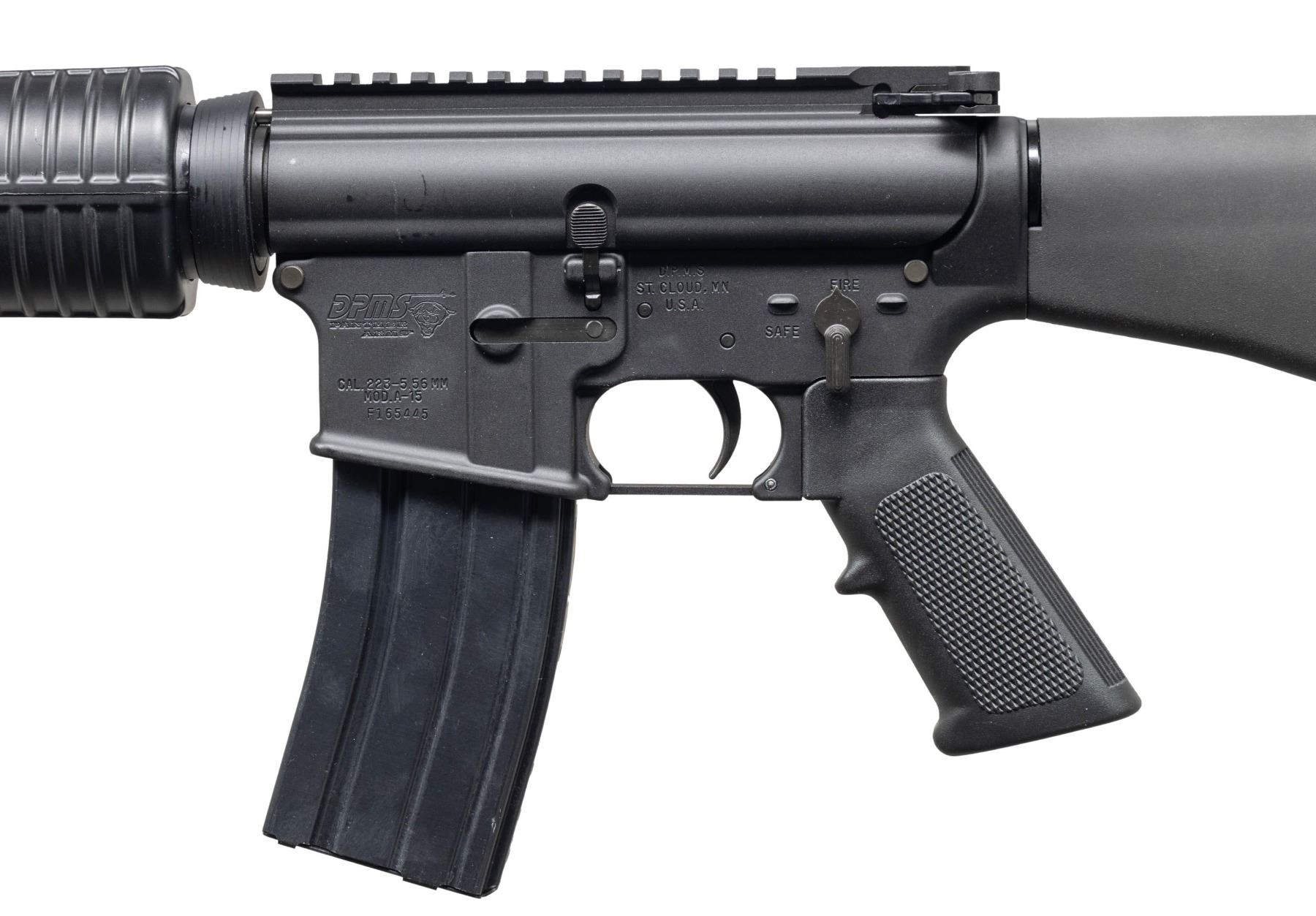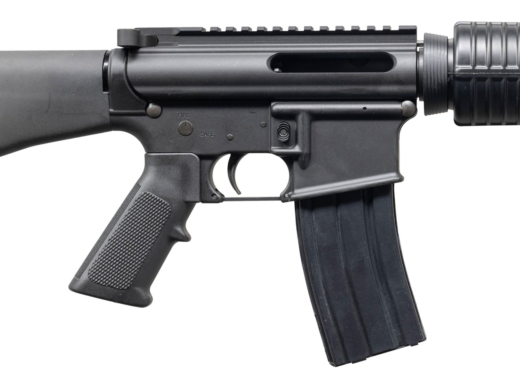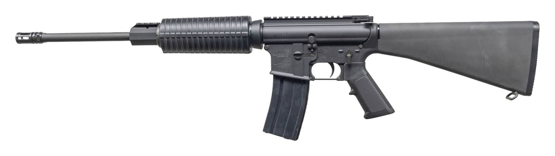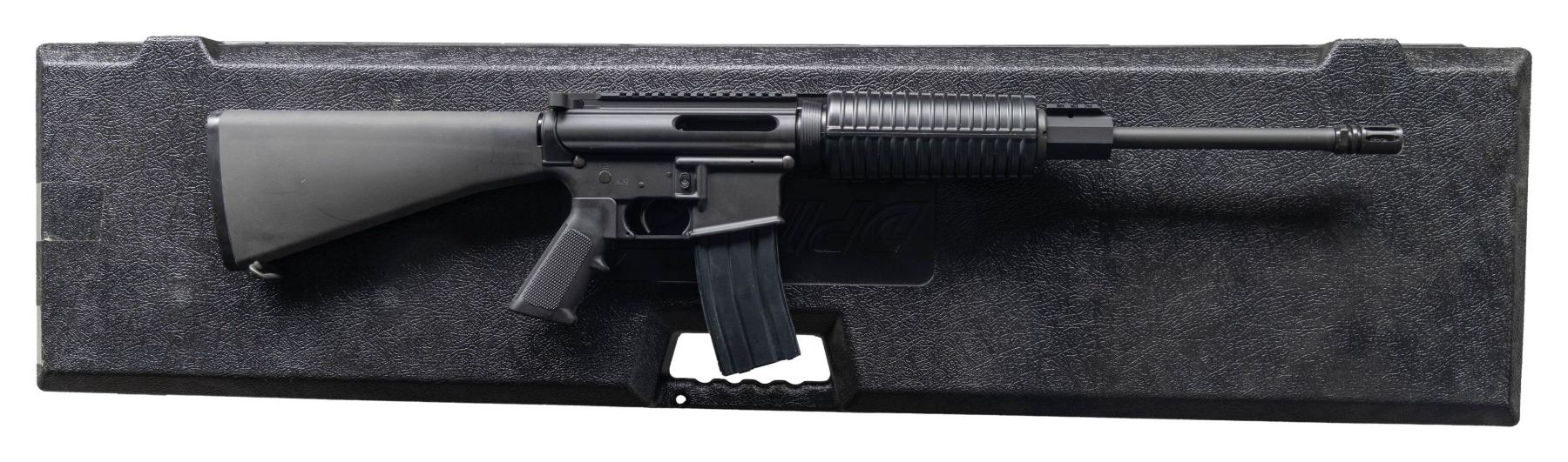 Cal. 5.56x45mm. S# F165445. Bbl. 16". 1:9 barrel threaded muzzle terminated w/ A2 style flash hider. Low profile gas block w/ 1.5" picatinny rail on top. Carbine length fat handguards retained w/ tapered delta ring. Flat top upper receiver w/ no forward assist, dust cover or brass deflector. Full length shoulder stock w/ trap door. Left side controls.. MAGS: 2 aluminum 30 rd. UNATTACHED ACCESSORIES: fitted hard plastic factory transport case, cleaning kit, paperwork. CONDITION: all aspects indicate very little use, if any. No visible blemishing. Bore bright w/ strong rifling. Fire control mechanism appears to function correctly when cycled by hand. (09/10/25/JZ). MODERN. $500-900.