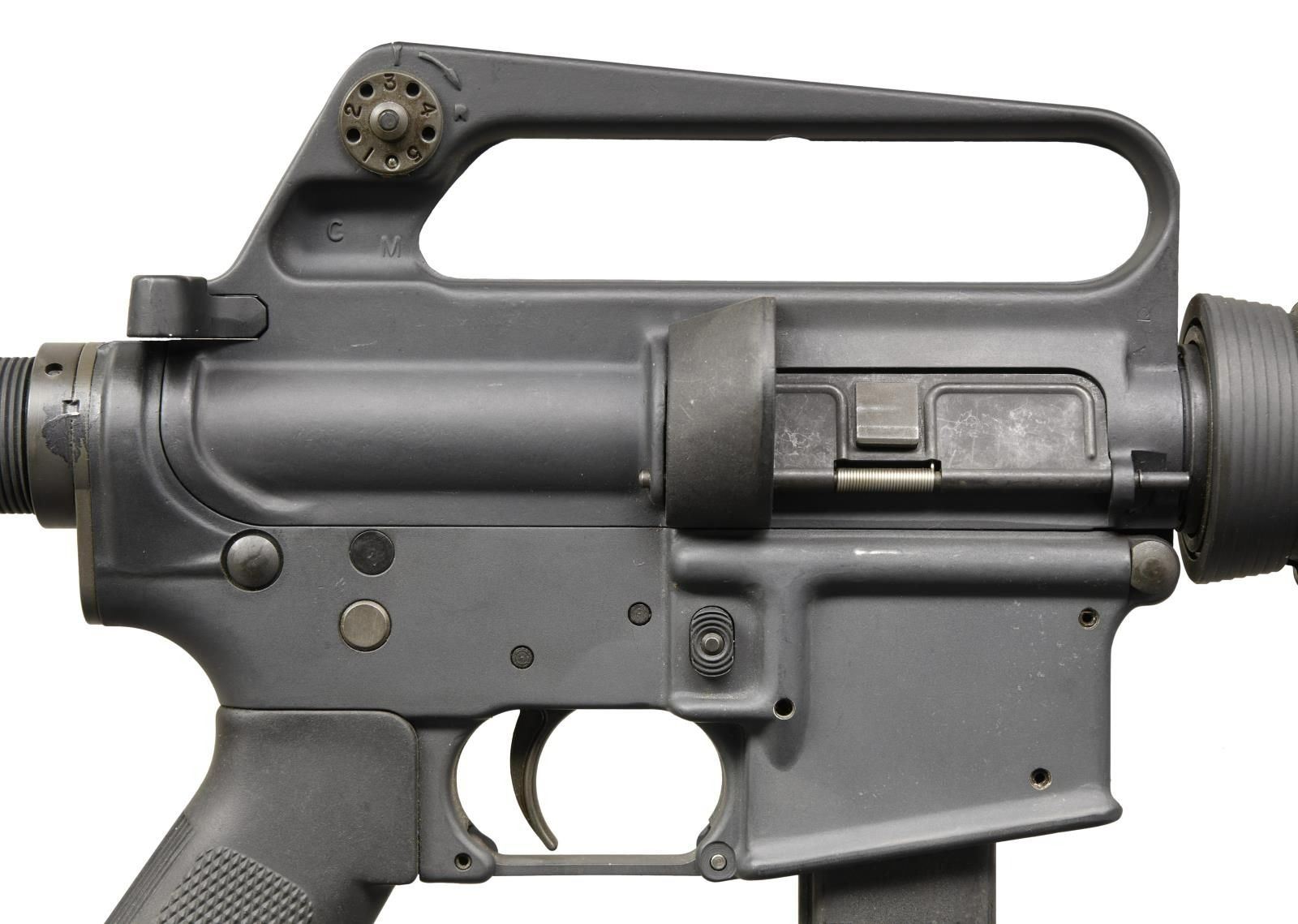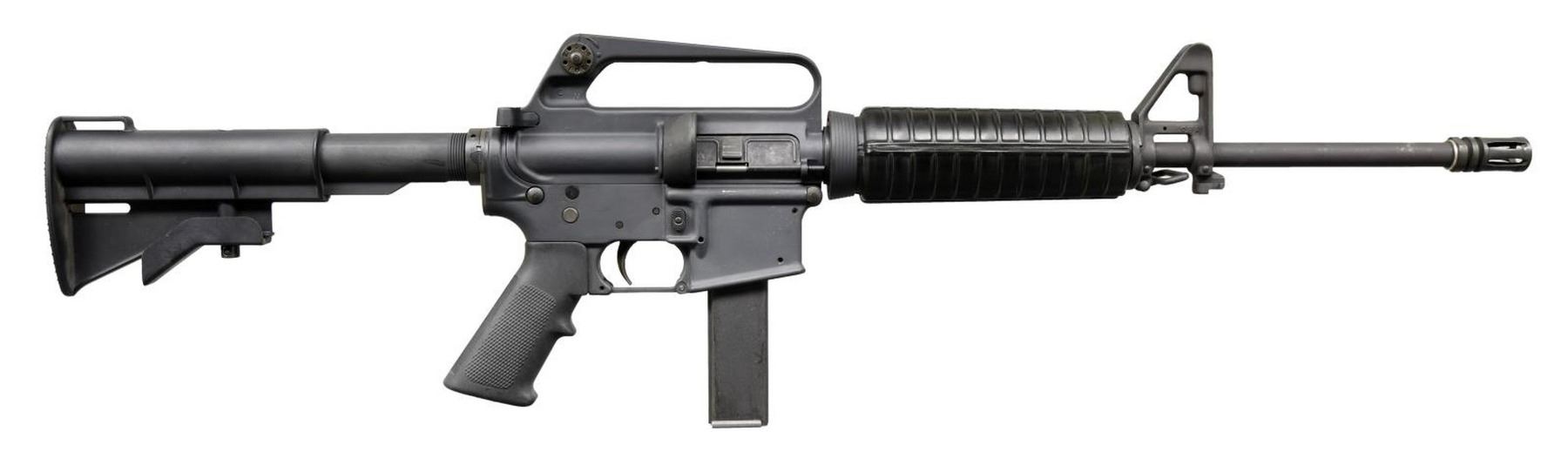 Cal. 9mm. S# TA11382. Bbl. 16". Blowback operated self loading rifle. Barrel marked; "C MP CHROME BORE 9MM NATO". Threaded muzzle terminated w/ A2 flash hider. Protected post front sight / bayonet lug / sling swivel. 6.5" carbine A2 handguards retained w/ tapered delta ring. Dual aperture peep rear sight inside carry handle. Ejection port buffer. Pinned mag adapter in mag-well. 2 position plastic collapsible shoulder stock. Factory block pin in lower receiver. M16 profile bolt carrier. MAGS:(6 total). 1 factory 20 rd. 5 USA Magazines 50 rd. CONDITION: All aspects indicate very little use. Finish complete & consistent w/ very few marks indicative w/ normal handling. Bright bore w/ strong rifling. Fire control mechanism appears to function correctly when cycled by hand. (23-1448/JZ). MODERN. $1,000-1,500.