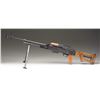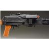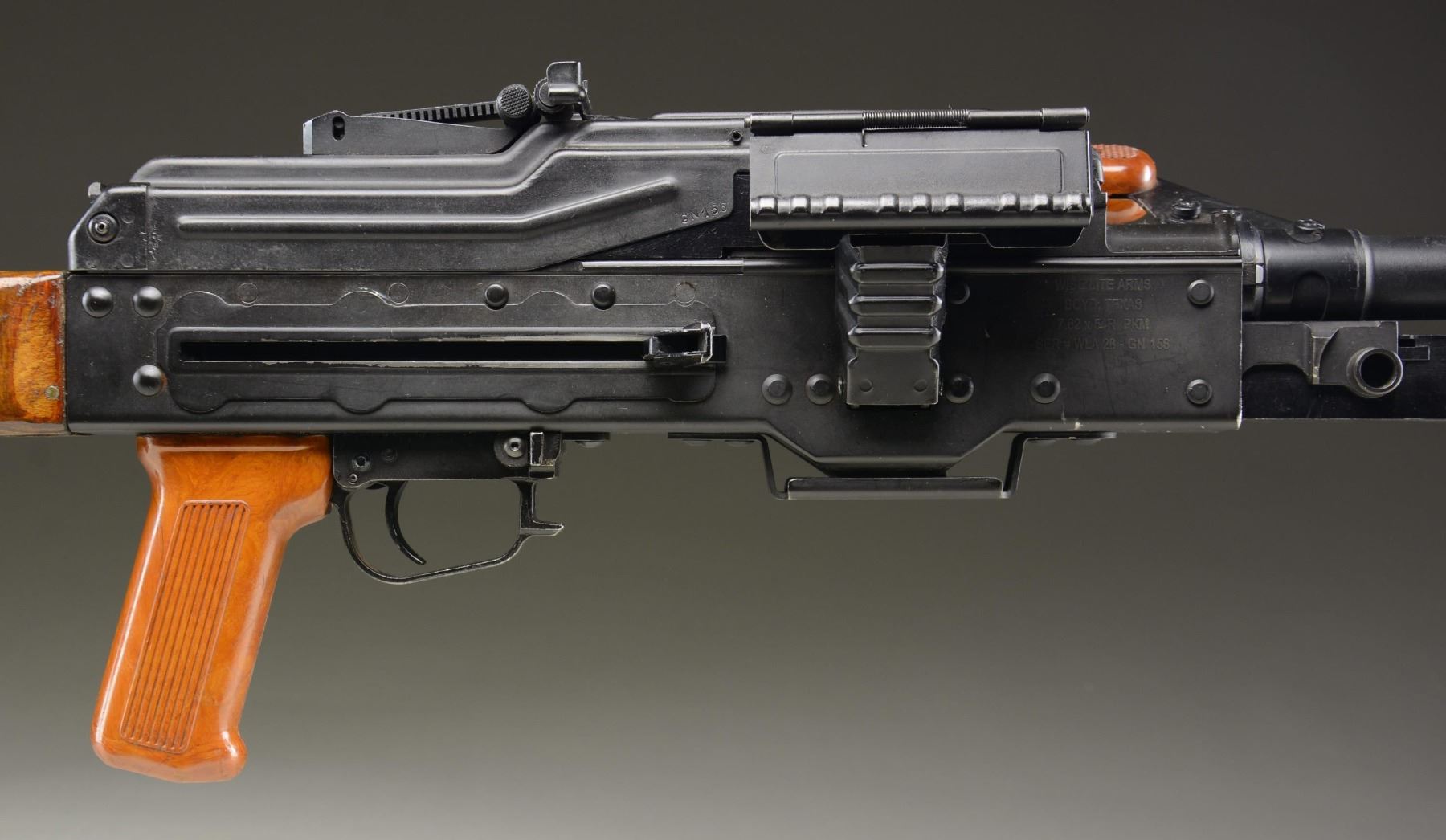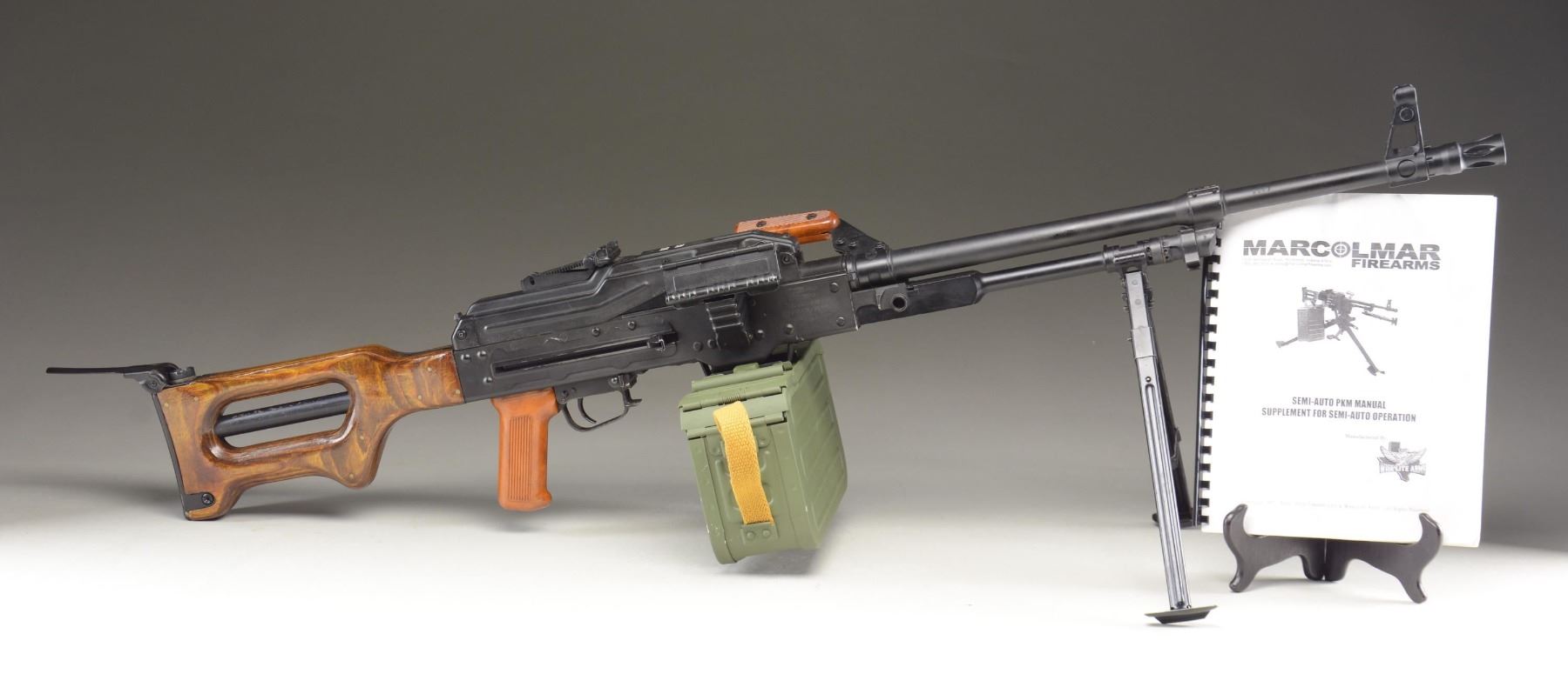 Cal. 7.62x54. S# WLA28-GN156. Bbl. 24". A beautiful semiautomatic version of the popular PKM Machine Gun manufactured by Wise Lite Arms of Boyd Texas. The aesthetics are gorgeous and Wise Lite has a reputation for making terrific self loading variants of LMGs. This example has a laminated skeletonized stock, similar in design to the Dragunov series. It has a matching bakelite pistol grip, matching the checkered carry handle. It utilizes a right side, non-reciprocating charging handle, below the top cover. Matching matte black finish on all exposed metal parts. The 24" barrel has a left-hand threaded muzzle, terminated w/ proper flash hider. Protected post front sight. Rear sight adjustable from 100 meters to 1500 meters. Folding bipod mounts firmly below barrel and locks in tightly when not in use. MAGS: 1 green aluminum belt box w/ new, sealed 100 rd. belt. UNATTACHED ACCESSORIES: Owners manual from MarColMar Firearms. CONDITION: Finish complete & consistent w/ light thinning in areas of mechanical intervention, such as on feed tray where belted ammo slides over the face. All aspects indicate very little use, if any. Bright bore w/ strong rifling. Fire control mechanism appears to function correctly when cycled by hand. (24-5213/JZ). MODERN. $3,000-5,000.