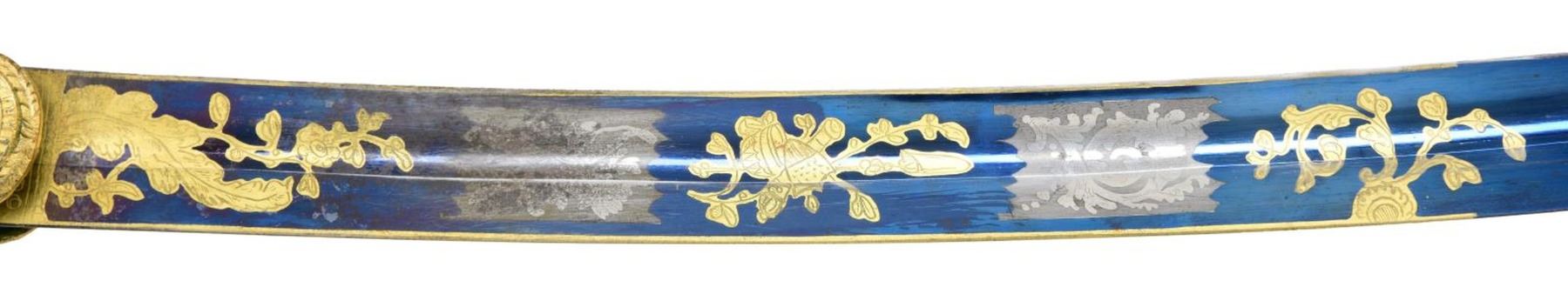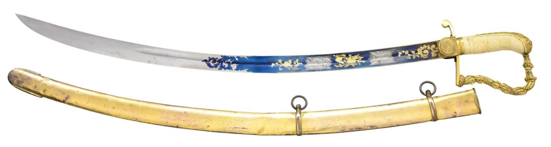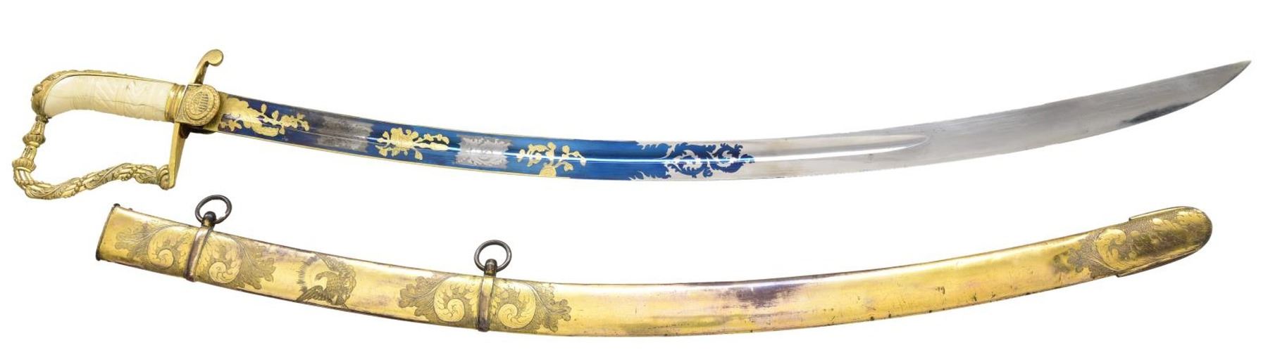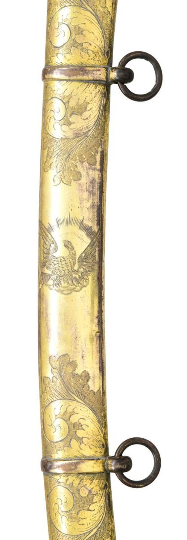 Overall length: 36”. Blade length: 30 3/8”. The tricolor blade has a single wide fuller with blued decoration over the first 16 1/2" coupled with gold-highlighted etching and two 1 1/2" white foliate panels on each side. Etching includes a spray of arms, a spray of arms with a federal shield/liberty cap, and foliate motifs. The heavily gilded brass hilt features extraordinary languets that have oval federal shields with 15 stars in the upper section. Surrounding the shields is the motto “PARTA TUERI”, which translates to “TO PROTECT THE VICTORY”. Plain crossguard with a drop quillon. The exceptionally elaborate knuckle bow features reeding with acanthus leaves and beaded rope. The backstrap is decorated with various foliate motifs, culminating with a 4-acorn motif atop the bird’s head pommel. Carved, certifiably antique ivory grip. Gilded brass scabbard, featuring exuberant floral motifs with an eagle and glory between the suspension mounts. CONDITION: blade retains areas of original factory polish with only the slightest wear. Hilt retains virtually 100% of its original gilding. Grip shows one tight drying crack. Scabbard has a few tiny shallow dents but should be considered exceptional in both design and condition. Throat screw is missing. (02-22676/BF). $3,500-4,500.