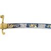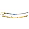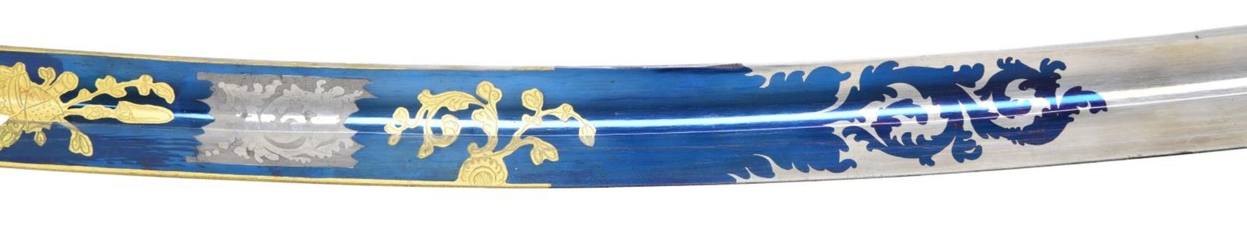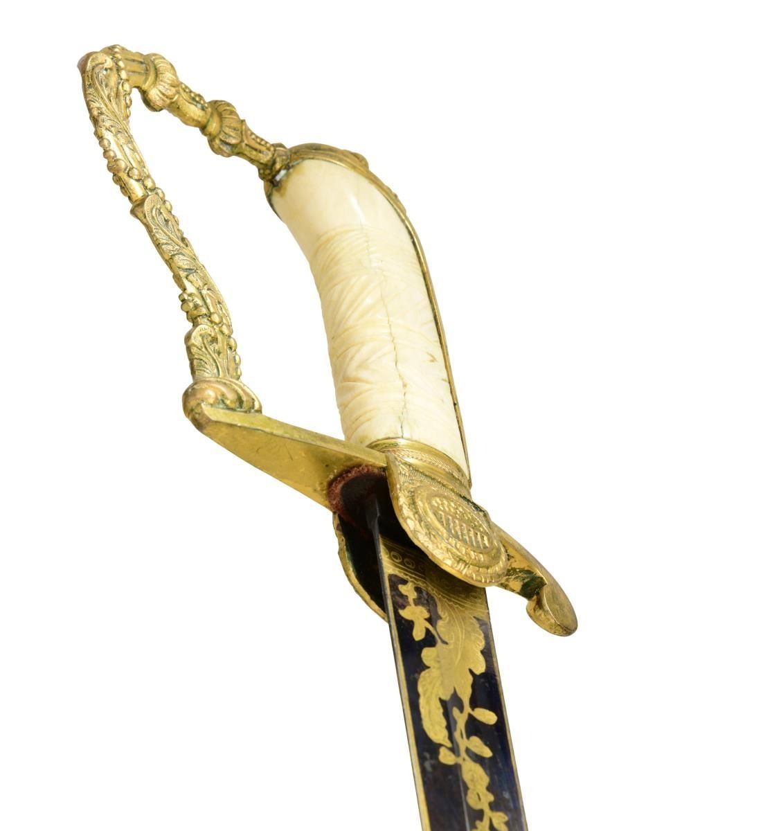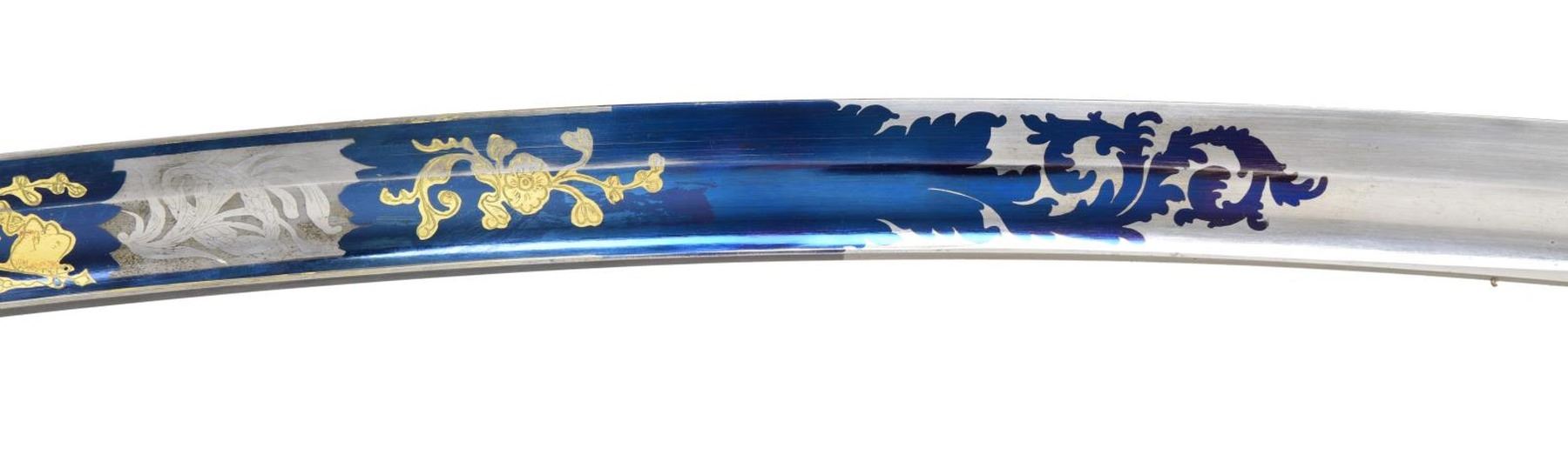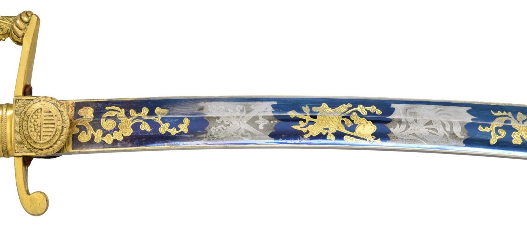 Overall length: 36”. Blade length: 30 3/8”. The tricolor blade has a single wide fuller with blued decoration over the first 16 1/2" coupled with gold-highlighted etching and two 1 1/2" white foliate panels on each side. Etching includes a spray of arms, a spray of arms with a federal shield/liberty cap, and foliate motifs. The heavily gilded brass hilt features extraordinary languets that have oval federal shields with 15 stars in the upper section. Surrounding the shields is the motto “PARTA TUERI”, which translates to “TO PROTECT THE VICTORY”. Plain crossguard with a drop quillon. The exceptionally elaborate knuckle bow features reeding with acanthus leaves and beaded rope. The backstrap is decorated with various foliate motifs, culminating with a 4-acorn motif atop the bird’s head pommel. Carved, certifiably antique ivory grip. Gilded brass scabbard, featuring exuberant floral motifs with an eagle and glory between the suspension mounts. CONDITION: blade retains areas of original factory polish with only the slightest wear. Hilt retains virtually 100% of its original gilding. Grip shows one tight drying crack. Scabbard has a few tiny shallow dents but should be considered exceptional in both design and condition. Throat screw is missing. (02-22676/BF). $3,500-4,500.