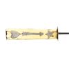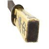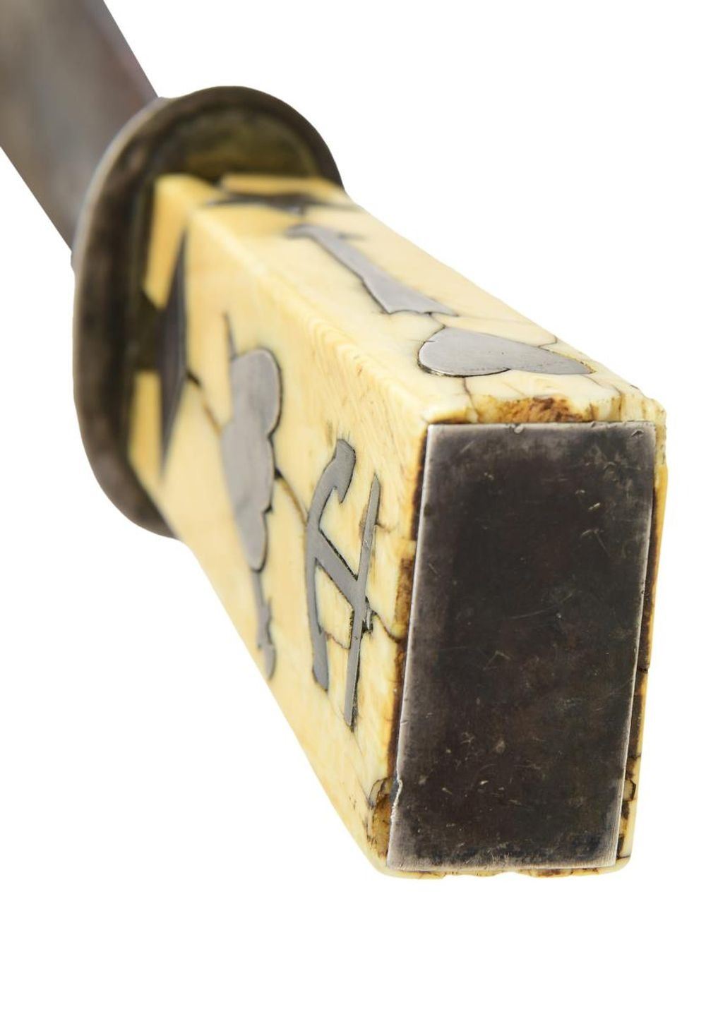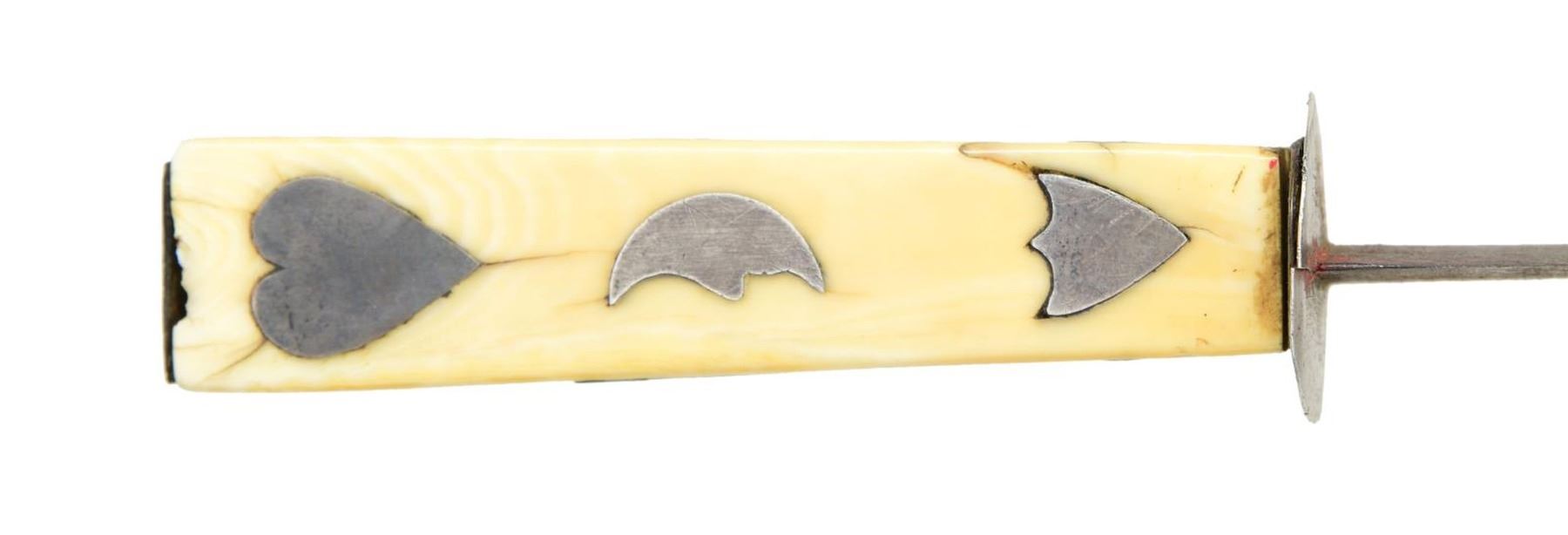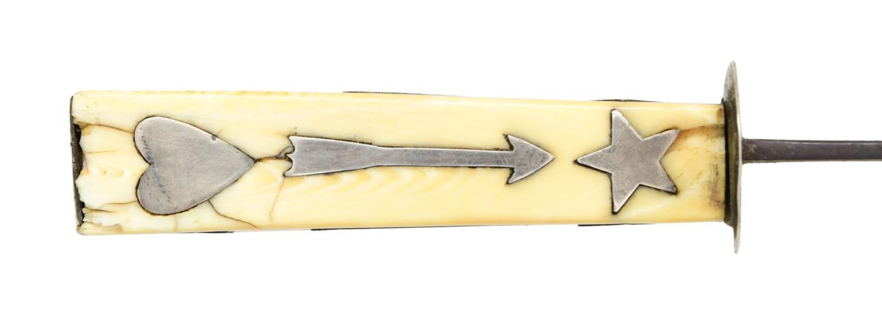 Overall length: 13 3/4". Blade length: 8 3/4". A very folky and visually attractive belt knife, likely for a sailor. Flat blade with a 2 1/2" false edge and a decorative cut behind the false edge. The blade swells nearly 3/4" from guard to tip. The oval guard is solid sheet silver reinforced by another oval of silver on top. The rectangular, certifiably antique ivory grip, which is likely whale ivory, has a rectangular silver pommel cap. The grip has 12 distinct silver inlays, evenly distributed over all four sides. The inlays include an anchor, diamond, arrow, star, heart, moon, and shield, as well as five more geometric inlays. The knife has its original leather sheath with scalloping on the top. CONDITION: the blade has an overall dark patina and does show some evidence of early sharpening, as one would expect. The silver inlays have a pleasing tarnish. The grip has several tight cracks from drying. Sheath is in solid condition and appears original to the knife. An extraordinary knife that should really be seen to be appreciated. (02-22672/BF). $3,000-4,000.