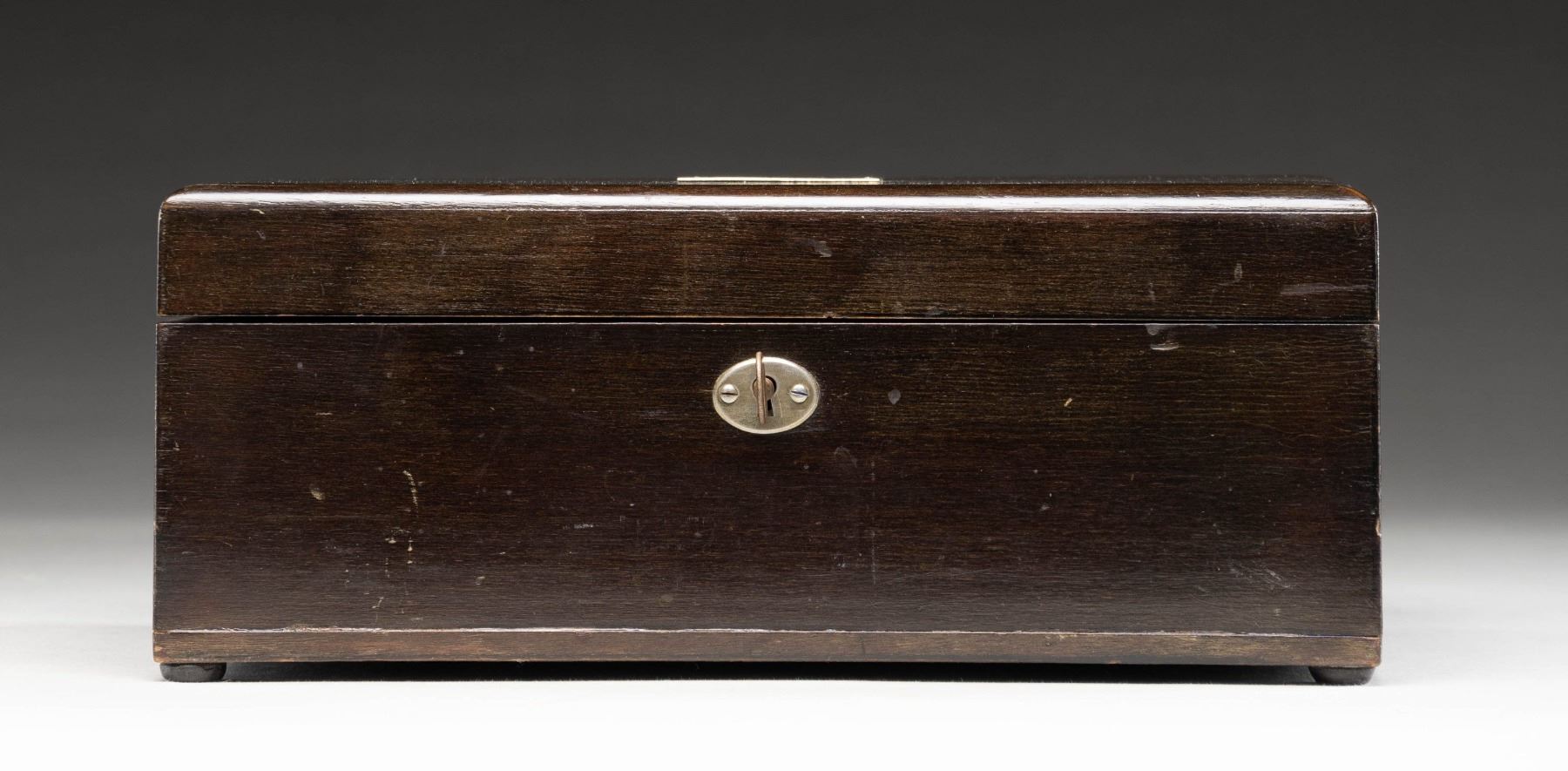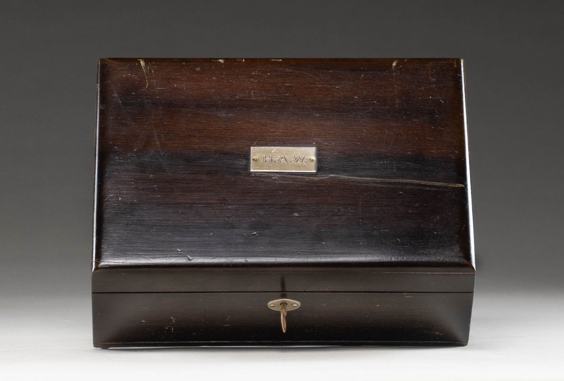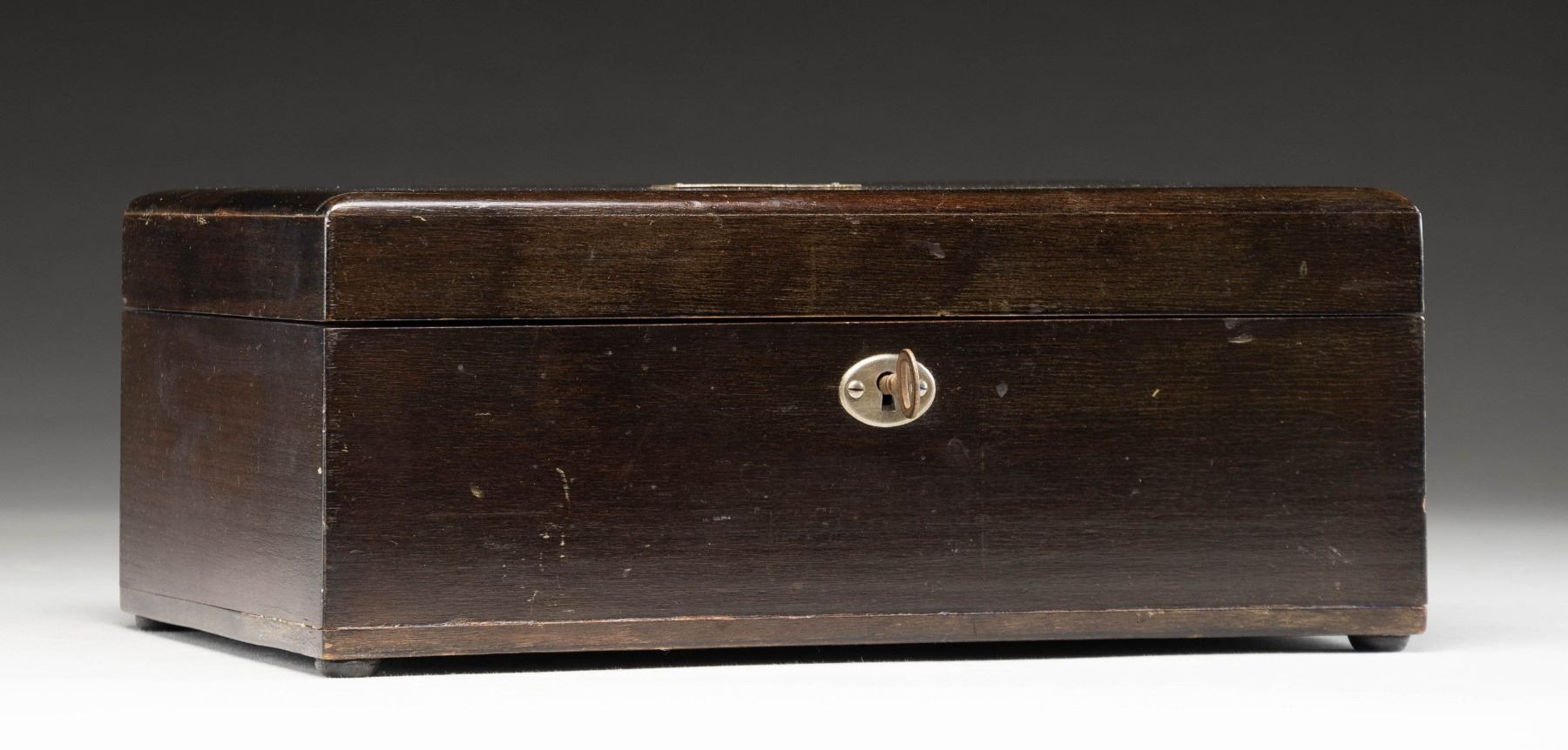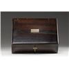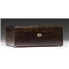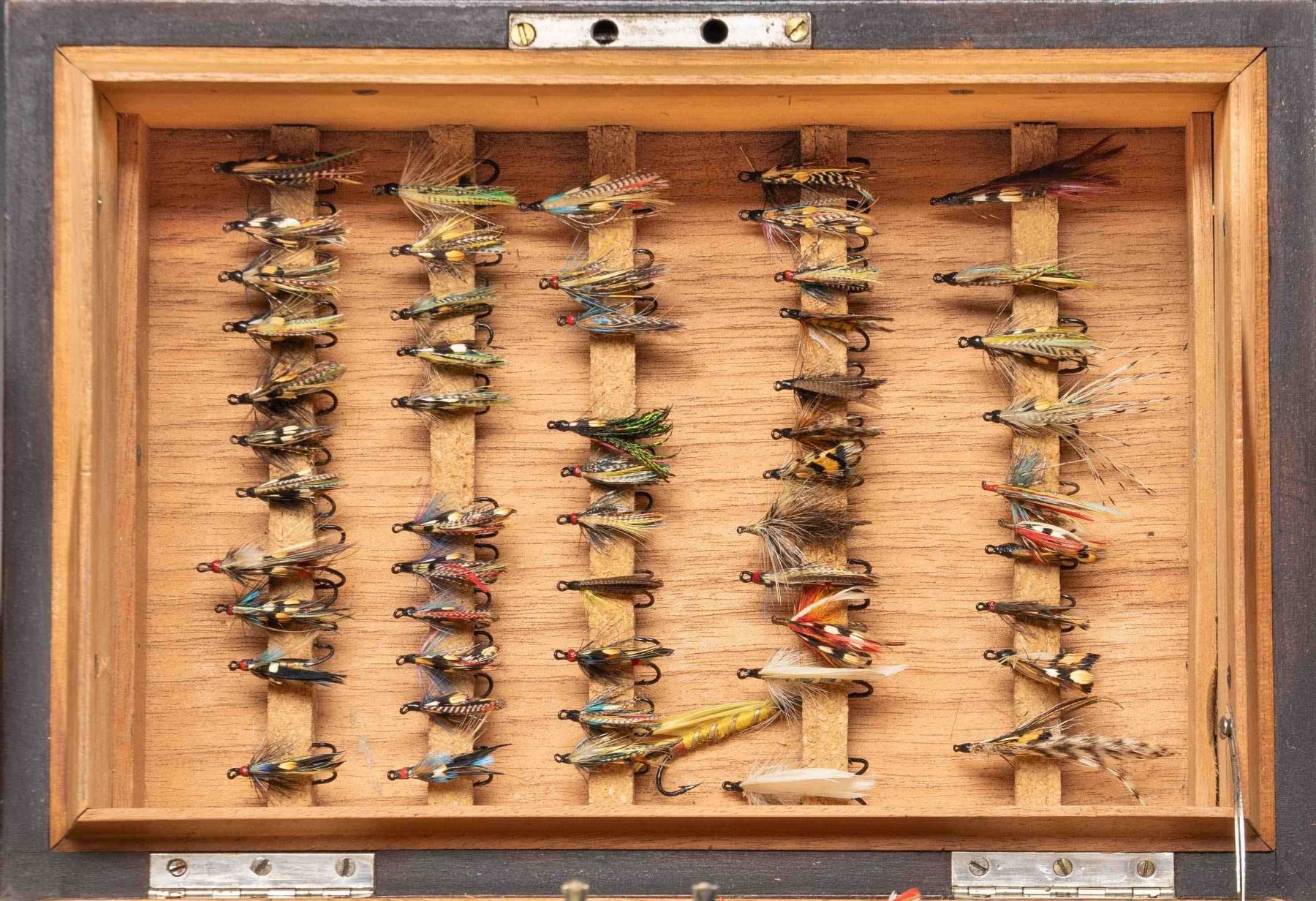 200 VINTAGE FLIES. 12" x 8" x 5" mahogany box with key lock. German silver rectangle on top engraved "H.A.W.". Interior is lined in cedar and has cork in lid. Box has two lift out trays. Bottom compartment and each tray contains over 60 flies of various patterns which appear to be contemporary with the box. About 15 flies are afixed to cork in lid. CONDITION: fine. Exterior retaining nearly all original finish with some scratches and marks. Interior very fine; bright and clean. Flies are very good to fine. Key lock is operable as key is present. PROVENANCE: From the Private Collection of Berrien Moore III. (02-25870-8/MGM). $600-1,500.