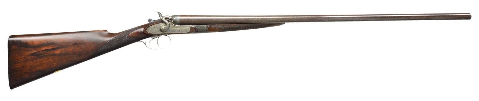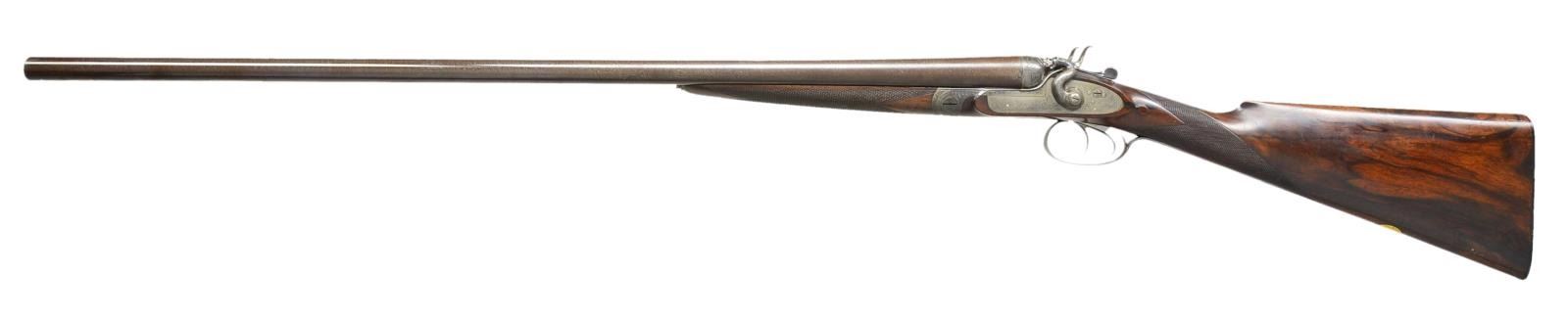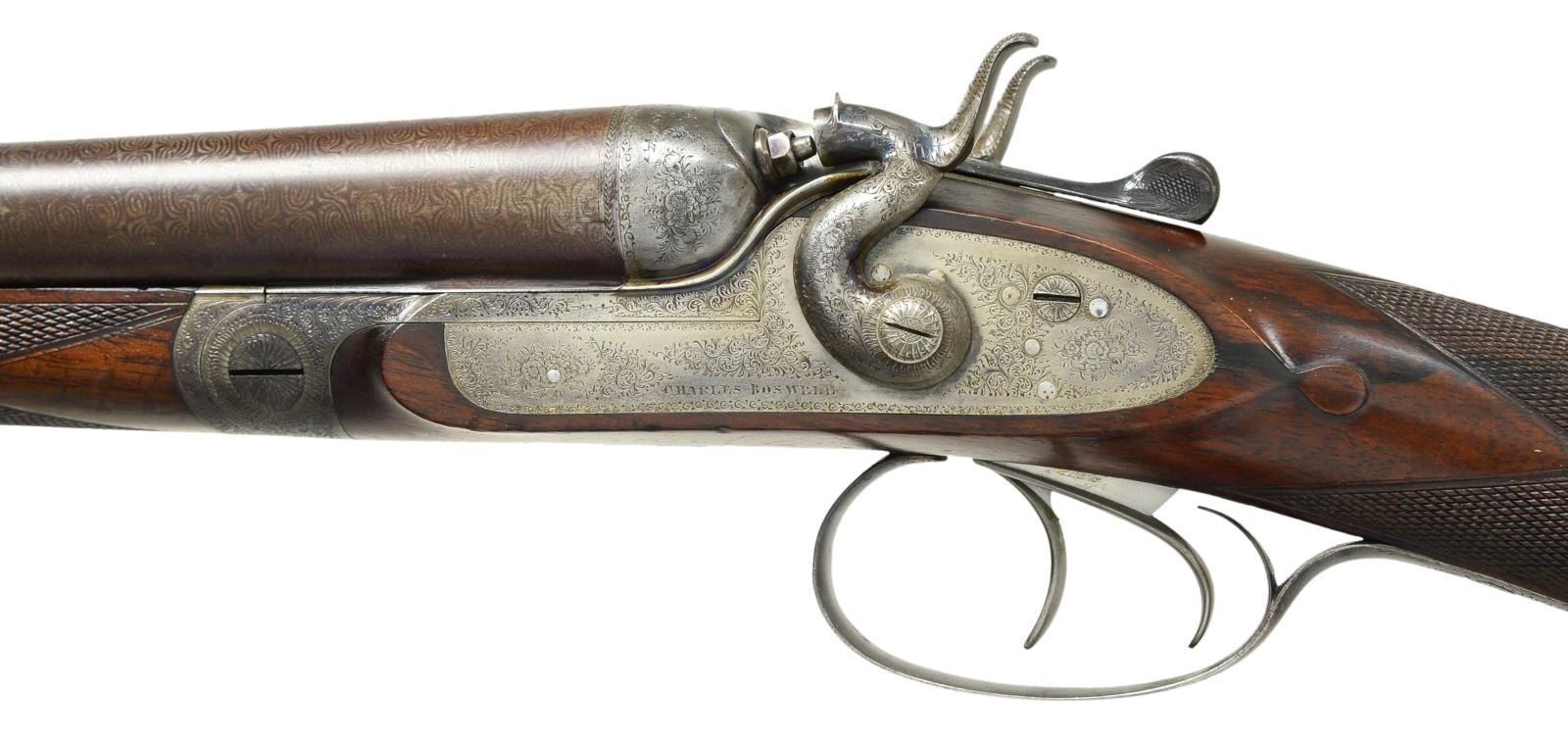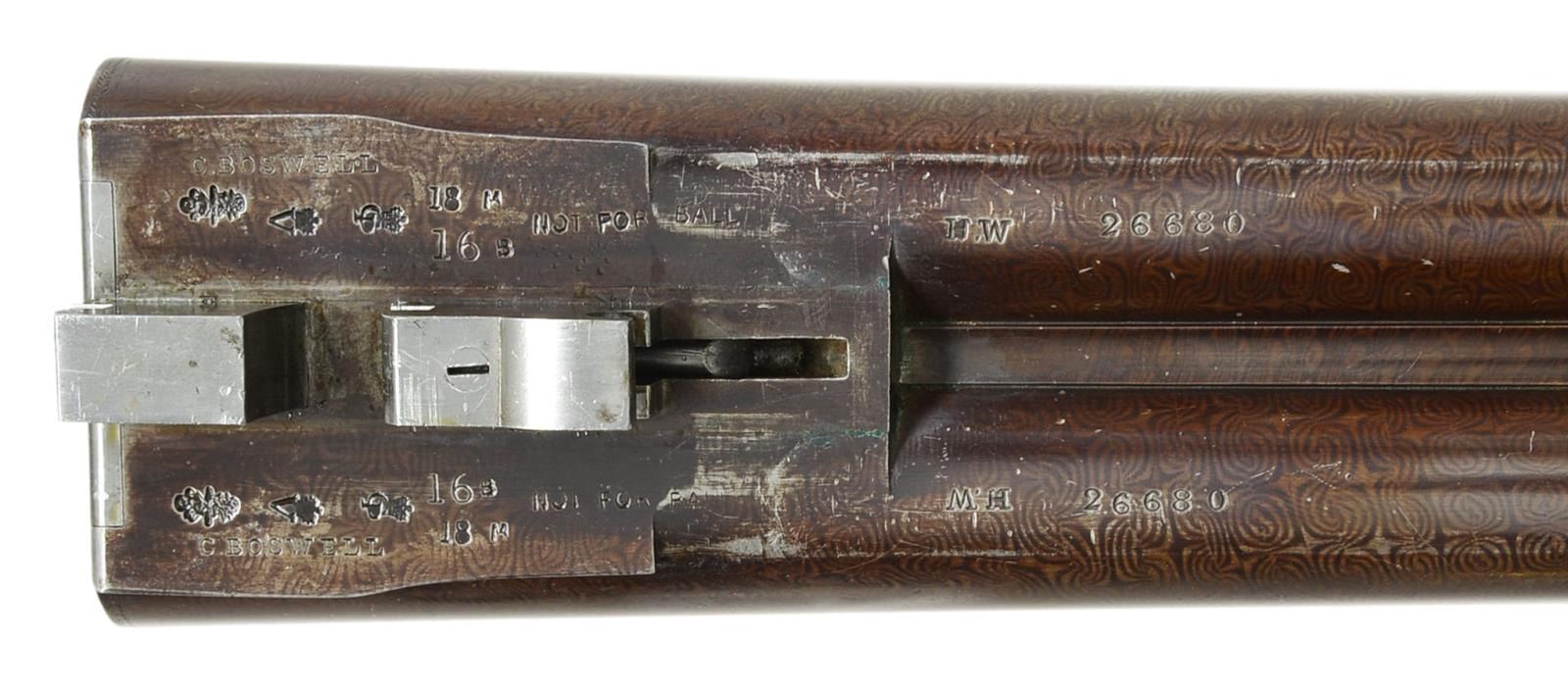 SXS GUN BY CHARLES BOSWELL. Cal. 16 Ga., 2 1/2". S# 26680. At first glance, this fine gun looks to be made by Purdey's as it is of the same style & evident high workmanship. 30" Dovetailed fine 2 stripe damascus bbls. engraved "Charles Boswell Maker. 126. Strand. London. W.C " on narrow swamped game rib. Bbl. flats stamped w/ 1890 Black powder proofs for 16 B & 18 M along w/ "NOT FOR BALL". Bottoms of bbls. stamped w/ S#'s & "H.W". Top lever bar in wood action of Purdey's third style is fitted w/ front spring locks having low set round bodied serpentine rebounding hammers. Action & locks engraved w/ 90% coverage well cut sm. scroll w/ sm. rose bouquet highlights. Blued top lever is engraved "PATENT" & each lockplate engraved "CHARLES BOSWELL". Trigger plate has sm. ball finial in Purdey style. Blued trigger guard w/ scroll on bow has S# on tang. Attractively marbled & lightly figured European walnut, straight grip buttstock measures 14 1/2" over checkered horn buttplate & features sm. drop points, classic point pattern checkering w/ mullered borders at grip & vacant gold oval on toeline. Matching splinter forend has Anson release. MEASUREMENTS: BARRELS: BORE DIAMETER: right .667", left .667". RESTRICTION: right .030" (Full), left .025" (Imp. Mod.). Min. WALL THICKNESS: right .033", left .035", STOCKS: LOP: 14 1/2". DAC: 1 1/2"-. DAH: 1 7/8"+ No cast. WEIGHT: 6 lbs., 7 oz. CONDITION: very fine. Bbls. retaining over 90% original brown w/ excellent definition to damascus pattern w/ only some light silvering & thinning on high edges & some browning of finish above forend. Action & lockplates retain most of their original case hardening color w/ some evidence of cleaning on locks & fences. Top lever & trigger guard retain over 60% of their original blue. There is a short hairline crack behind left lockplate. Stocks retain most of their hand rubbed oil refinish w/ a scattering of light marks & a few deeper sm. dings. Checkering lightly worn. Original buttplate shows no worm damage. Bores are very fine w/ no noted dents. They are shiny w/ scattering of minor pitting near breech end of right bbl. Action has just a hint of looseness, a .001" shim will pull out of top of bbls., but catches at bottom. Locks are excellent, but gummed w/ oil & need cleaning. The S# for this gun does not fit any of the known Charles Boswell ranges. It however appears to be original & is marked on the bottom of both bbls., water table & is engraved on tang. A superb example of the ultimate hammer gun by a highly regarded maker. This gun handles well & measures perfectly. (01-19821/MGM). ANTIQUE. $8,000-15,000.