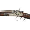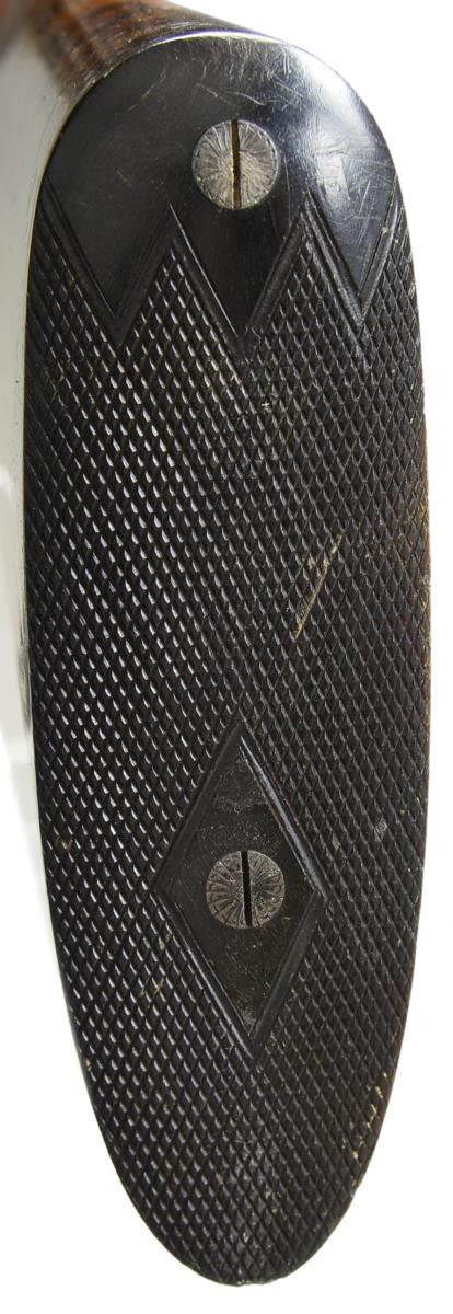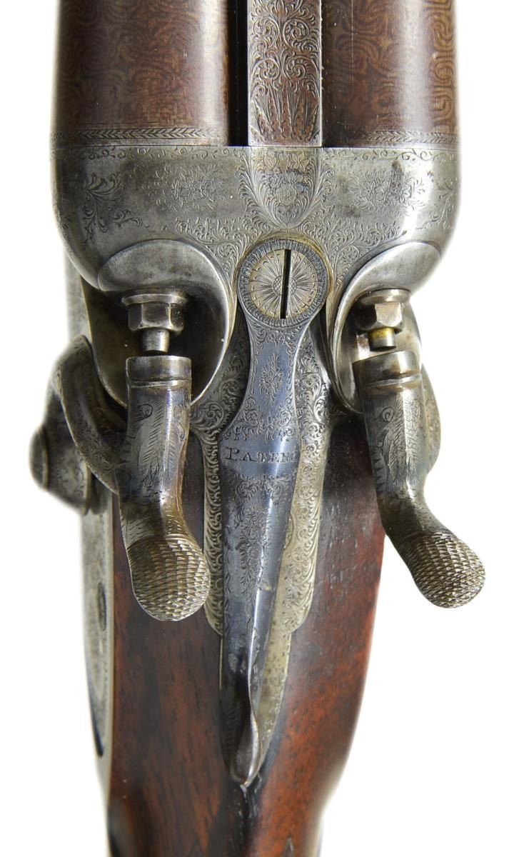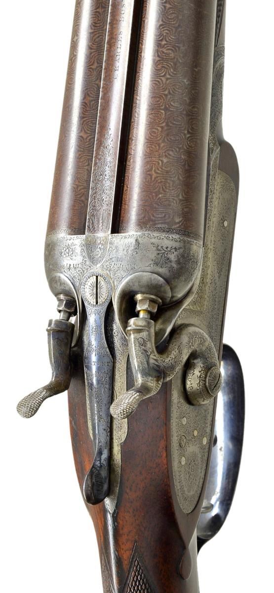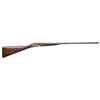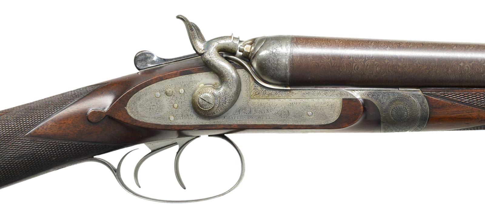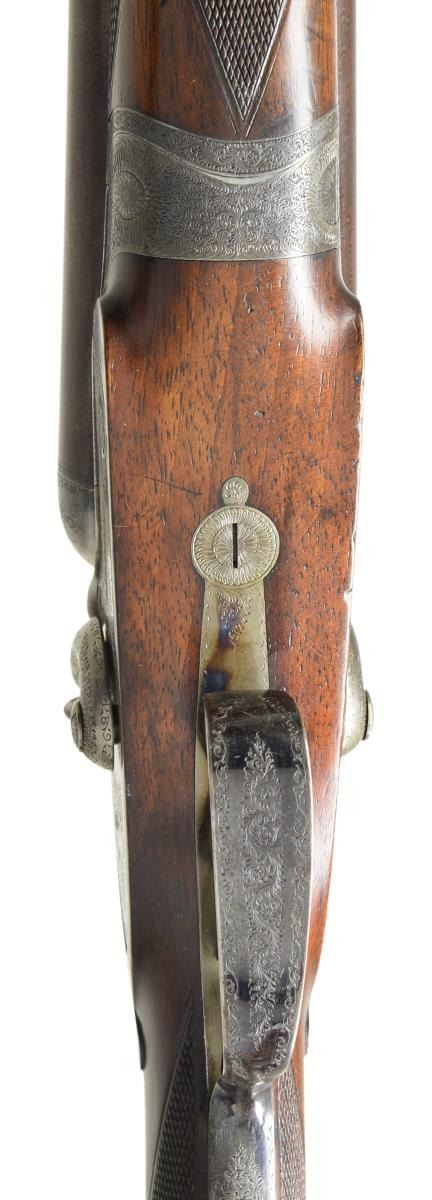 SXS GUN BY CHARLES BOSWELL. Cal. 16 Ga., 2 1/2". S# 26680. At first glance, this fine gun looks to be made by Purdey's as it is of the same style & evident high workmanship. 30" Dovetailed fine 2 stripe damascus bbls. engraved "Charles Boswell Maker. 126. Strand. London. W.C " on narrow swamped game rib. Bbl. flats stamped w/ 1890 Black powder proofs for 16 B & 18 M along w/ "NOT FOR BALL". Bottoms of bbls. stamped w/ S#'s & "H.W". Top lever bar in wood action of Purdey's third style is fitted w/ front spring locks having low set round bodied serpentine rebounding hammers. Action & locks engraved w/ 90% coverage well cut sm. scroll w/ sm. rose bouquet highlights. Blued top lever is engraved "PATENT" & each lockplate engraved "CHARLES BOSWELL". Trigger plate has sm. ball finial in Purdey style. Blued trigger guard w/ scroll on bow has S# on tang. Attractively marbled & lightly figured European walnut, straight grip buttstock measures 14 1/2" over checkered horn buttplate & features sm. drop points, classic point pattern checkering w/ mullered borders at grip & vacant gold oval on toeline. Matching splinter forend has Anson release. MEASUREMENTS: BARRELS: BORE DIAMETER: right .667", left .667". RESTRICTION: right .030" (Full), left .025" (Imp. Mod.). Min. WALL THICKNESS: right .033", left .035", STOCKS: LOP: 14 1/2". DAC: 1 1/2"-. DAH: 1 7/8"+ No cast. WEIGHT: 6 lbs., 7 oz. CONDITION: very fine. Bbls. retaining over 90% original brown w/ excellent definition to damascus pattern w/ only some light silvering & thinning on high edges & some browning of finish above forend. Action & lockplates retain most of their original case hardening color w/ some evidence of cleaning on locks & fences. Top lever & trigger guard retain over 60% of their original blue. There is a short hairline crack behind left lockplate. Stocks retain most of their hand rubbed oil refinish w/ a scattering of light marks & a few deeper sm. dings. Checkering lightly worn. Original buttplate shows no worm damage. Bores are very fine w/ no noted dents. They are shiny w/ scattering of minor pitting near breech end of right bbl. Action has just a hint of looseness, a .001" shim will pull out of top of bbls., but catches at bottom. Locks are excellent, but gummed w/ oil & need cleaning. The S# for this gun does not fit any of the known Charles Boswell ranges. It however appears to be original & is marked on the bottom of both bbls., water table & is engraved on tang. A superb example of the ultimate hammer gun by a highly regarded maker. This gun handles well & measures perfectly. (01-19821/MGM). ANTIQUE. $8,000-15,000.