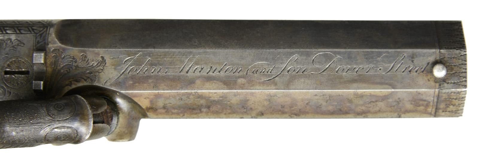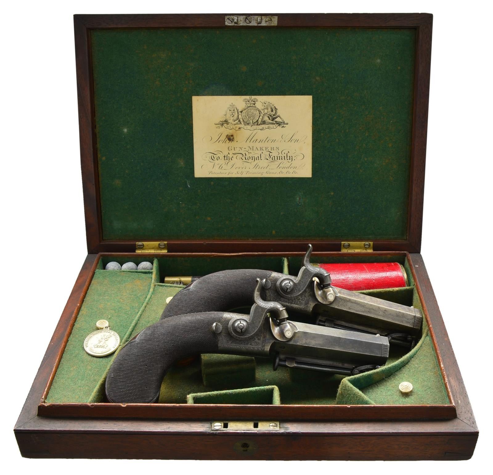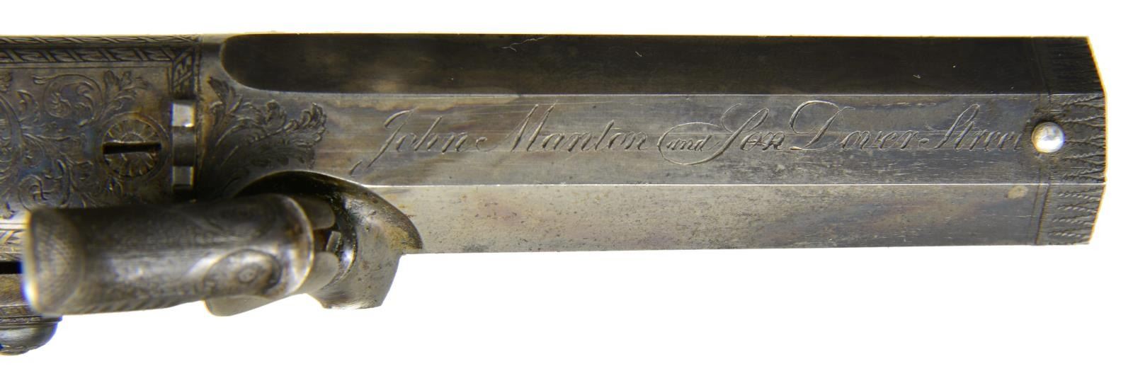 POCKET PISTOLS WITH FOLDING TRIGGERS IN THEIR ORIGINAL CASE WITH ACCESSORIES. EX. W. KEITH NEAL COLLECTION. Cal. 50 smooth bore. S# NSN. These good quality pistols were probably sourced from the trade and retailed by John Manton's successors around 1840. They have 3" octagon barrels which are one piece with frames. Frames are fitted with flat faced serpentine side hammers with stylized dolphin heads. Back sliding safeties are fitted. Hinged and blued triggers extend when hammers are cocked. Under ribs are fitted with blued bridled steel ramrods. Top flats are engraved "John Manton and Son Dover Street". Actions are very nicely engraved with clean cut open scroll within double feather borders. Bag grips have very closely spaced checkering, silver crest plates on backs are engraved "S". UNATTACHED ACCESSORIES: guns are housed in their original mahogany case with key lock and brass medallion on lid. Interior is lined with green cloth and a small John Manton and Son paper label in lid is of the type used 1824-40. Case is fitted for guns and accessories that include small red Morocco leather covered three cavity flask, brass and rosewood cleaning and loading rods. There are three covered compartments, one holds nutcracker ball mould marked "40", and ebony handled nipple wrench. Another compartment holds lead balls. The third holds patches. Original W. Keith Neal Collection tag "C118" is attached to knob of largest covered compartment. CONDITION: very fine retaining over 90% original finishes on both wood and metal. Bores are bright and shiny, mechanically crisp. Case is also very fine with some scratches and marks on exterior. Interior cloth is very good with fading and compressions. Label is lightly foxed and has one deep compression from contact with hammer screw. Accessories are generally fine. (01-21909/MGM). ANTIQUE. $6,000-10,000.