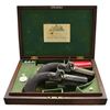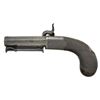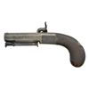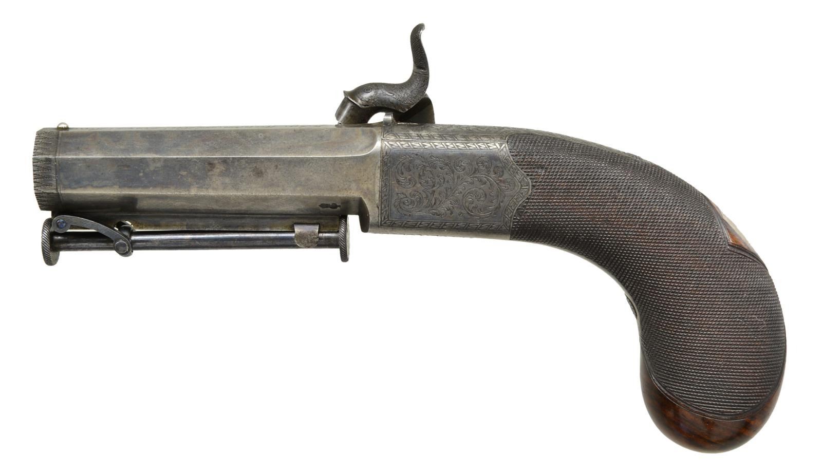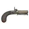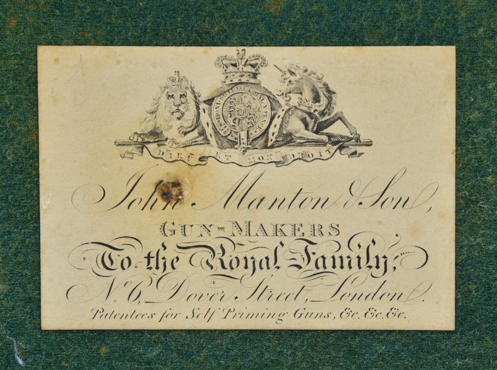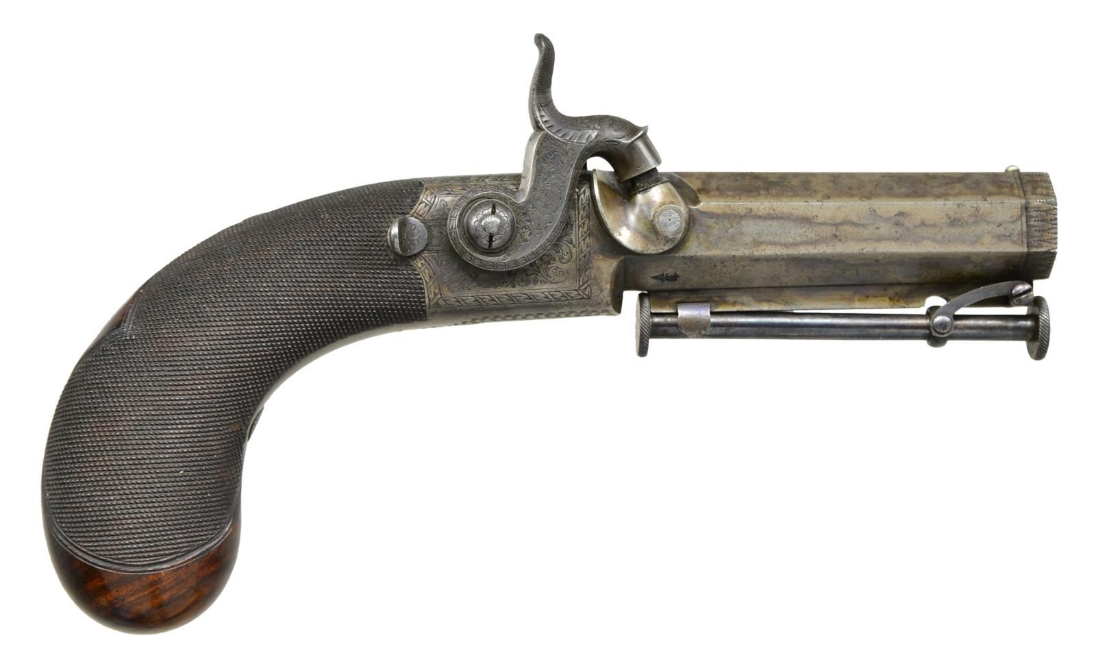 POCKET PISTOLS WITH FOLDING TRIGGERS IN THEIR ORIGINAL CASE WITH ACCESSORIES. EX. W. KEITH NEAL COLLECTION. Cal. 50 smooth bore. S# NSN. These good quality pistols were probably sourced from the trade and retailed by John Manton's successors around 1840. They have 3" octagon barrels which are one piece with frames. Frames are fitted with flat faced serpentine side hammers with stylized dolphin heads. Back sliding safeties are fitted. Hinged and blued triggers extend when hammers are cocked. Under ribs are fitted with blued bridled steel ramrods. Top flats are engraved "John Manton and Son Dover Street". Actions are very nicely engraved with clean cut open scroll within double feather borders. Bag grips have very closely spaced checkering, silver crest plates on backs are engraved "S". UNATTACHED ACCESSORIES: guns are housed in their original mahogany case with key lock and brass medallion on lid. Interior is lined with green cloth and a small John Manton and Son paper label in lid is of the type used 1824-40. Case is fitted for guns and accessories that include small red Morocco leather covered three cavity flask, brass and rosewood cleaning and loading rods. There are three covered compartments, one holds nutcracker ball mould marked "40", and ebony handled nipple wrench. Another compartment holds lead balls. The third holds patches. Original W. Keith Neal Collection tag "C118" is attached to knob of largest covered compartment. CONDITION: very fine retaining over 90% original finishes on both wood and metal. Bores are bright and shiny, mechanically crisp. Case is also very fine with some scratches and marks on exterior. Interior cloth is very good with fading and compressions. Label is lightly foxed and has one deep compression from contact with hammer screw. Accessories are generally fine. (01-21909/MGM). ANTIQUE. $6,000-10,000.