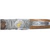 S O 6 EELL WITH LEATHER AND ABS CASES. Cal. 12 Ga. S# C14345B. Bbls.: 28" Mono-bloc bbls. choked mod & full, w/ matted, ventilated rib, have all correct factory markings. Bottom of mono-bloc is stamped w/ grade, serial number, & 1997 Italian nitro proofs for 2 3/4" chambers. Coin finished Beretta patent low profile, sidelock OU action features non-automatic safety, gold plated single selective trigger & side bolsters. Action & lockplates are engraved w/ near full coverage exceptionally well cut & shaded semi-relief large acanthus scroll. There are rose bouquet highlights on trunion pins. On lockplates this fine scroll work surrounds oval vignettes of relief gold inlaid ducks in nicely detailed backgrounds; pair of pintail rising from cattails on left & a pair of mallards flying over a similar marsh on right. Backgrounds are nicely shaded in Bulino technique w/ clouds & sky dramatically presented. On bottom of action there is a cock pheasant taking flight from base of solitary tree in open meadow. This excellent work is signed 'A. Martelli" on trigger plate. Double beaded trigger guard engraved to match action, has grade on tang. Top lever is pierced in floral motif & inlaid w/ a gold crown. Very finely broad marbled & stump figured flesh-toned oil finished European walnut pistol grip buttstock measures 14 1/2" over thin red Old English pad. Closely spaced point pattern checkering is at grip. Slim field forend matches well & has Deeley type release. DAH: 2 1/4". DAC: 1 1/2". No cast. WEIGHT: 7 lbs. 7 oz. UNATTACHED ACCESSORIES: gun is housed in tan leather case by Nizzoli. A brown vinyl gold embossed Beretta label is in lid. Case is lined in green cloth & contains cleaning equipment, 4 rosewood handled turnscrews & guarantee. Also included is blue ABS Beretta case w/ instruction booklet & sling swivels, if you want to install them. CONDITION: very fine, close to new, w/ evidence of limited firing, retaining nearly all original factory finishes, w/ some congealed oil in action & one patch of darkening in sky of left duck scene. Mechanically crisp. Leather case is very fine w/ a few light marks. ABS case is near new. This next to the top of the line model presently retails at over $78,000.00. (20-1282/MGM159). MODERN. $17,500-27,500.