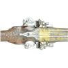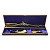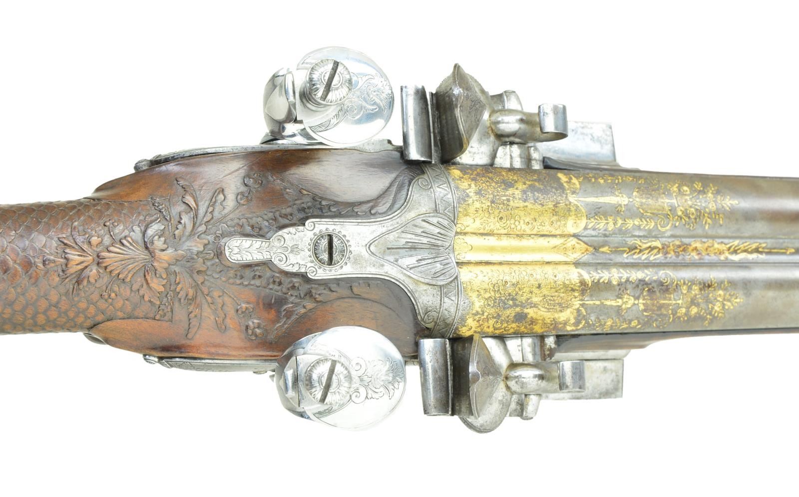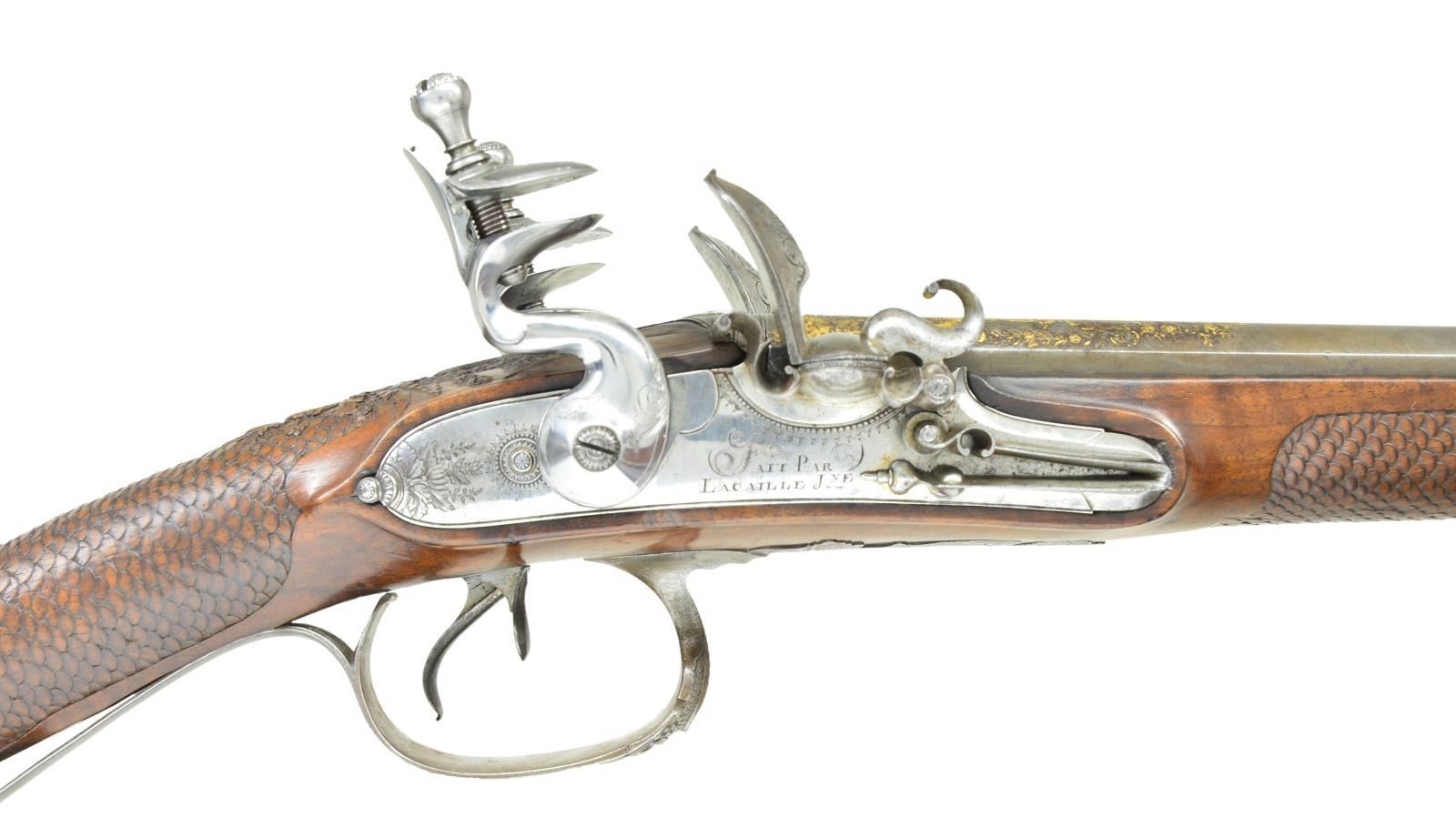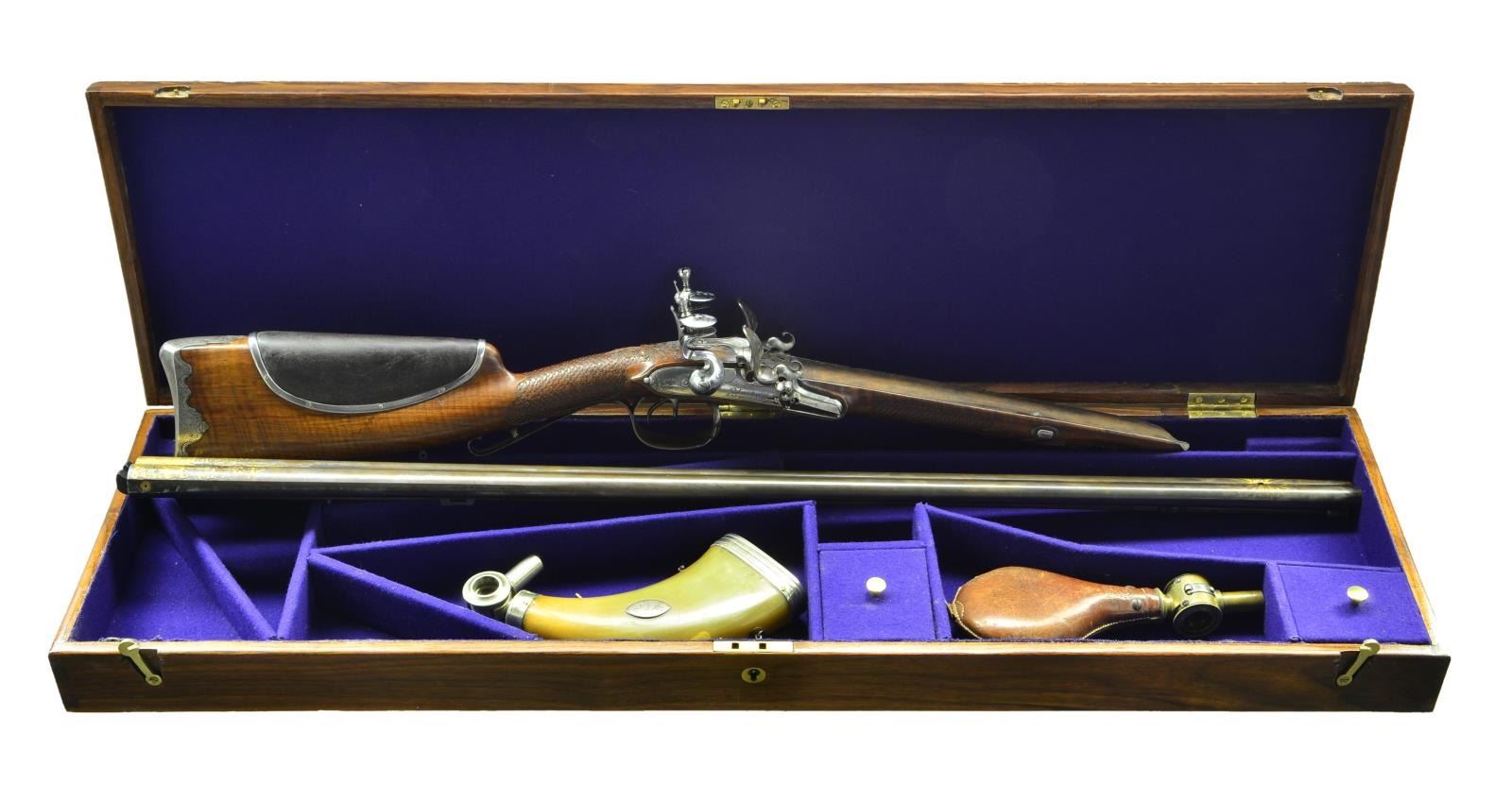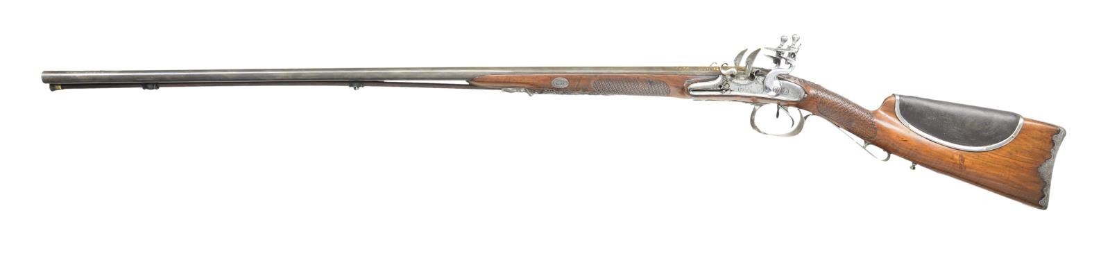 FLINTLOCK SHOTGUN BY JACQUES LACAILLE OF BLOIS WITH CUSTOM CASE AND FINE EARLY ACCESSORIES BY BOCHEIeur. Cal. 24 Ga. .586 bore diameter. S# NSN. Jacques Lacaille was working in Blois central France (about 100 miles south of Paris) 1775-1829. His work is of the highest order, but is not overstated. The 34" barrels without patent breeches have gold lined touch holes. Rear portions of barrels and narrow sunken rib are engraved and gold washed with garlands of flowers and leaves spilling from vases. Silver bead front sight is surrounded by engraved and gold washed starburst. Bottom of left barrel is stamped "GIRAUD DUMARES" and with rampant lion logo (Circa 1766-1824 St. Etienne, iron worker and finisher). Bottom right barrel is stamped "TORDU" (twisted). Breech iron is well filed and engraved. Superb quality locks with round bodied slightly arched plates having relief filed ball tails, are fitted with serpentine cocks. Beautifully filed inset rounded waterproof pans, with scroll filed fences, are gold lined. Bridled roller frizzens are well filed and engraved. Rollers are on intricately filed feather springs which have pad and spear finials. Lockplates are engraved in foliate motifs within geometric and line borders. This engraving extends to cocks and frizzens. Right lock plate is engraved "Fait Par" "Lacaille Jne". Left lockplate is engraved "Blois". Trigger plate is shaped and engraved depicting a neoclassical urn motif with floral accents. Steel trigger guard is finely relief filed with spider web at front of fluted bow and has shallow curled tail forming grip. Stock of dense fiddle figured French walnut measures 13 3/4" over heavy, fancy filed and engraved steel buttplate. Stock features leather covered comb retained by tacked on steel band and fish scale "checkering" at grip and forend. Fancy thimble which matches trigger plate and breech iron are surrounded by beautifully carved relief floral and acanthus motifs. Stock attaches to barrels with single captive sidebolt through cast silver engraved oval escutcheons. Replacement hickory ramrod with brass tip and tail, mounts through two heavy ring turned pipes, rear pipe has eye for sling loop. MEASUREMENTS: STOCK: DAH: 2 5/8". DAC: 1 1/4". CAST: neutral. LOP: 13 3/4". WEIGHT: 6 lb. 7 oz. UNATTACHED ACCESSORIES: newly custom made dovetailed case with dual hook and key lock closure is of well marbled European walnut. Case is lined in royal blue cloth and has compartments for barrels, stock, locks and some fine accessories. Notably a German silver mounted pressed horn powder flask with pivoting charging spout, along with a brass and leather shot flask with similar type spout; both are marked "BOCHEIeur A PARIS". Also included are a copper bodied small powder flask of foliate shape and German silver shot and powder measure marked "PLOMB" and "POUDRE". There are two covered compartments with brass knobs, one holds a sling loop and a key the other two old possibly original remnants of cock with screws and top jaws. CONDITION: very good. Barrels retaining traces of their original blue were protected but are mostly gray brown and retain nearly 60% gold wash. Locks are well polished to near silver over some very light staining, pans retain most of their gold lining. Cocks are exceptionally well done reproductions with original cocks used as patterns for modification of high quality castings from E. J. Blackly & Son. New cocks are engraved with scroll to match. Remnants of old cocks in case. Stock shows light cleaning and oil refinish over a good scattering of marks both light and heavy. Intricate carving shows moderate wear. Other metal parts show light cleaning to gray brown patina with little or no pitting. Bores are shiny with light pitting throughout with one or two deeper pits evident. Locks are fine. Case retains nearly all of its oil finish. Interior cloth is fine. Powder flask is good, shot flask fine, other accessories are good. (01-22755/MGM). ANTIQUE. $5,000-8,000.