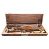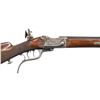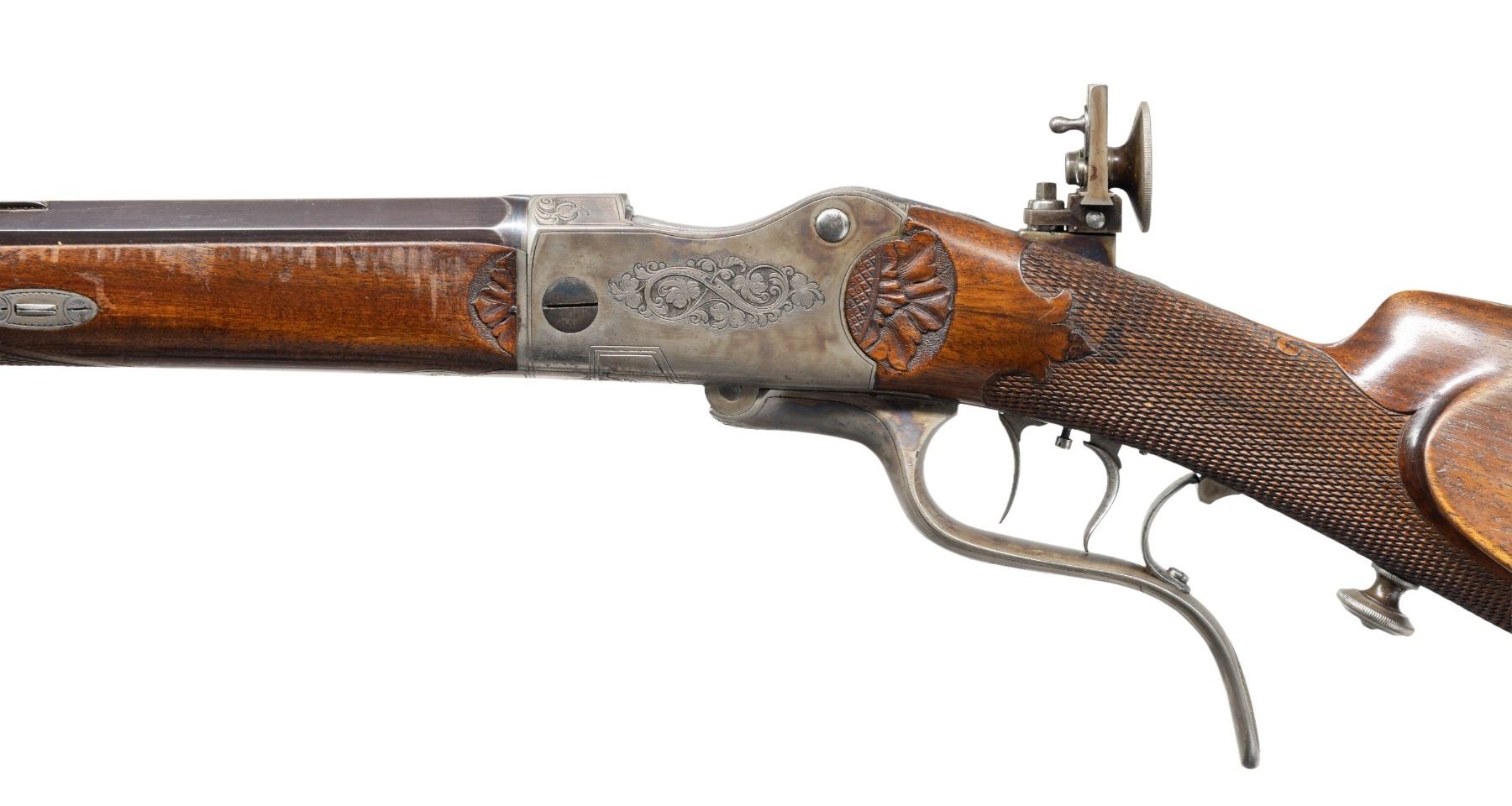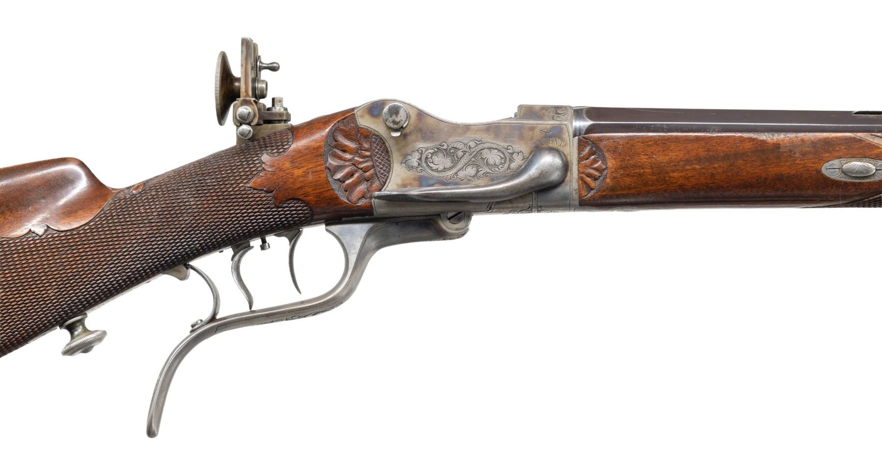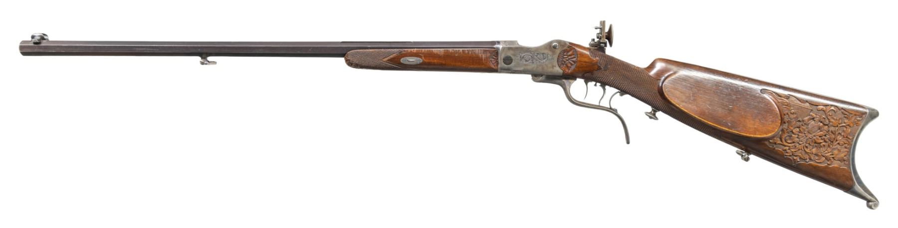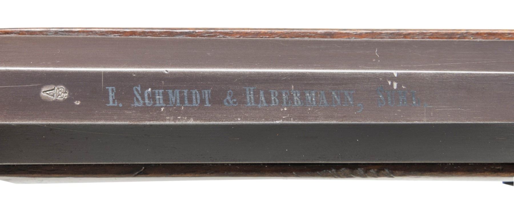 TARGET/HUNTING RIFLE BY SCHMIDT & HABERMANN WITH CASE AND ACCESSORIES. Cal. 8x32R Tesching (consignor states). S# NSN. The 25-5/8" octagon barrel is silver inlaid with maker's name and address on top flat which has slip on dovetail for barrel sight which is in case. Pin type front sight is in windage adjustable base and protected by ears on sides. A crowned "V" proof is found on top and bottom flats indicating that this gun was "on hand" in 1891 and exempt from new German proof laws. Case hardened Martini type action has takedown lever on right side, removable breech block and double set trigger group retained by screw in bottom tang. Action is engraved with superbly cut and shaded sprays of large acanthus scroll. A very finely machined aperture rear sight is mounted on top tang which is adjustable for windage and elevation. Straight grip buttstock made of relatively plain European walnut measures 13-3/8" over case hardened steel off hand type buttplate. Stock features right hand cheekpiece and very nicely cut fancy pattern checkering around grip. There are raised carved acanthus accents behind action and left side of stock behind cheekpiece is finely relief engraved with acanthus scroll and jaeger enjoying a mug of beer after a long days hunt. Matching forend attaches to barrel with side bolt and takedown plate at rear. UNATTACHED ACCESSORIES: newly made walnut case has bottom compartment French fitted for action, barrel and some accessories including barrel sight which appears to be original. Cleaning rod, powder dipper, small powder horn, some spare parts and 10 primed formed cases with bullets (no powder).CONDITION: very fine original. Barrel with about 80% original blue. Action and other iron parts with about 60% original case hardening color. Stocks with about 90% original varnish with a fair scattering of minor marks, especially on forend. Bore is bright, sharp and shiny. Mechanically fine. Case is very fine. PROVENANCE: From the Buckstix Collection. (01-28738/MGM). ANTIQUE. $3,000-5,000.