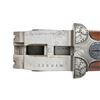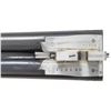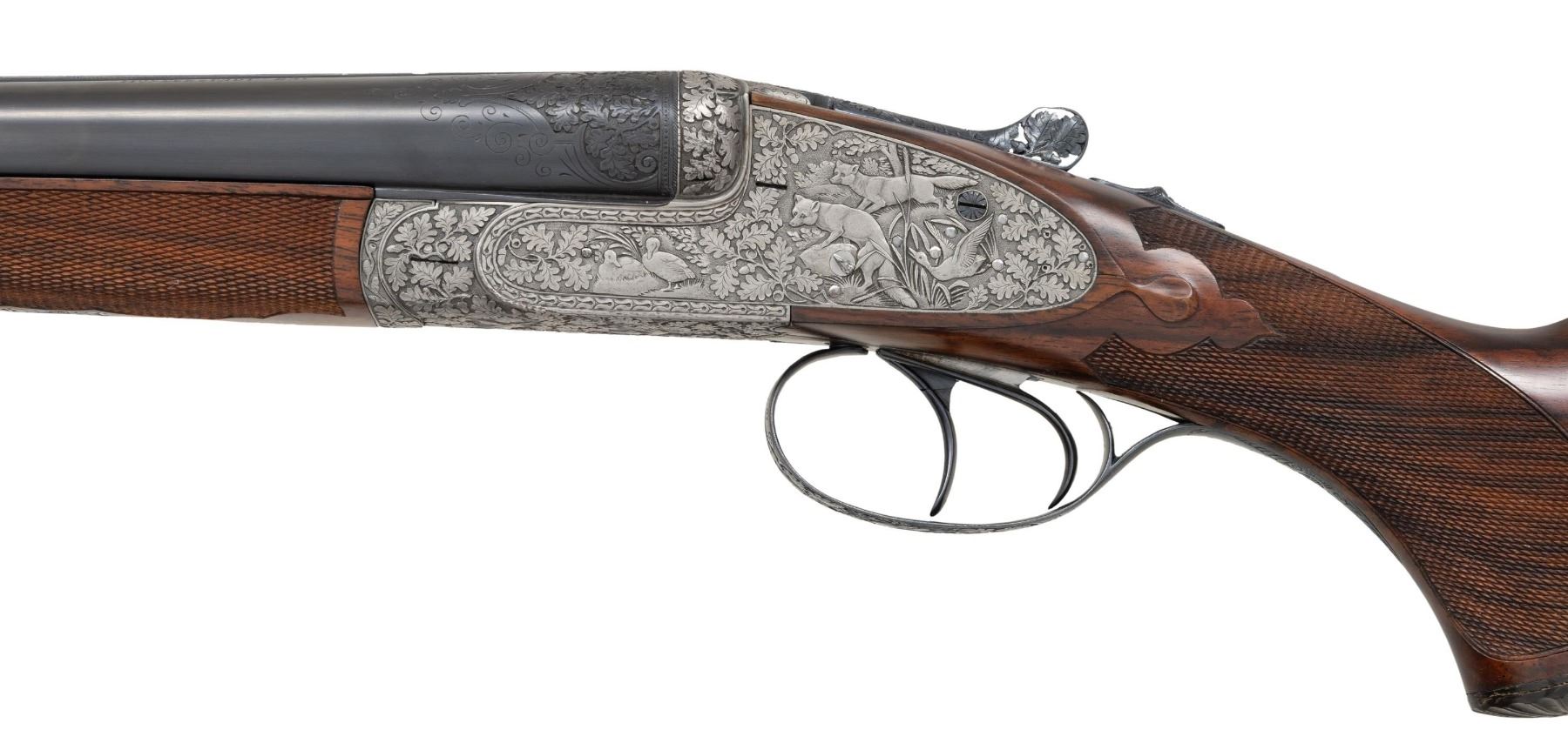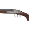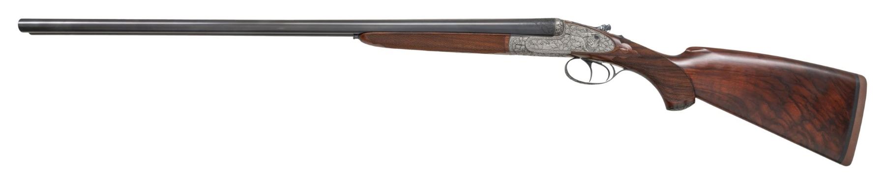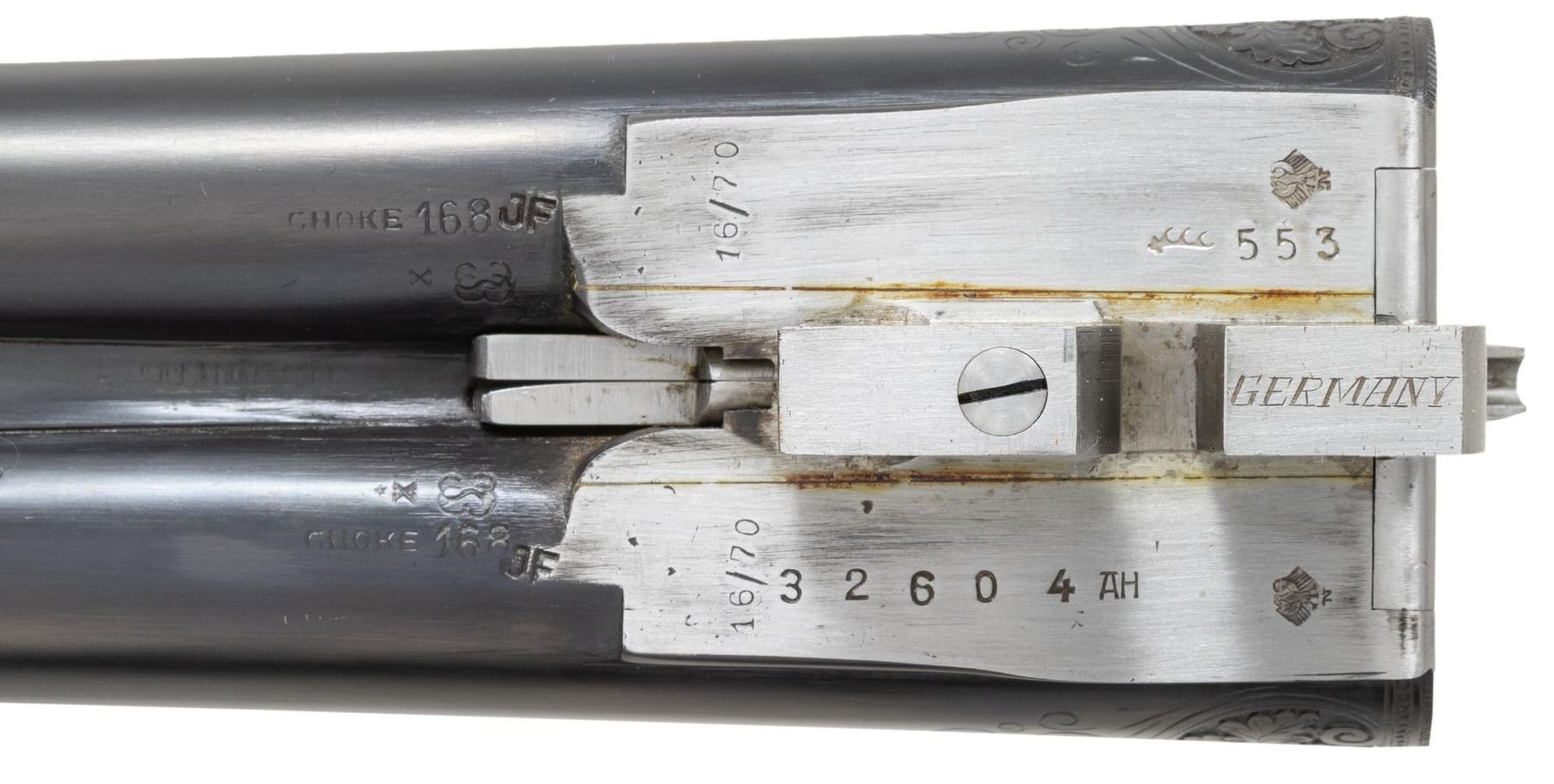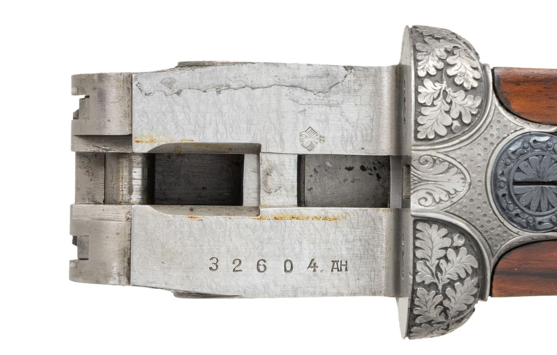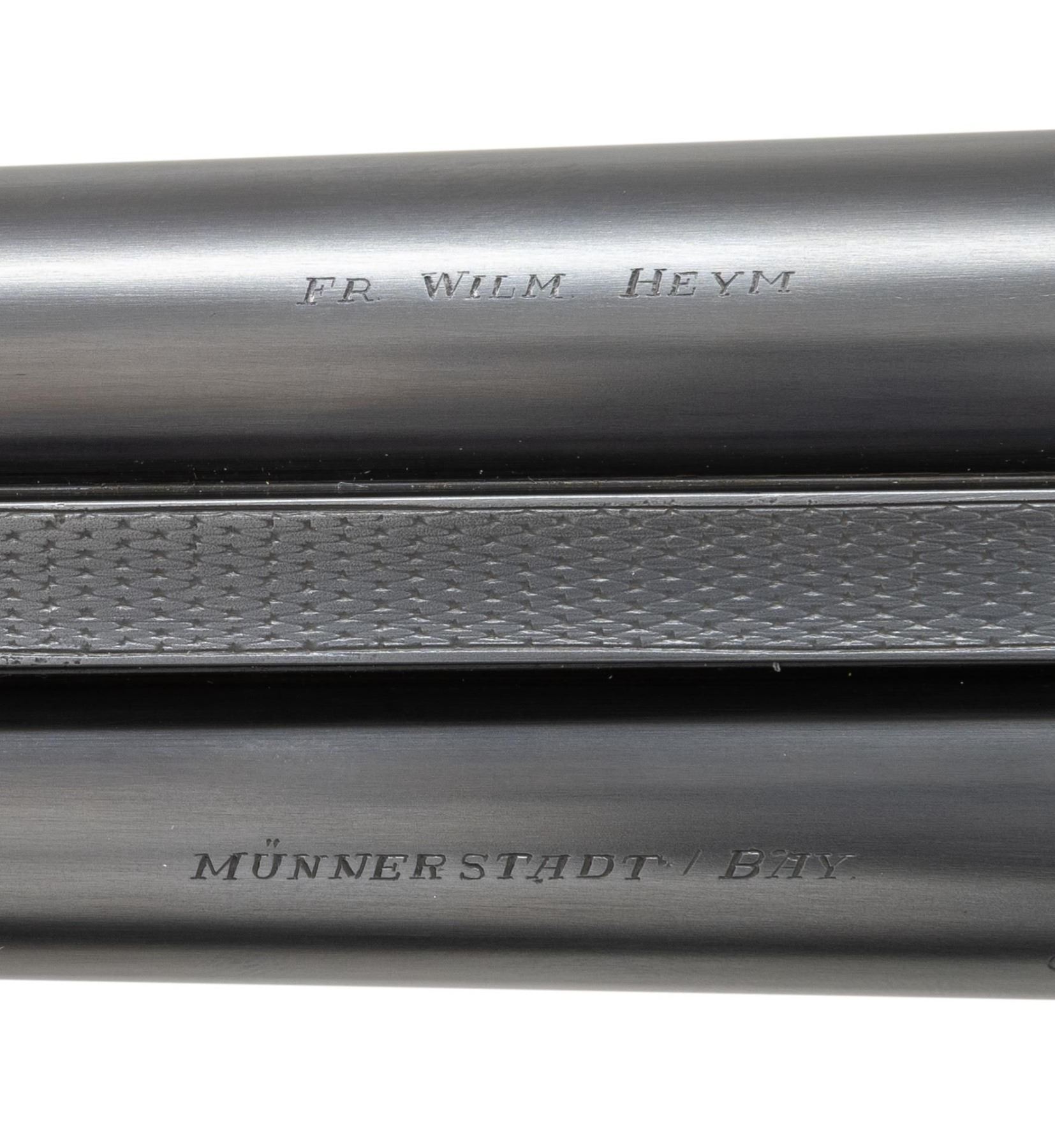 GUN . Cal. 16 Ga. 2-3/4". S# 32604. The 27-1/2" dovetailed barrels with narrow matted rib are engraved "FR. Wilm. Heym." "MUNNERSTADT/BAY." on tops. Breech ends are deep relief engraved with 1-1/2" triangles of oak leaves and acorns. Barrel flats are stamped with 2007 German nitro proofs for 2-3/4" chambers. Rear lump is engraved "GERMANY". Coin finished sidelock action features non-automatic safety, hidden third fastener, bushed strikers, arrow tumbler end cocking indicators and double triggers (front articulated). Action is deep relief engraved with near full coverage beautifully carved oak branches with leaves and acorns. On bottom of action they surround two flying snipe. This fine work is surrounded by relief geometric borders. Lock plates are engraved with oak leaves surrounding game scenes with a pair of foxes sneaking up on some ducks on left plate and a pair of pointers pointing and honoring some grouse on right. Blued top lever is also relief engraved with oak leaves with thumb piece pierced to match. Trigger guard with more leaves has scampering hare on bow. S# is on tang. Very nicely veined and lightly figured dark European walnut sunburst horn capped pistol grip buttstock measures 14-1/2" over brown "Decelerator" pad. Stock features arched comb, intricate pattern grip checkering and nicely carved drop points. Matching splinter ejector forend has Anson release. MEASUREMENTS: BBLS: Bore Diameter: L .663. R .663. Restriction: L .012 (mod). R .005 (IC). Wall thickness: L .032. R .026. STOCK: DAH: 2-15/16". DAC: 1-7/16. CAST: neutral. LOP: 14-1/2". WEIGHT: 6 lb. 1 oz. CONDITION: exceptionally fine as lightly refinished. It appears that gun has suffered from poor storage at some time. Barrels retaining essentially of a "best" re-black; sharp details somewhat softened. Action beautifully coin finished; left side engraving is sharp and clear. Some details on right side such as pointing dog and some oak leaves show some cleaned pitting. There is also some light cleaned pitting on trigger plate. Stock finish is likely original with only a few minor handling marks. Checkering is still light in color with little wear. Bores are bright and shiny throughout. Mechanically crisp. There is a 1/2" stress crack behind left lockplate and a minor 1/8" stress crack behind top tang. A beautiful small bore gun. PROVENANCE: From the Private Collection of Berrien Moore III. (25-6026/MGM). MODERN. $4,000-8,000.