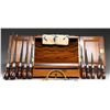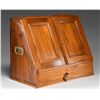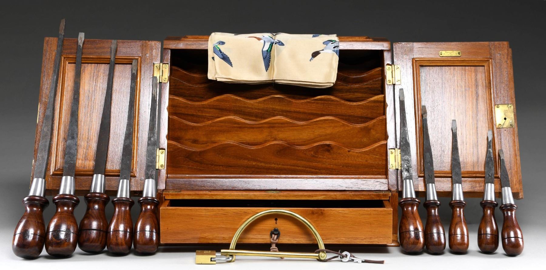 LUXURY SCREW DRIVERS, LOCKS, AND MORE. Imagine the stateliness of writing the evening dispatches of a bygone era on this rich warm rosewood British Campaign Secretaire. It has 6 beveled and scalloped teak dividers that are removable to facilitate a personalized fit. Writing surface can be pulled out from above the 2" drawer. Handcrafted with mortise and tenon joints and sculpted molding on both sides of the doors. The top is angled so that the doors remain closed during transportation and the top, as well as the bottom, can be locked until a hand filed key unsecures your papers and possessions. Recessed brass handles are attractive and allow for easy transport. There is an interior brass label that reads "Roosevelt AND Drake". Also included in this lot is a set of 10 hand forged and finished screw drivers with turned rosewood handles. The screw driver shaft is hand forged iron with a hand ground tip. There is a steel collar between the shaft and the handle. Rounding out this choice lot are 3 solid brass gate locks, each with a padlock and 2 keys. And finally, a tan colored silk women's scarf decorated with flying ducks. CONDITION: the secretaire is in like new condition but does show light storage wear. The screw drivers, locks, and scarf are in like new condition. PROVENANCE: from the renowned collection of quality sporting arms from Lewis Drake together with inventory of Lewis Drake Associates. (02-23565-46/BF). $300-500.