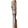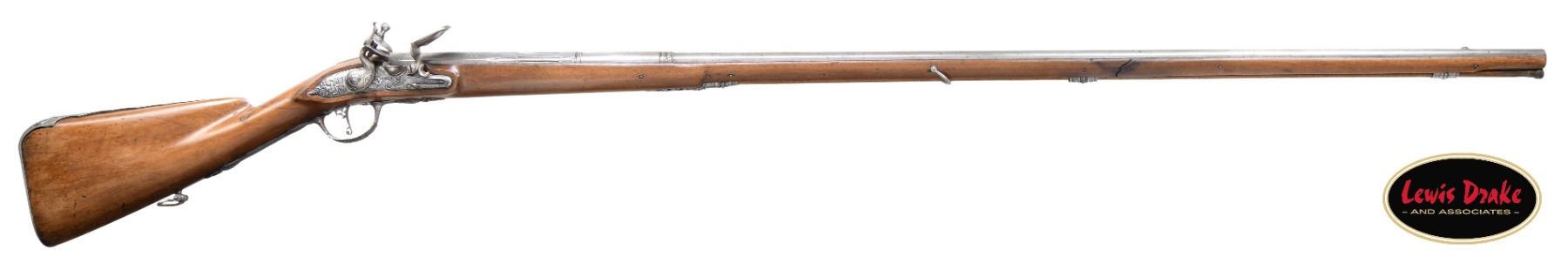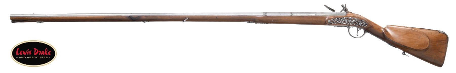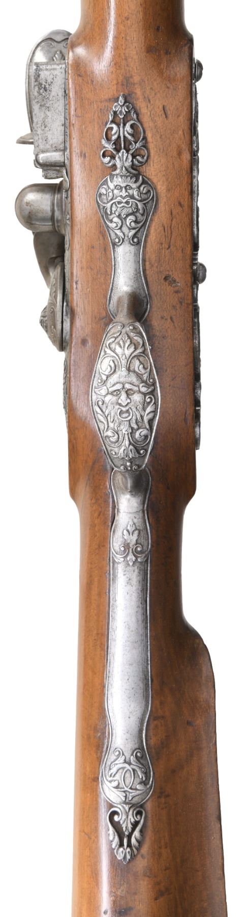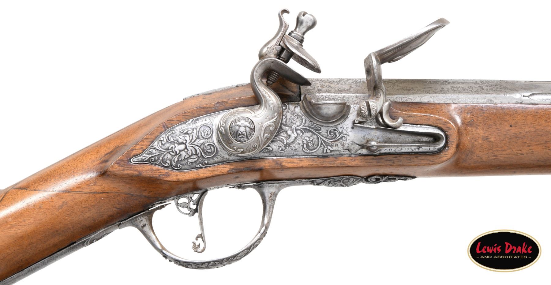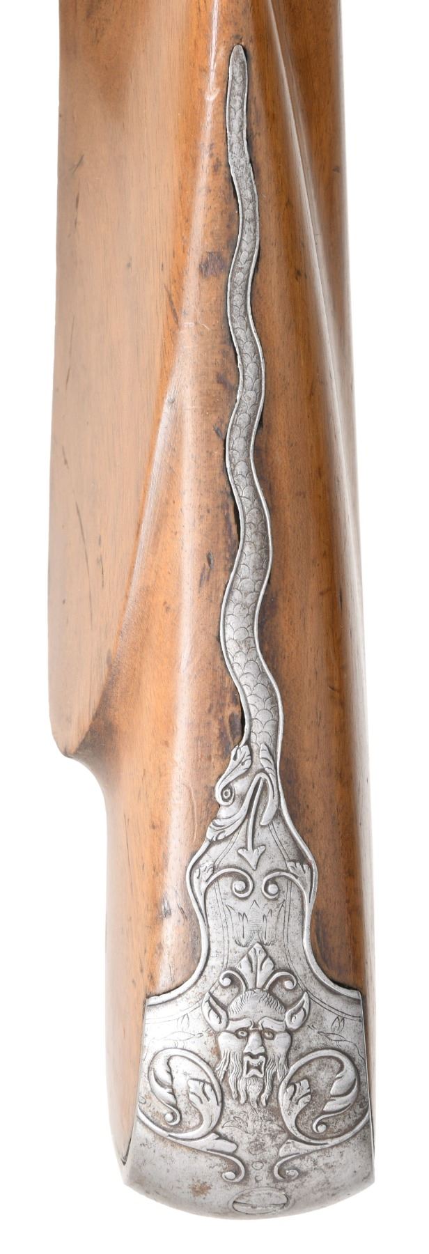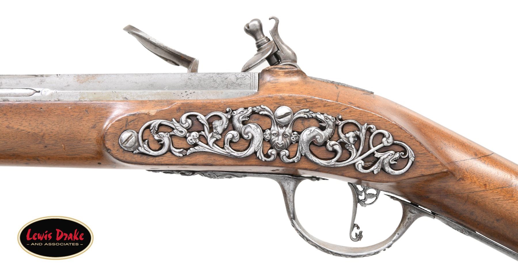 PAUL POULCE OF SEDAN, ARDENNES, FRANCE. Cal. 16 Bore. S# NSN. Paul Poulce is a member of a gun making family working in North Central France from the 1680's to about 1720. This beautifully decorated flintlock fowler has 47-1/2" barrel with concave octagon breech section with flute carved transition to sixteen sided; then to round through two wedding bands, front with relief carving of leaves and a face. Octagonal section shows some light engraving of warrior and cherubs. Lock with rounded and slightly arched plate is fitted with inset round pan, non bridled friction frizzen and feather spring with bulbous finial. Round bodied serpentine cock mounts with bolt having head in the form of a grotesque face. Lockplate is deep relief chased with open flowing scrolls in front of and on the cock. A large Green Man face with two serpent tendrils of hair is on tail. Front of lock on chamfer around feather spring is engraved "PAVL POVLxx A SEDAN". Lock internals show file decoration plain. Fruitwood stock extends to muzzle and features large dished right hand cheekpiece and is pinned to barrel. Beautifully full relief engraved iron mounts include large buttplate with devil's face surrounded by scrolls at heel and long tang in the form of a serpent with arrow shaped tongue. Trigger plate and trigger have multi-pierced decoration of flowers and scrolls. Terminal curl of trigger is in the form of a sea monster. Trigger guard has Green Men on bow and front finial. Multi-pierced sideplate has central Green Man flanked by scrolling dogs heads, grotesque faces and sea monsters. A hickory ramrod with horn tip is held by two multi-beaded pipes with matching thimble with finial depicting a Green Man and full bodied imp. The quality of all this work borders on incredible considering the amount of work required and the tools available at the time. CONDITION: good. All metal cleaned to pewter gray over some very light scattered pitting. Stock with old refinish has wood somewhat under metal especially on comb and shows repairs at wrist with lateral cracks and later inlet patch at top of grip. Bore is dark and rusted. Lock is good; fully operable. PROVENANCE: from the renowned collection of quality sporting arms from Lewis Drake together with inventory of Lewis Drake Associates. (01-26103/MGM). ANTIQUE. $4,000-7,000.