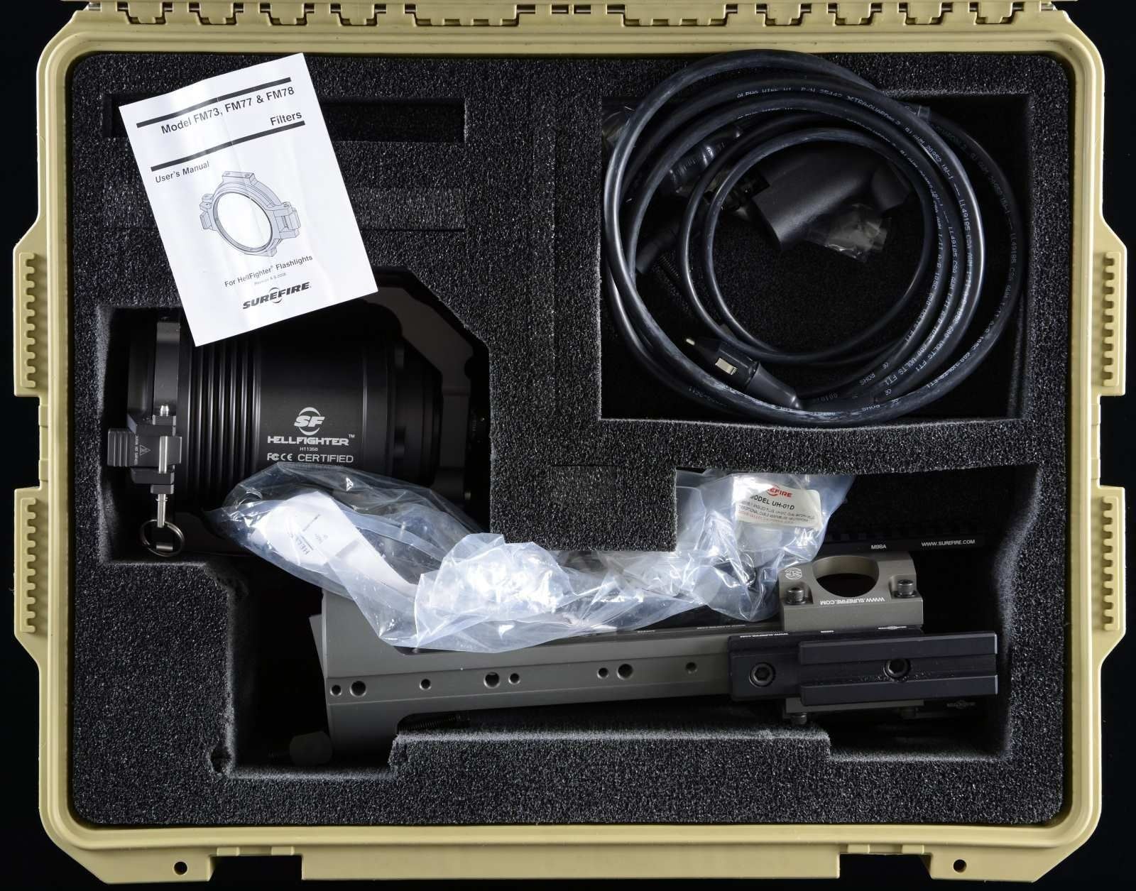 Large high quality Surefire Hellfighter searchlight. Ideal for crew served or heavy weapons such as the M2 .50 Cal. High intensity discharge lamp that generates 4500 lumen, 730,000 candela beam w/ range of over 1600m. UNATTACHED ACCESSORIES: factory hardcase w/ foam inserts, manual, paperwork, two cables & M98B mt. w/ picatinny rails. CONDITION: all aspects near excellent. (02-21275/MJC). $2000-3000.