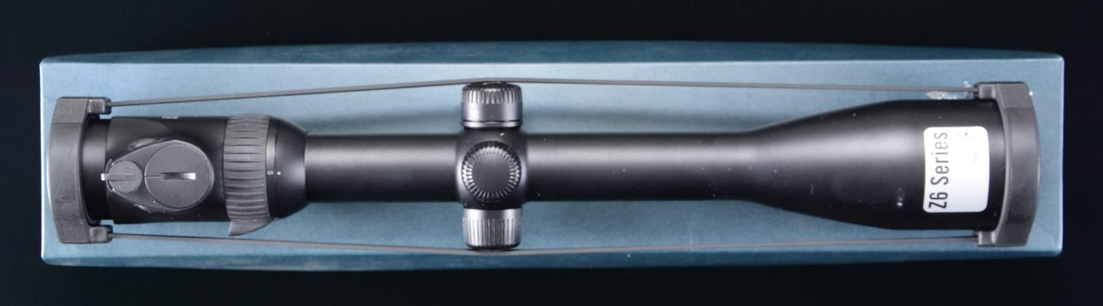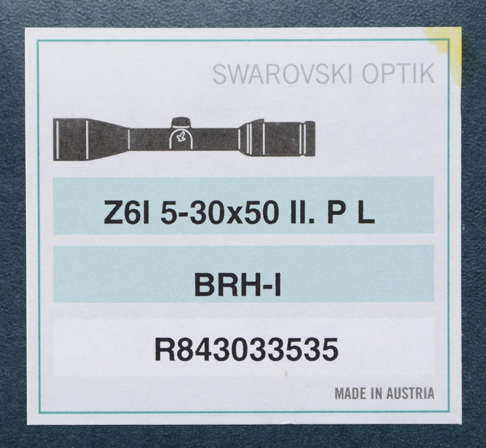 WITH MATCHING FACTORY BOX. Z6i 5-30x50mm II P L scope manufactured by Swarovski in Austria. Black anodized aluminum construction with illuminated optic and BRH reticule. Exterior retains its factory "Z6 Series" sticker. UNATTACHED ACCESSORIES: matching factory box containing factory paperwork. CONDITION: near new, with the exterior exhibiting few minute superficial marks from handling a storage. Scope retains a clear and sharp optic. Box shows some mild exterior wear, but otherwise remains sturdy and serviceable. PROVENANCE: The Collection of Gun Sport Ltd. owned by Jon R. Thomas. (02-20672/MLW). $2,000-3,000.