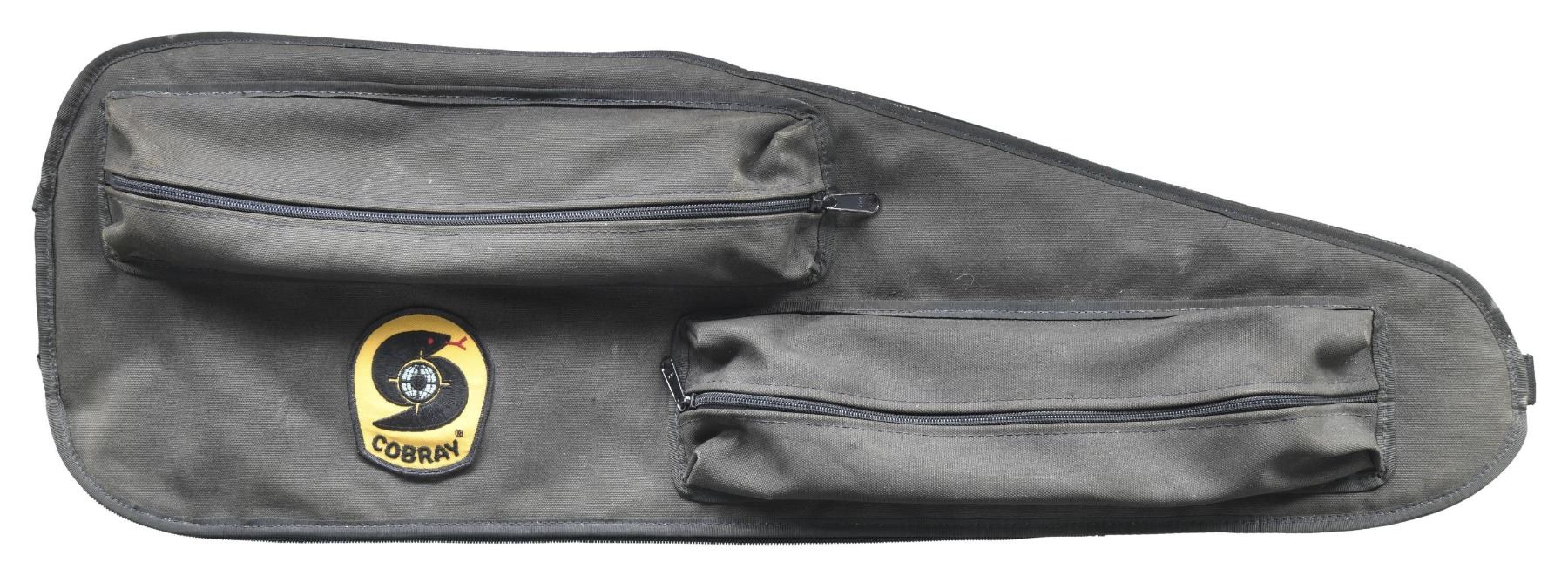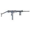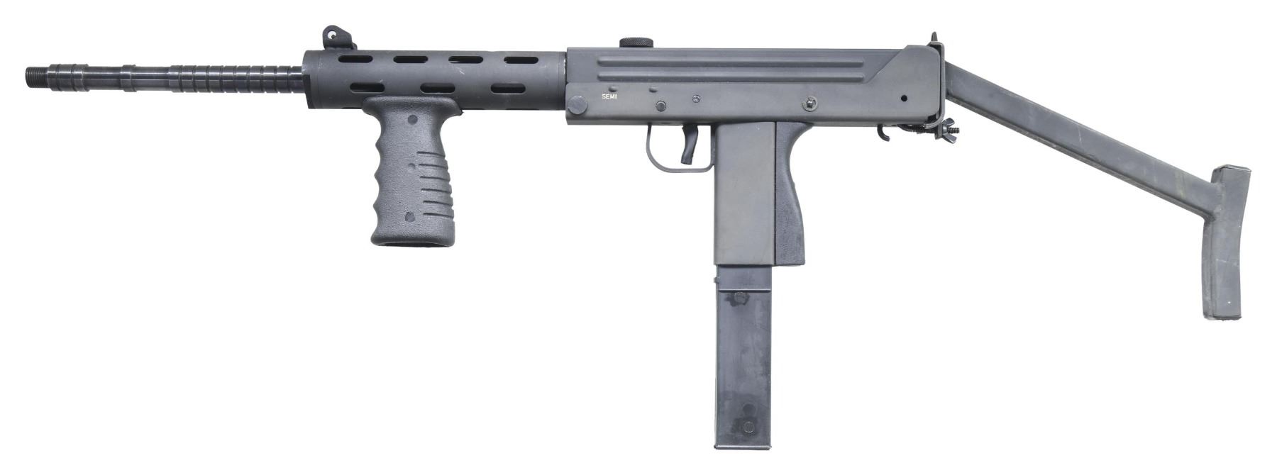 Cal.9mm. S# 88-0012668. Bbl. 17". Manufactured 1988. An S.W.D. M11/NINE Carbine. Very similar to the traditional M11/NINE Pistol or SMG, but w/ a 17" barrel instead of the little traditional one. Barrel is grooved w/ several cooling fins in front of the 6" slotted handguard, which bears a vertical pistol grip below the barrel. Shoulder stock is a rigid version that crudely clamps on at the rear of the receiver & secured w/ a threaded "J" bolt & wingnut. body of the carbine largely emulates the pistol. Lower receiver / trigger group is marked "M-11/NINEMM / S.W.D. INCORPORATED / ATLANTA, GA. U.S.A.". The upper receiver is marked w/ Cobray snake & globe logo in front of the charging handle. Front sight is a protected post. Rear sight is a fixed peep & notch in an extension above the receiver. MAGS: 1 Zytel 32 rd. UNATTACHED ACCESSORIES: Black nylon storage bag w/ Cobray logo patch. CONDITION: Finish coverage complete & consistent w/ typical drag lines associated w/ "stacked storage". Bright bore w/ strong rifling. Fire control mechanism appears to function correctly when cycled by hand. (25-2411/JZ). MODERN. $500-800.
