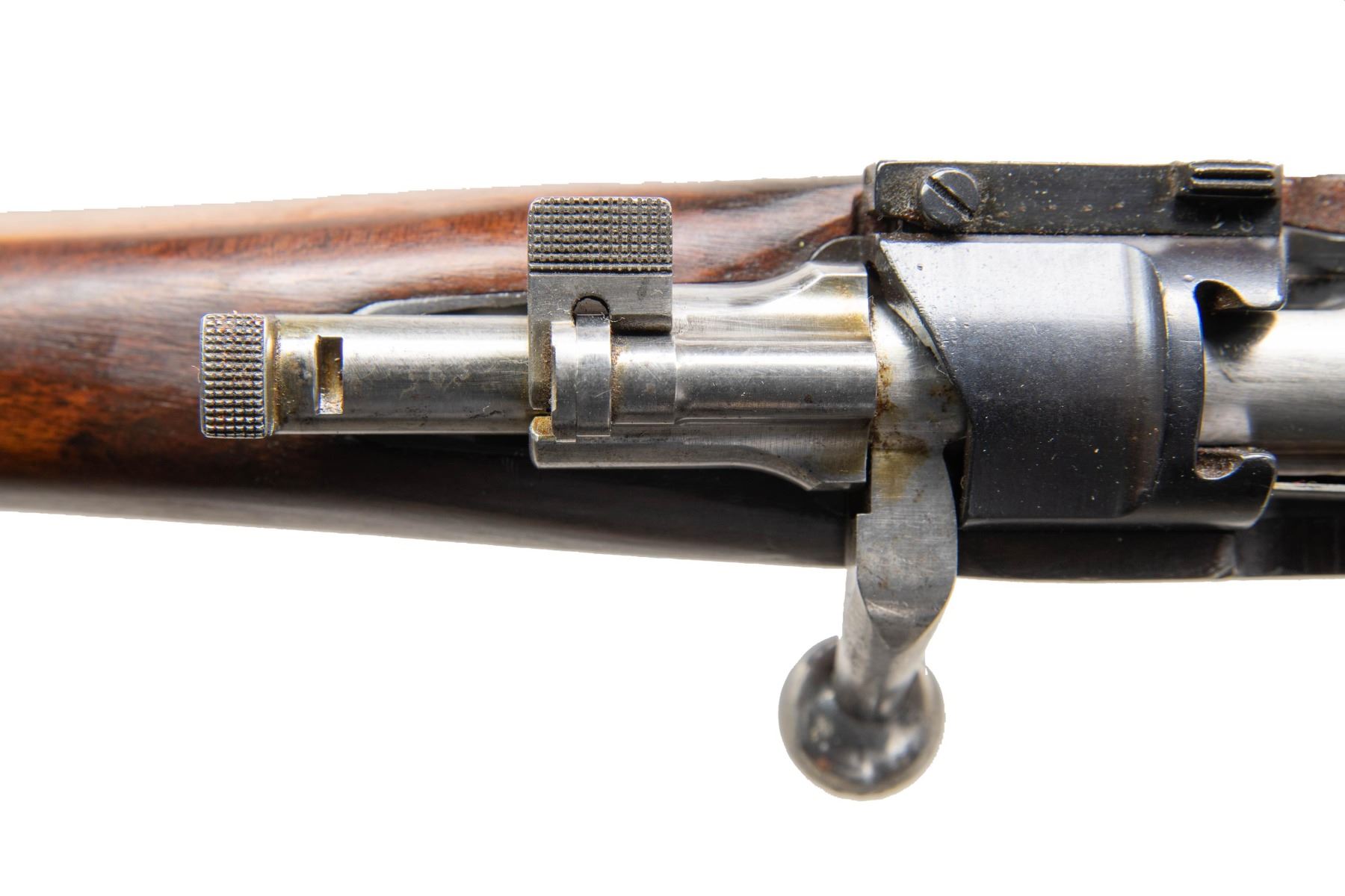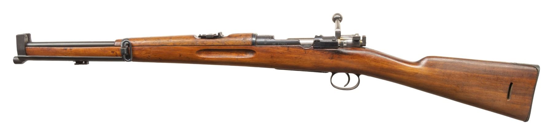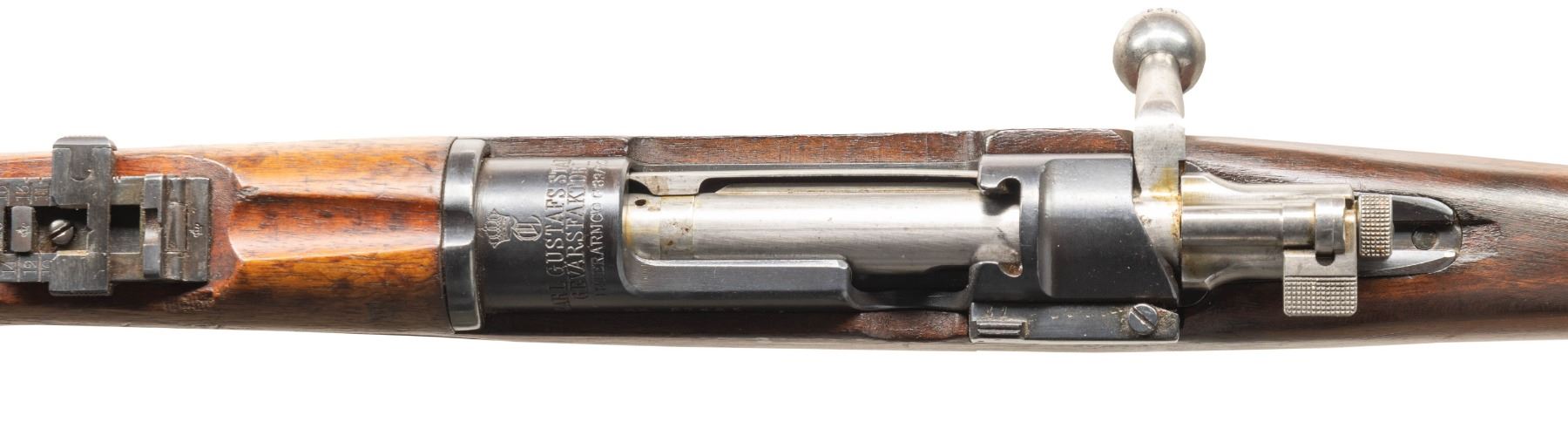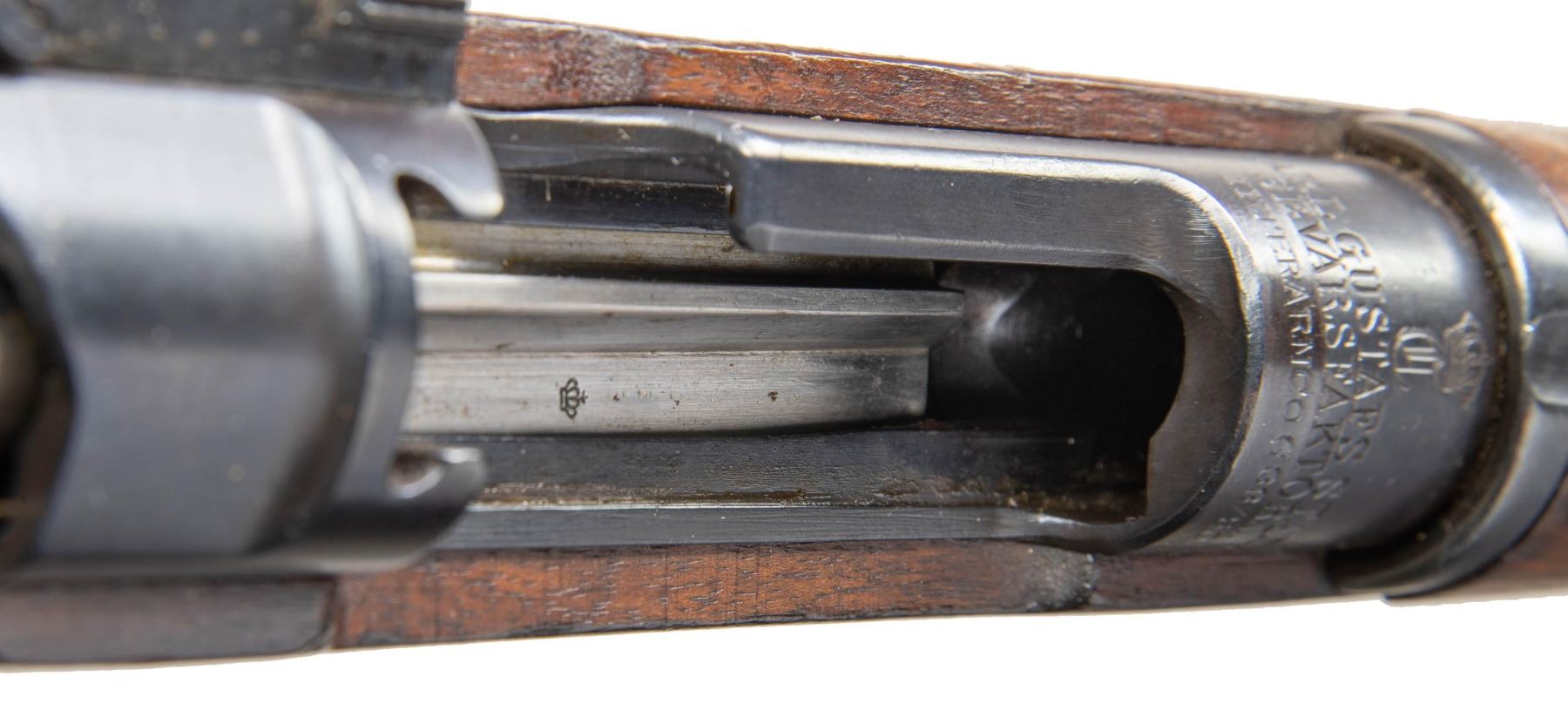 Cal. 6.5x55. S# 57442. Bbl. 18". Blade front sight with protective ears. Ladder rear sight graduated to 1600m. Visible parts are all mismatched. Swedish M94/14 carbine imported & marked by Interarms. Receiver ring has Carl Gustafs marking with "INTERARMS CO G33/50" marking where date was. Buttplate has matte blue refinish & balance of metal has arsenal rework blue. Walnut stock set with left side sling provisions. CONDITION: stock appears to be lightly sanded with buttplate proud of wood, some staining, dings & scattered handling marks. Metal retains 92% arsenal rework type blue with some handling marks, edge wear, light oxidation & fading on the exposed edges. Action functions properly when hand cycled. Bore shows some scattered frosting but strong rifling. (25-5621/MJC). CURIO. $500-700.