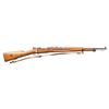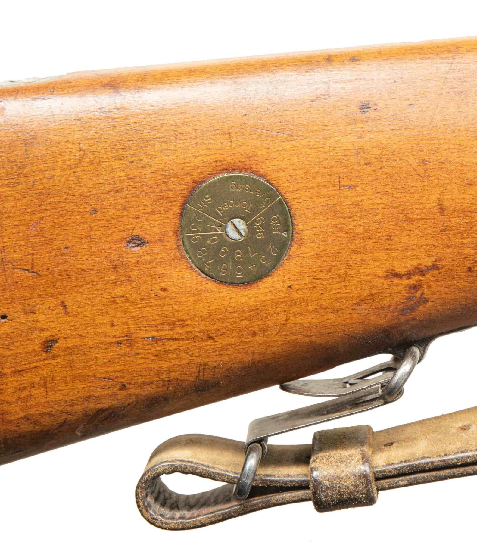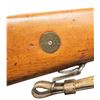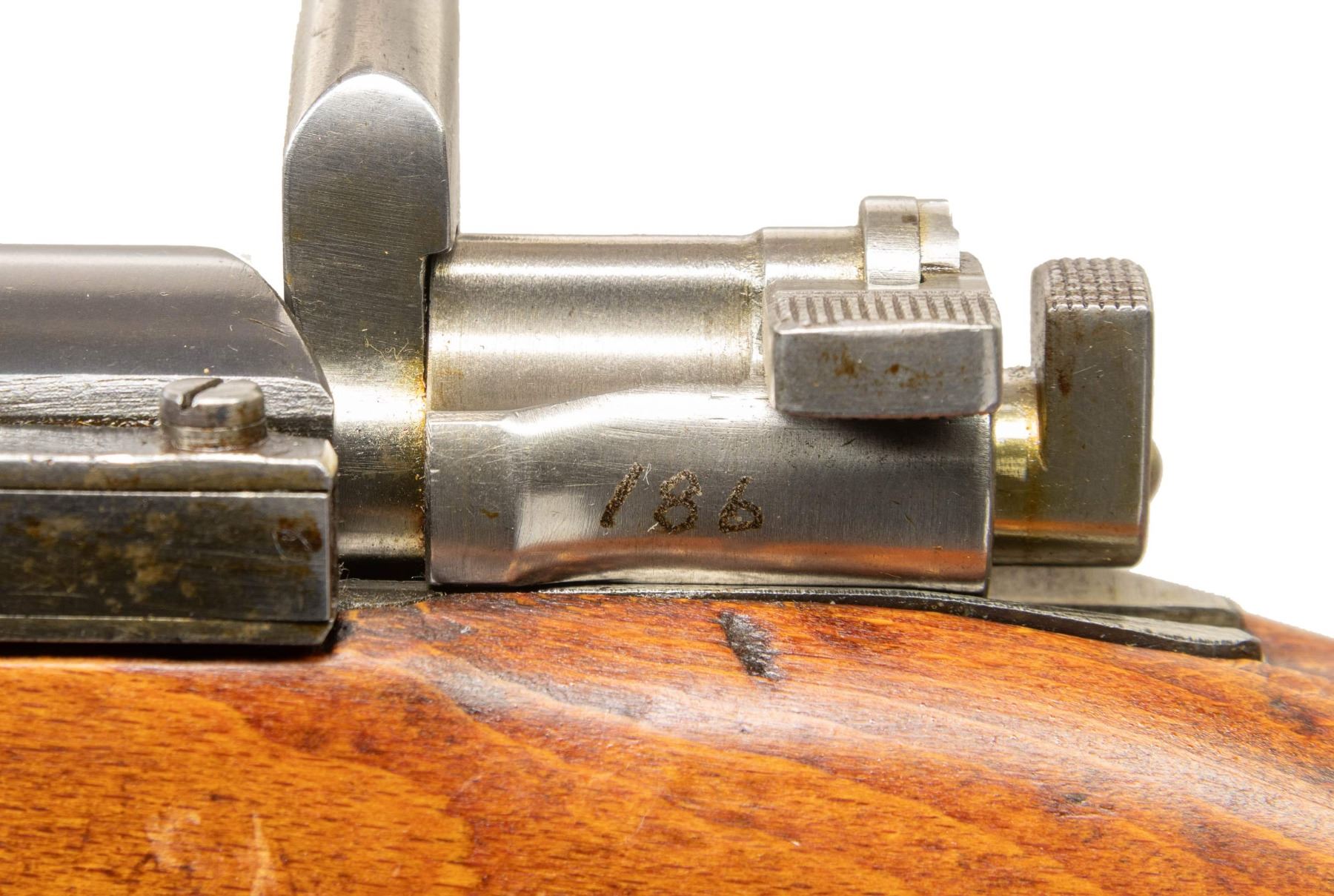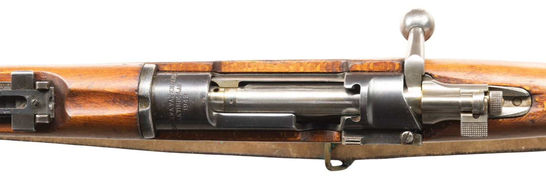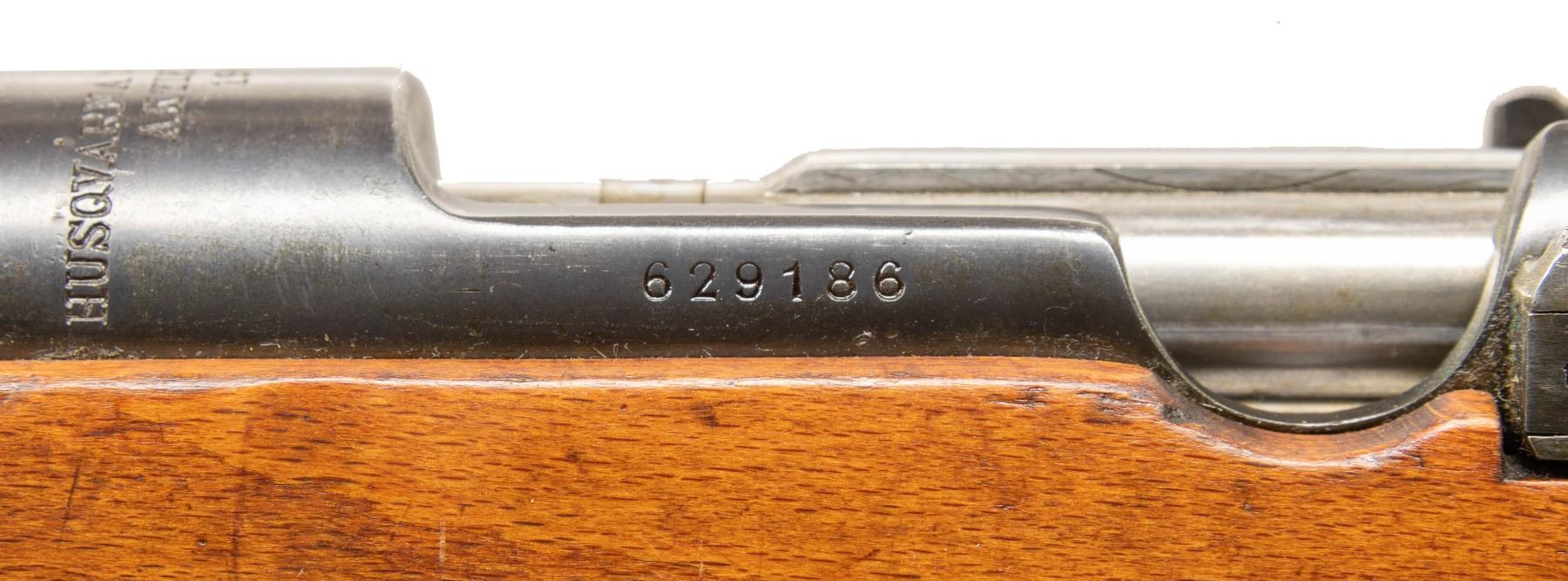 Cal. 6.5x55. S# 629186. Bbl. 23 1/2" with Century import marking. Blade front sight. Ladder rear sight graduated to 600m. Matching numbers on receiver, buttplate & bolt parts. Some bolt parts are electropencil matching & other parts appear arsenal force matched. Remaining visible part are unnumbered. Receiver ring has Husqvarna markings with 1942 date. Blued finish. Beech stock set with bottom mounted sling swivels & leather sling. Cleaning rod present. Stock disc has triangle over "1" for bore condition. CONDITION: lightly sanded stock set has added finish with a small crack behind upper tang, scattered dings & handling marks. Metal retains 30-40% arsenal blue with most remaining blue on action, some finish overrun, overall fading to silvery gray, edge wear, handling marks & light oxidation. Action functions properly when hand cycled. Bright near excellent bore. (25-6599/MJC). CURIO. $300-500.