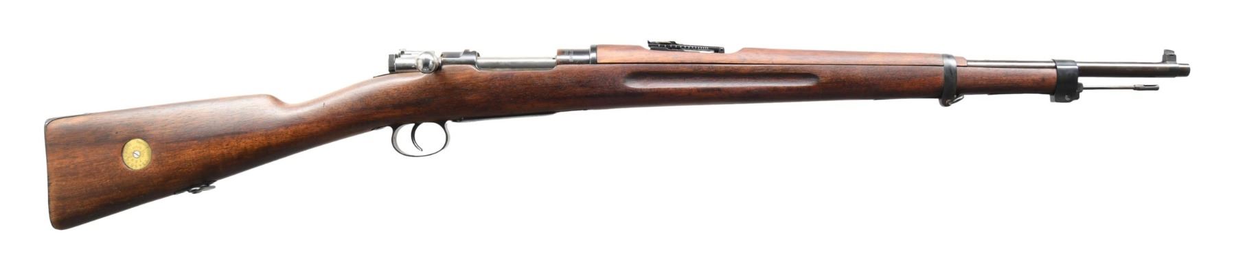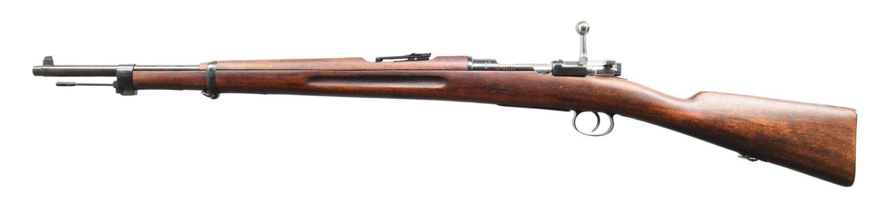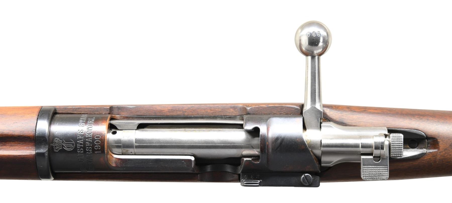 Cal. 6.5x55. S# 63068. Bbl. 24" with CAI import marking. Blade front sight. Vasteras rear sight. All visible matching numbers. Swedish M96 rifle arsenal converted into M38 short rifle configuration. Receiver top has Carl Gustafs markings and a 1900 date. Post-import reblue finish with polished bolt assembly. Hardwood stock set with bottom-mounted sling swivels and lighter colored handguard. Cleaning rod is present. Stock disc shows a triangle over "1" for bore condition. CONDITION: refinished stock set has added oil with a few scattered handling marks. Cleaned bolt assembly shows some cleaned light pitting and minor oxidation. Balance of metal retains 85% reblue with some light oxidation and scattered fading to brown. Action functions properly when hand-cycled. Bright, very good+ bore. (24-5118/MJC). CURIO. $300-500.