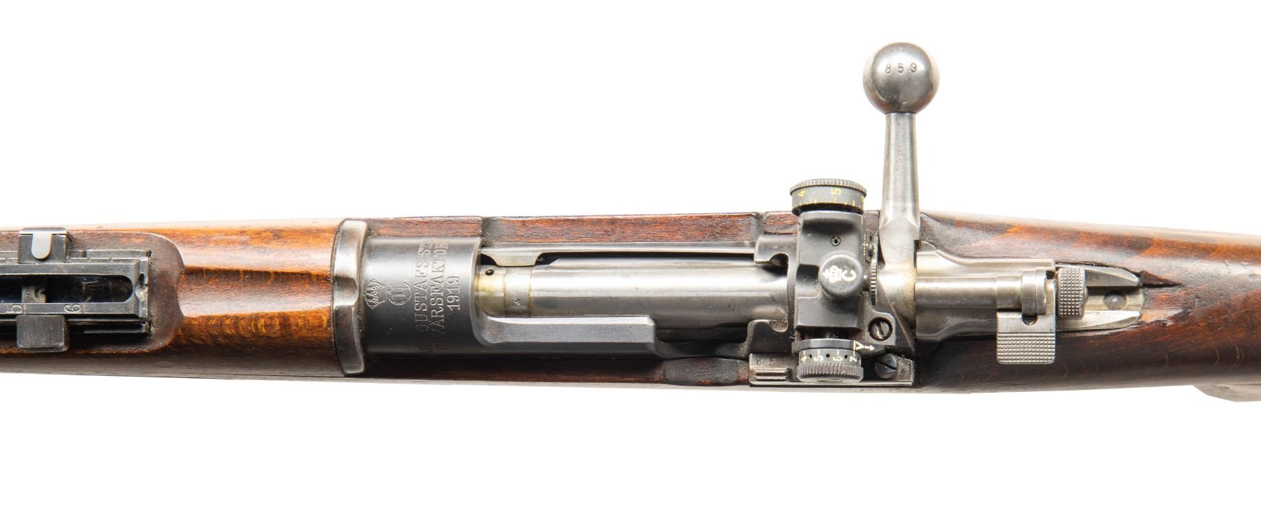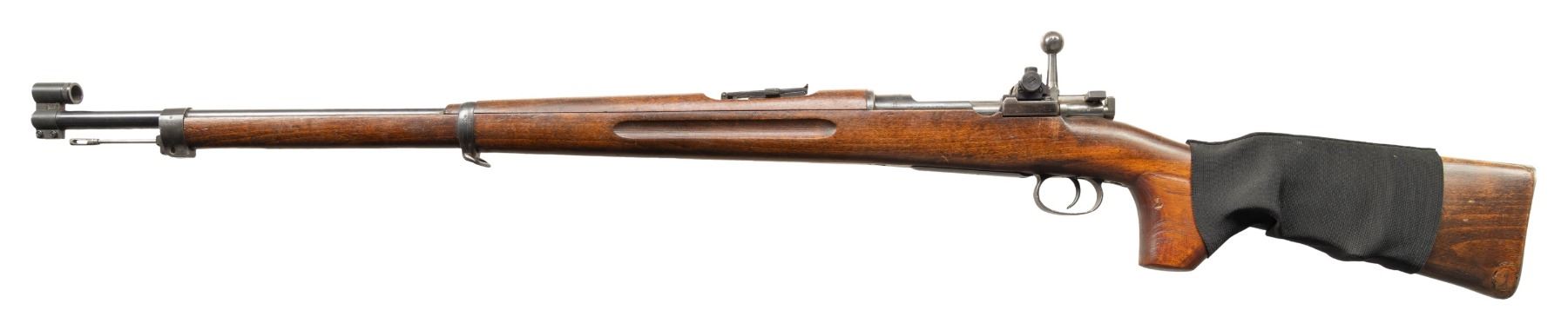 Cal. 6.5x55. S# 475850. Bbl. 29" with Century import marking. Diopter sights with additional M96 ladder rear sight. Cleaning rod & ladder rear sight are mismatched but all other visible numbers are matching with some appearing arsenal force matched. Receiver ring has Carl Gustafs marking with 1919 date. Left side of receiver has boxed Finnish Army "SA" stamp. Arsenal blue finish. Beech stock set with bottom mounted sling swivels, correct FSR pistol grip & slip on sleeve ammo holder. CONDITION: stock has added finish with a few small holes on right side of butt where a date plate once was, a knot on left side of butt, a few small chips, scattered dings, scratches & handling marks. Metal retains 92% arsenal rework blue with what appears to be a penciled name on ladder rear sight base, scattered fading, edge wear, thinning, light oxidation & handling marks. Ladder rear sight elevator is frozen & may need attention. Action functions properly when hand cycled. Very good bright bore with some light frosting but strong rifling. (25-5501/MJC). CURIO. $500-700.