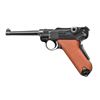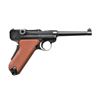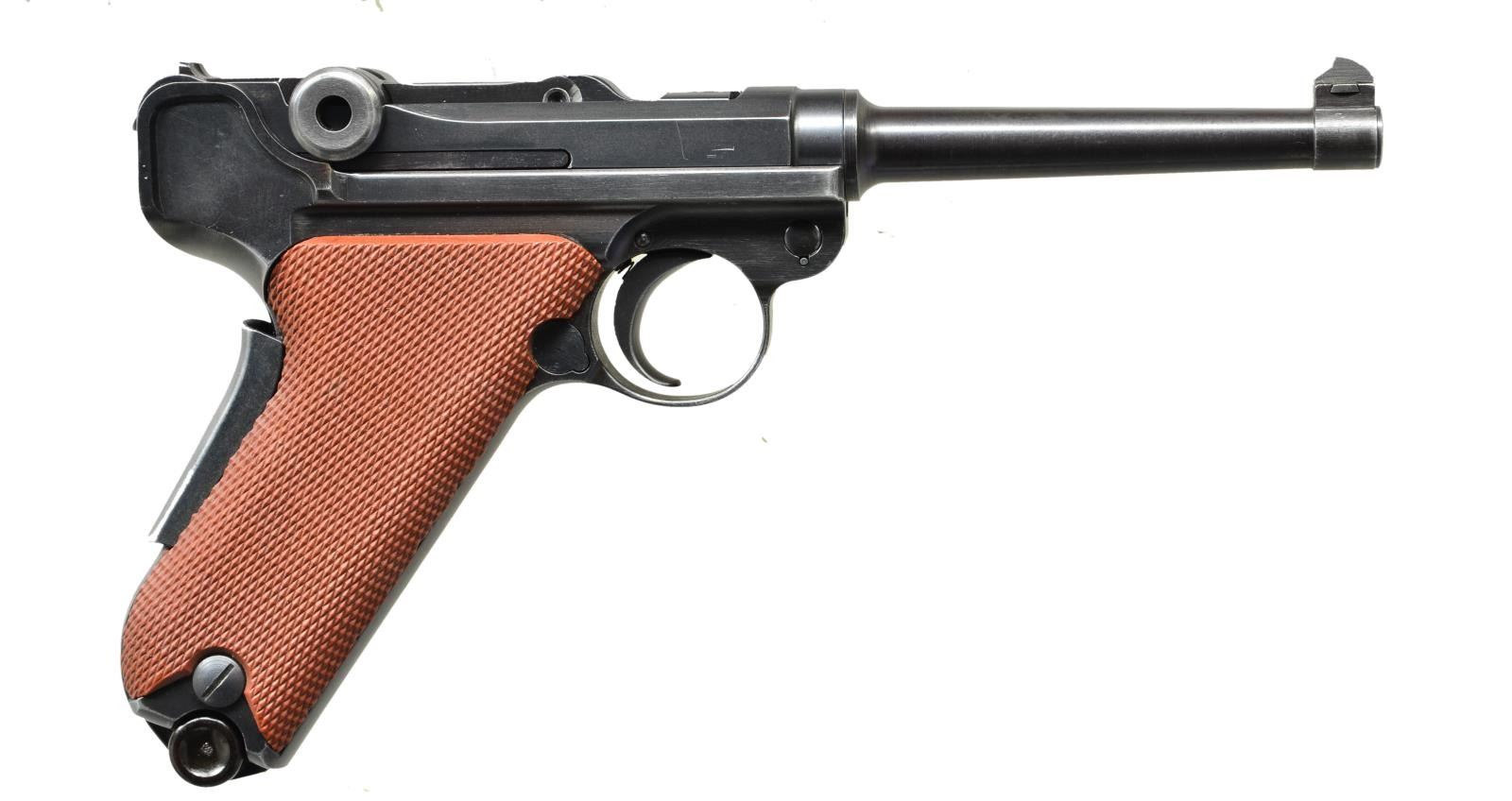 Cal. 7.65mm (30 Luger). S# 50568. Bbl. 4 3/4" w/ saw tooth style sight, matching number plus intertwined BP & cross proofs. Mfg. 1930-1947 w/in S# range of 50001 to 77941; exactly 27,940 units. Often referred to as Model 1906/29 having distinctive straight frontstrap & long stamped metal grip safety. Grips are 'red' plastic, smooth toggle knobs, simplified safety lever, boxed "+M" frame proof & cross in shield on toggle. Extractor retains "GELADEN" German marking; "F27" w/ cross on under side. Under side of each rail above trigger has portion of import mark. Matching numbered receiver, side plate & rear toggle. MAGS: 1 correct near excellent tin plated 8 rd. w/ dark brown plastic base. CONDITION: very good to near excellent as is common w/ Swiss Lugers due to the extraordinary care given them by the Swiss. Very minimal high point & function wear. Near excellent bore & grips. (22-5158/NW). CURIO. $1,500-2,000.