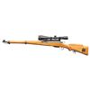 Cal. 7.5x55. S# 965791. Bbl. 25" with Century import marking. Standard K31 front sight. Rear sight removed & has aftermarket scope mount that appears to be a none drilled & tapped type with Simmons WhiteTail Classic 6.5-20x power scope. Scope has duplex crosshair reticle, very good optics & bikini cover. Blued finish. Beech stock set with reversed front sling swivel & aftermarket leather cheekpiece. MAGS: 1-6 rd. matching. CONDITION: sanded stock set has added finish with a small crack at heel, some handling marks & dings. Metal retains 50% arsenal & touch up blue with bands being a smoky gray color, notable edge wear on receiver & some light oxidation. Action functions properly when hand cycled. Bright near excellent bore. (25-5619/MJC). CURIO. $300-500.