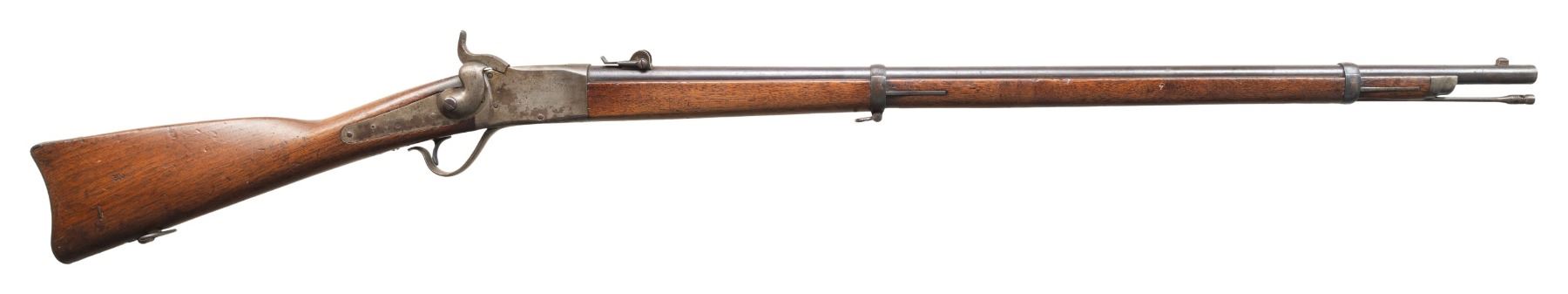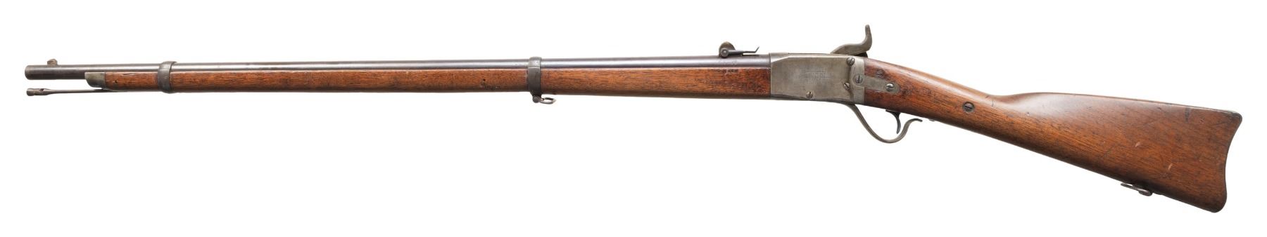 Cal. 41 Swiss RF. S# 14020. Bbl. 33". Blade front sight. Swiss style adjustable rear sight graduated to 800yds. Matching numbers on forend & bbl. Other parts appear unnumbered. Case colored action. Blued bbl. Walnut stock set with bottom mounted sling swivels. Right side of butt has partially faded crown "M". Ramrod present. CONDITION: stock set has arsenal rework appearance with a large chip missing on underside of forend, scattered dings, scratches & handling wear. Action is mostly a smoky gray color with traces of case colors, oxidation & usage marks. Bbl. retains most of its arsenal blue with some band removal dings, overall fading, oxidation & some edge wear. Action functions properly when hand cycled. Very good bore with strong rifling but some light pitting.. PROVENANCE: From the PMRB Collection. (01-28434/MJC). ANTIQUE. $600-900.