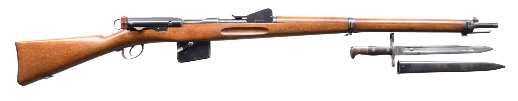 MILITARY RIFLE W/ BAYONET. Cal. 7.5 Swiss. S# 46239. All visible numbers match. Bbl. 30.7" rifled w/ 3 grooves. Tangent rear sight graduated to 3,000 meters. Blade front sight w/ an added brass bead. 12 rd mag. w/ cutoff. Bayonet lug & stacking bar are present. Walnut stock set w/ legible acceptance marks. UNATTACHED ACCESSORIES: 11 3/4" fullered blade bayonet w/ added retaining stud in right fuller. Right ricasso marked "WAFFENFABRIK NEUHAUSEN". Smooth walnut grips retained by 2 rivets. Blued steel scabbard w/ leather retaining strap. Bayonet has been lightly sharpened w/ moderate wear turning gray & patina. Grips have moderate wear. Scabbard appears to have arsenal rework blue finish w/ light oxidation. CONDITION: stock set has light to moderate wear & handling marks throughout. Metal has 70% original thinning blue w/ wear & spots of light oxidation. Very good shiny bore. (24-6512/RW). ANTIQUE. $450-650.