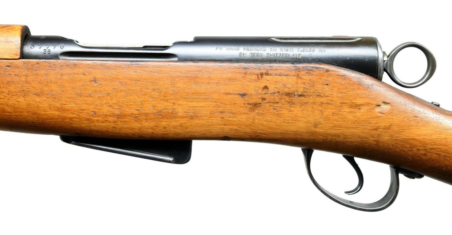 Cal. 7.5 Swiss. S# 37770. Bbl. 23 1/3". Matching numbers on receiver, bolt, front sight & mag. Mfg. 1915. Top of receiver has "P" marking. Left side of receiver has "36" marking below serial. Rear left of serial has PW Arms import marking. Blade front sight w/ protective ears. Tangent rear sight graduated to 1500m. Unmarked walnut stock set w/ left side sling swivels. MAGS: 1-6 rd. matching numbered to gun. UNATTACHED ACCESORIES: brass muzzle cover. CONDITION: stock set shows scattered dings & handling wear. Buttplate shows a few patches of pitting & some oxidation. Metal retains 92% arsenal rework blue w/ some light oxidation. Very good bore w/ some cosmoline. (23-2687/MJC). CURIO. $400-600.