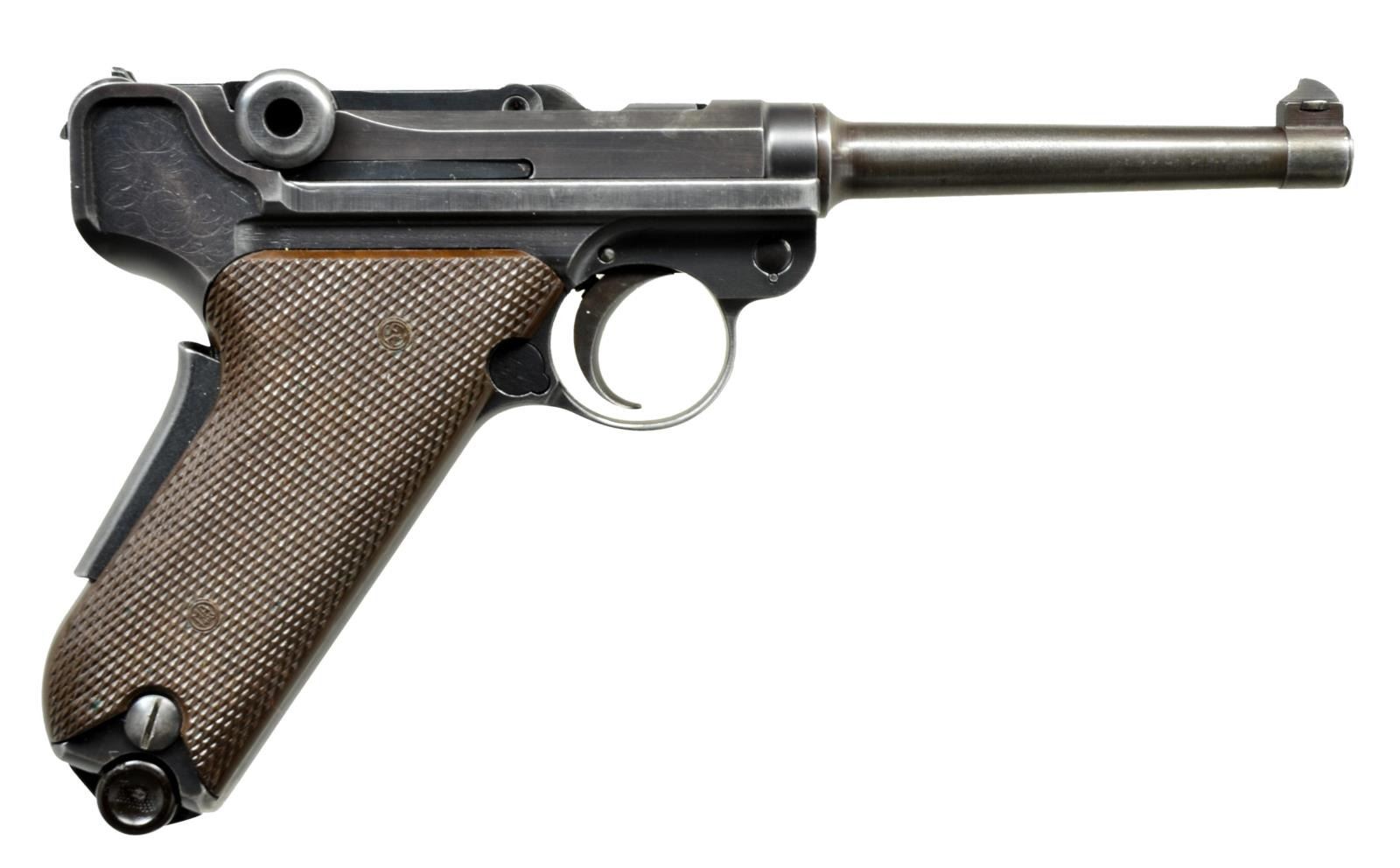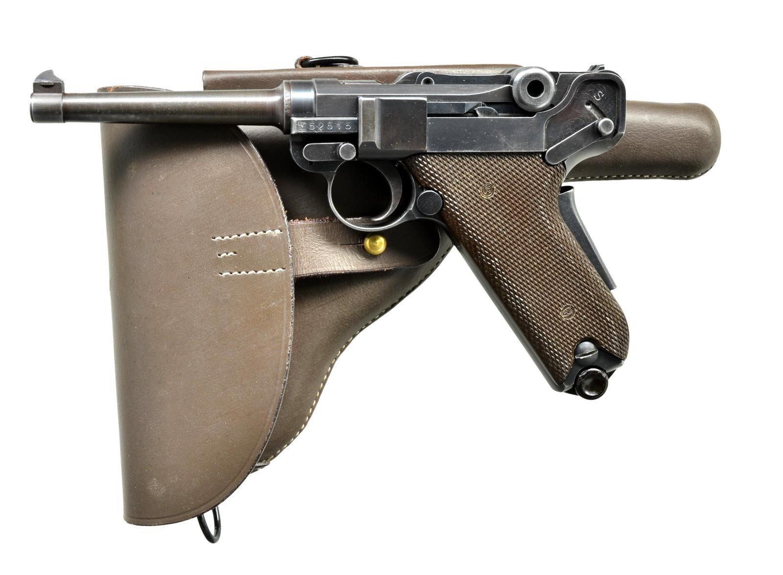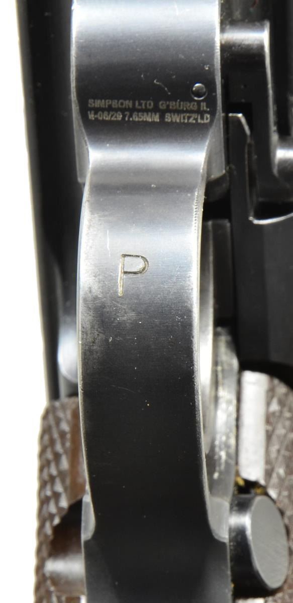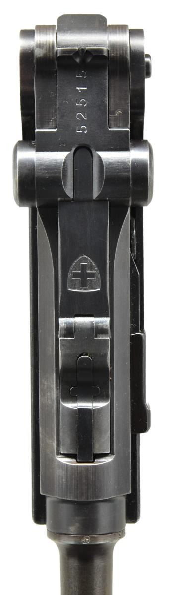 Cal. 30 Luger. S# 52515. Bbl. 4 3/4" w/ saw tooth shaped front sight blade & notched toggle rear. Mfg. 1930-1947; S# 50001 to 77941 by Bern in Switzerland. Often called Model 1906/29 Swiss due to its 1906 pattern features such as grip safety. Military variation w/out P prefix of S# as used on commercial models. Matching full S# on frame, bbl. & rear toggle. Receiver lug numbered 515. Back of sideplate numbered 290 plus "CN"; most parts have Swiss cross plus many have 2 letters such as "CG" on front toggle, "CV" on extractor & "CG" on back of takedown lever. Breech block has circled "K". Bottom of frame in front of trigger guard has extremely sm. import marks; face of trigger guard has "P" indicating Swiss Gov't. release. Proper all blued finish w/ no strawed components plus brown plastic checkered grips. MAGS: 1 near excellent 8 rd. P marked Swiss w/ brown plastic base secured by 2 pins. UNATTACHED ACCESSORIES: near excellent reproduction dark brown flap holster having strap loops, mag. pouch on edge, dbl. belt loops plus stud & strap retention. CONDITION: very good overall appearance w/ arsenal quality refinish of less gloss than original; likely done before Gov't sale. Slight high point wear throughout & thinning finish of bbl. & portions of receiver; sideplate appears 99% finish. Slight beginning gray patina tone in grip area. Near excellent bore & grips. (21-3541/NW). CURIO. $900-1,400.