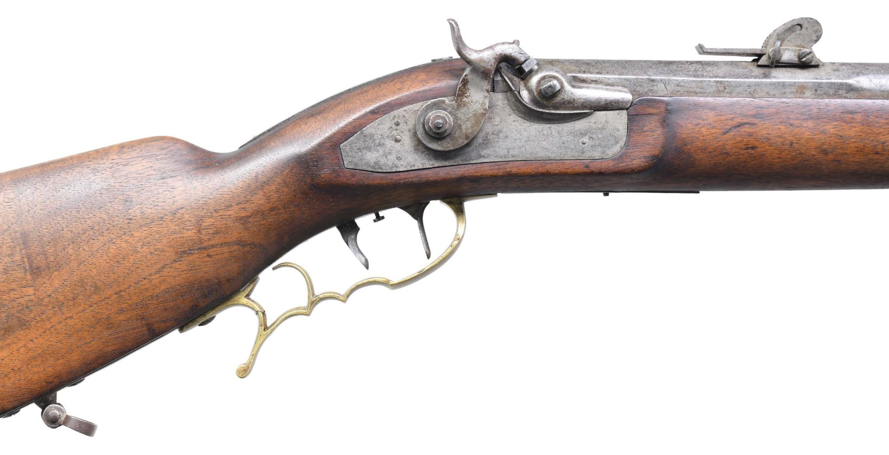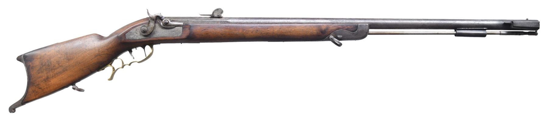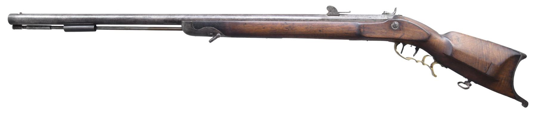 SHARPSHOOTERS RIFLE. Cal. 66. S# 1760. Bbl. 35 3/8". Swiss percussion musket subsequently converted to a Cantonal Sharpshooters rifle for the Luzern Canton. The faceted breech is marked "84" over the top flat, with "K (Luzern Canton shield insignia) L" above an encircled "Z" proof on the left quarter flat, as well as "1760" and a Belgian sole proof on the left flat. Model 1842 pattern lockplate is unmarked. Plain wood half-stock appears to have been sanded and reoiled at one time, and features a cheek rest, Schuetzen style buttplate, Schuetzen style trigger guard, and sling loops. Double set triggers. Blade front sight, with U-notch rear sight graduated "2", "4", "6", and "8". Underside of bbl. features a single ramrod ferrule, with a bayonet socket mounted on the right at the muzzle. CONDITION: metal components retain a gray patina, exhibiting scattered areas of darker age related discoloration, with varying degrees of pitting present overall. Brass trigger guard exhibits a mellow patina. Good bore, exhibiting dark pitting in the grooves, while retaining strong rifling throughout. Action and double set triggers function appropriately when cycled by hand. Stock shows some superficial marks from handling and storage, but otherwise remains sturdy and serviceable. (01-26196/MLW). ANTIQUE. $500-800.