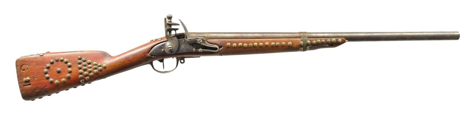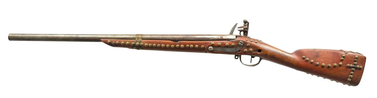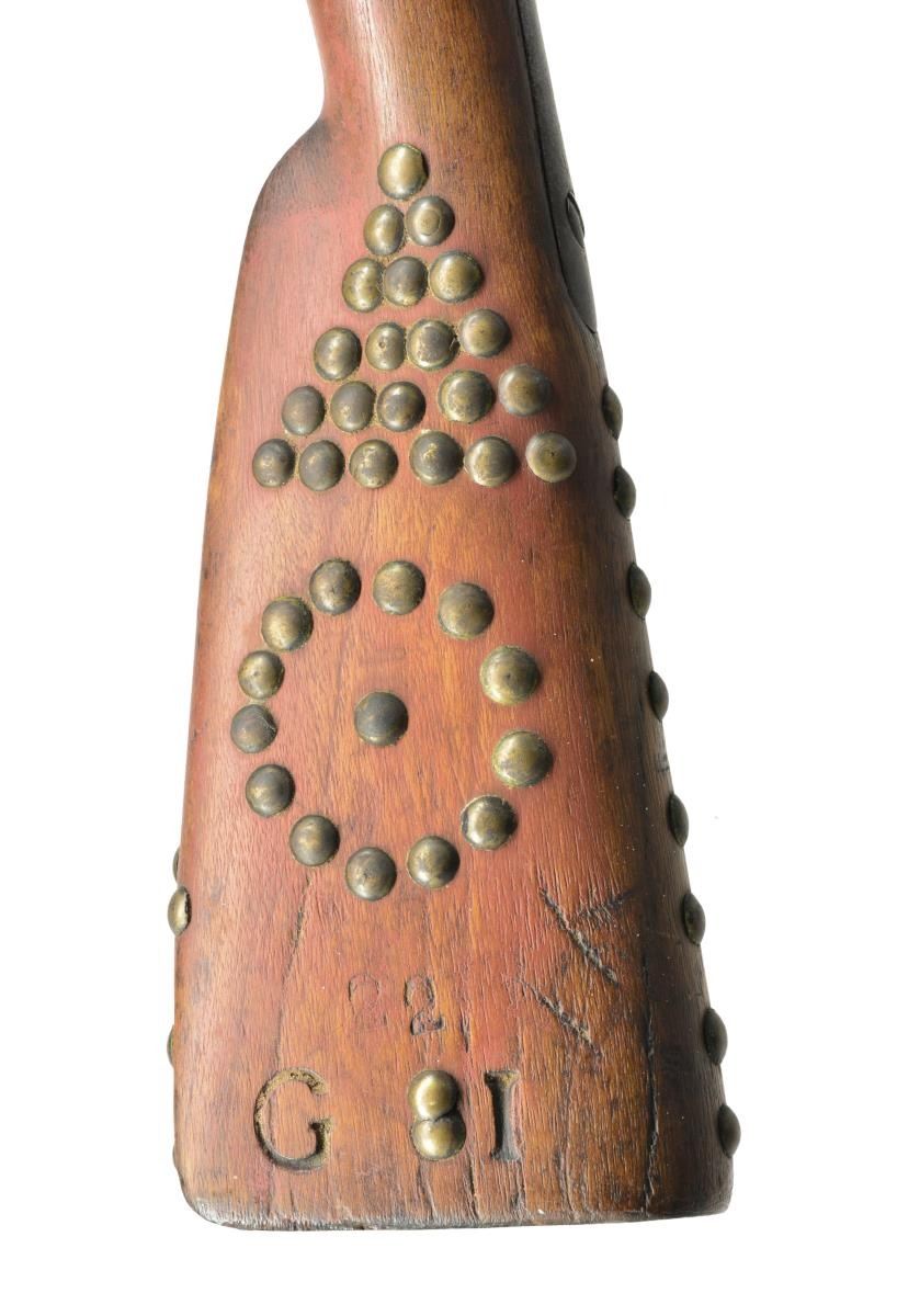 Cal. 69. NSN. 41" Overall. Bbl. 36" cut down. Appears made from late 1770s Charleville w/ buttplate removed & 140 tacks applied w/ a red ocher background to wood. Bbl. is held to stock by strands of copper wire. Interesting tack designs on buttstock, numerous guns of this genre, but this one has a good look for display. CONDITION: fair overall, iron has mottled gray patina w/ pitting. Mechanically functional but frizzen spring is weak. PROVENANCE: From the Collection of John "Tim" Breth Jr. (01-17765/JS). ANTIQUE. $2,000-3,000.