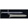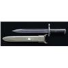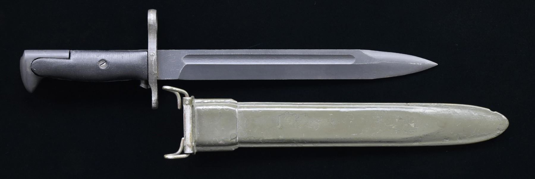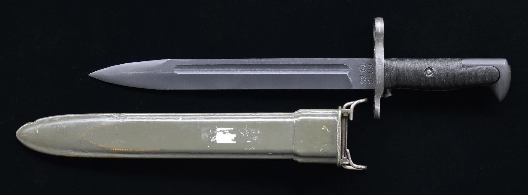 Parkerized Taiwanese-made M1 bayonet with scabbard for the Garand and 1903 rifles. Blade marked "6-60" and "KS." Grooved, black handles. Green-painted scabbard. CONDITION: grip panels show some dings, chips, and handling wear. Parkerized parts show scattered edge wear and some light oxidation. Scabbard has a green-repainted finish with some sticker remnants, scattered flaking, a few chips, and some handling marks. (02-23459/MJC). $50-75.