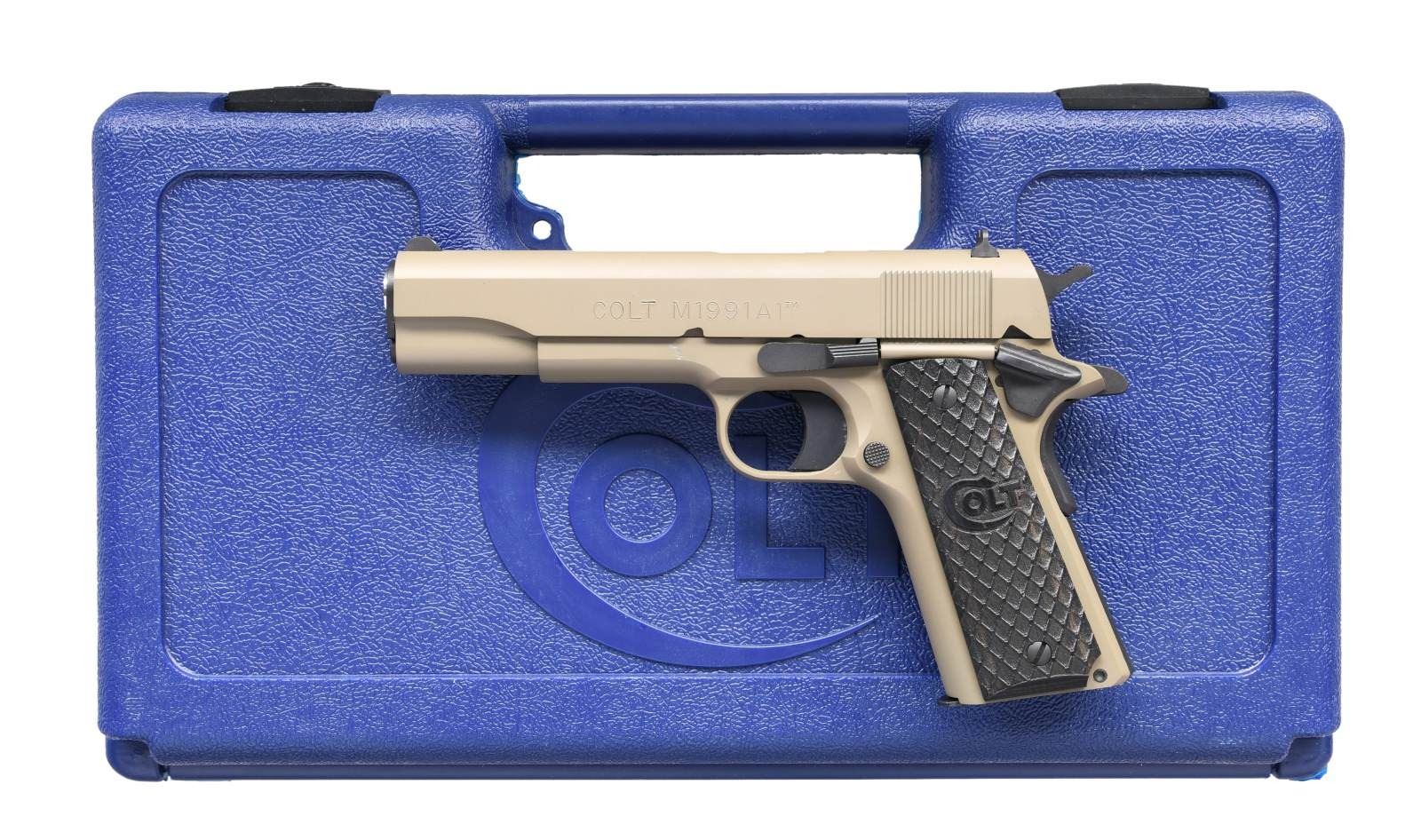 PISTOL. Cal. 45 ACP. S# 2931753. Limited Edition with a flat, dark earth finish. 5" Barrel. Three white dot sights. Special Hex Colt Serpentine grips. MAGS: 1–7 rd. UNATTACHED ACCESSORIES: matching-numbered case with lock and paperwork. CONDITION: near excellent finish and grips, with one mark on the left side frame. Near-excellent bore. (23-6949/MD). MODERN. $1,400-1,800.
