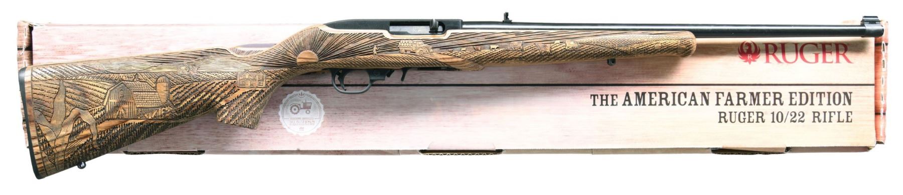 WITH MATCHING FACTORY BOX. Cal. 22 LR. S# ATF-00159 (2015). Limited American Farmer Edition approx. 3,300 for Talo Distributors; Ruger Model 11190. Bbl. 20", with standard sights. Laminated wood stock with a high-figured, laser-carved farmland scene. MAGS: one 10-rd. UNATTACHED ACCESSORIES: box containing lock, rail, and paperwork. CONDITION: all aspects are near excellent, including bore. (24-2793/MD). MODERN. $300-500.