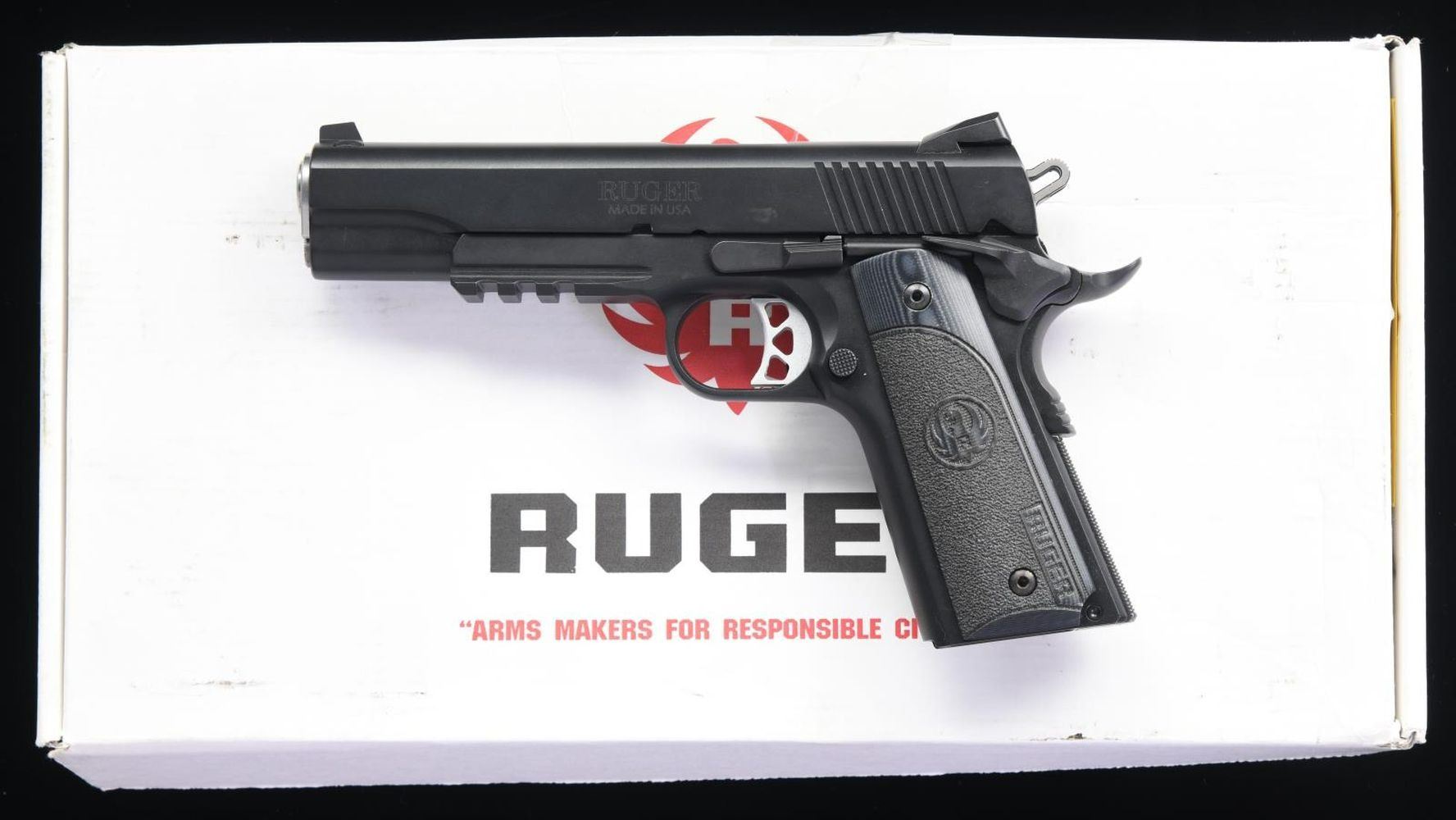 Cal. 45 ACP. S# 672-05687. Bbl. 5". Three dot Novak sights. Talo edition Ruger SR1911 w/ frame mounted picatinny half length rail. Matte black finish. Extended right hand safety. Extended beavertail grip safety. G10 grips w/ Ruger logo. MAGS: 1-7 rd. & 1-8 rd. factory. Total of 2. UNATTACHED ACCESSORIES: matching numbered factory box w/ softcase, manual & cable lock. CONDITION: all aspects near excellent. (23-6883/MJC). MODERN. $900-1200.