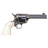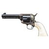 SINGLE ACTION ARMY REVOLVER. Cal. 45 Colt. S# 338911. Bbl. 4 3/4". First Generation Single Action Army revolver mfg. by Colt in 1920. Left side of the bbl. is marked "45 COLT", with Colt's 2-line address marked across the top. Left side of the frame is hand engraved with Colt's 2-line patent information. Sides of frame exhibit professionally executed bordered vine type scrollwork on a hatched background, with a starburst motif also engraved on the right. Matching pattern scrollwork extends to the sides of the trigger guard and rear grip strap. Frame, loading gate, and hammer exhibit a reapplied case colored finish. Frame screws, rear grip strap screws, and trigger exhibit a reheated nitre blue finish. Apparent contemporary replacement bbl., ejector rod assembly, cyl., trigger guard, and rear grip strap exhibit a blue finish. Frame is mounted with a 1-piece custom pearl grip. Standard SAA pattern blade front sight and frame notched rear sight. Trigger guard and rear grip strap have been renumbered to match, with the S# applied on the left, beneath the grip panel. UNATTACHED ACCESSORIES: plain cardboard box with mostly illegible Colt end label. CONDITION: frame, loading gate, and hammer retain the vast majority of their vibrant reapplied case colored finish, showing a few small spots of discoloration on the recoil shield. Blue parts retain the majority of their finish, showing some scattered spots of light surface oxidation, as well as some small scattered spots of flaking (predominately on the cyl. and let forward edge of the bbl.). Near mirror bore, exhibiting some very light pitting, with a small spot of mild pitting present towards the muzzle. Proper manual mechanics, with tight lock up. Grip shows some light superficial handling marks, with cracking present on the butt on either side at the grip strap. Box remains sound, with end label showing numerous losses. (25-1250/MLW). CURIO. $3,000-4,000.