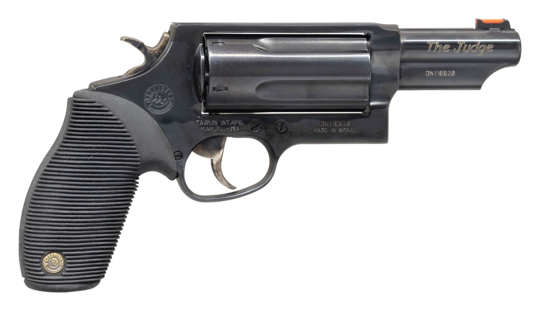 Cal. .410 3"/45 Colt. S# DN116928. Bbl. 3". Fiber optic front sight. Fixed rear sight. 5-shot cyl. Blued finish with case colored hammer & trigger. Grooved black rubber grips with Taurus medallions. UNATTACHED ACCESSORIES: matching numbered factory box with keys for internal locking system. CONDITION: metal & grips show light handling & usage wear. Action functions properly when hand cycled. Bright near excellent bore. (25-6219/MJC). MODERN. $300-500. `