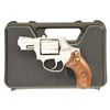 Cal. 38 Spl. S# MF37498. Bbl. 2". Serrated ramped blade front sight. Fixed rear sight. Bright stainless finish. Smooth hardwood grips w/ Taurus medallions. UNATTACHED ACCESSORIES: aftermarket black hardcase. CONDITION: grips show notable flaking, scratches & handling wear. Metal shows scattered scratches & handling wear. Very good bright bore. (23-5226/MJC). MODERN. $300-450.
